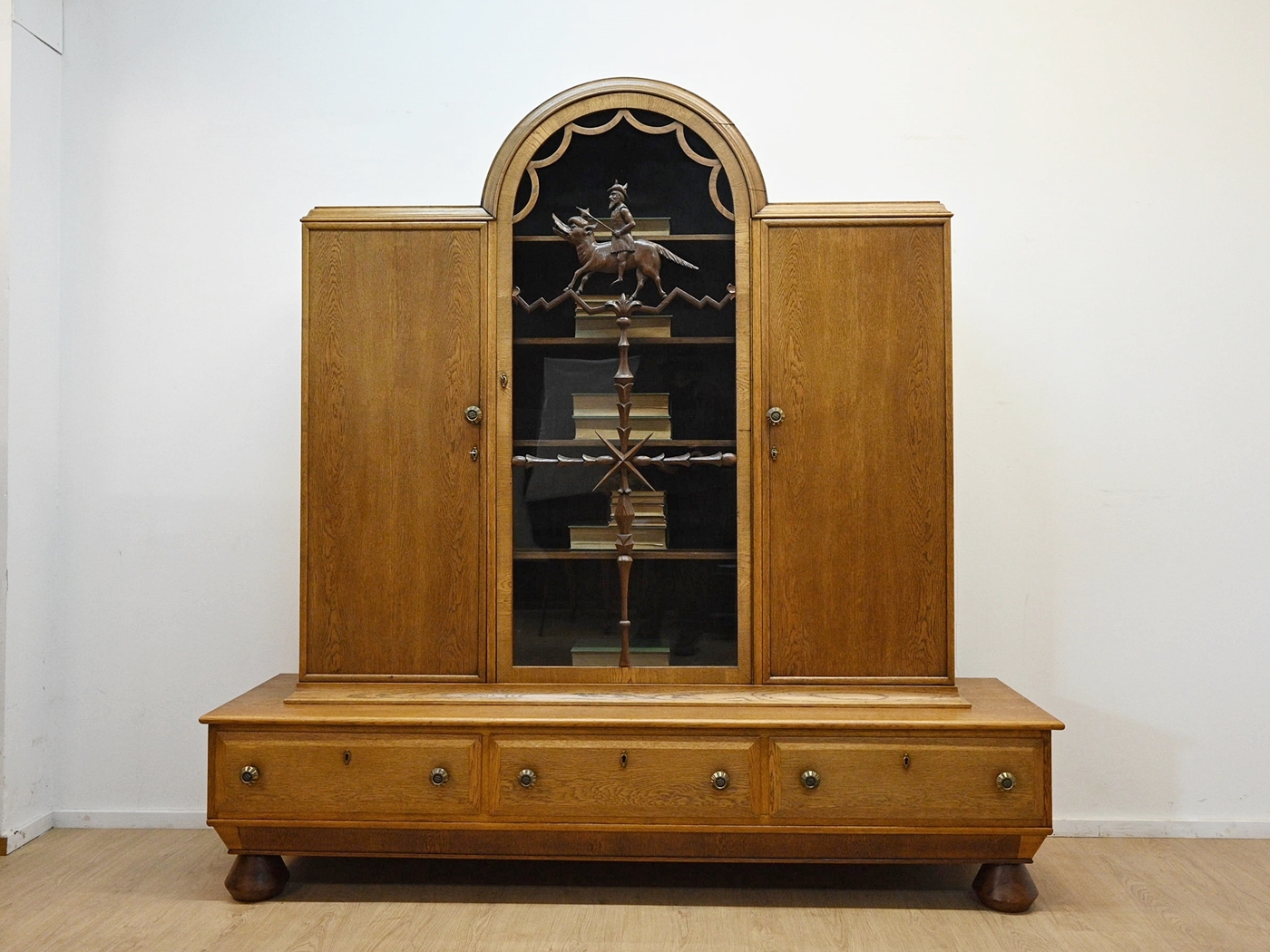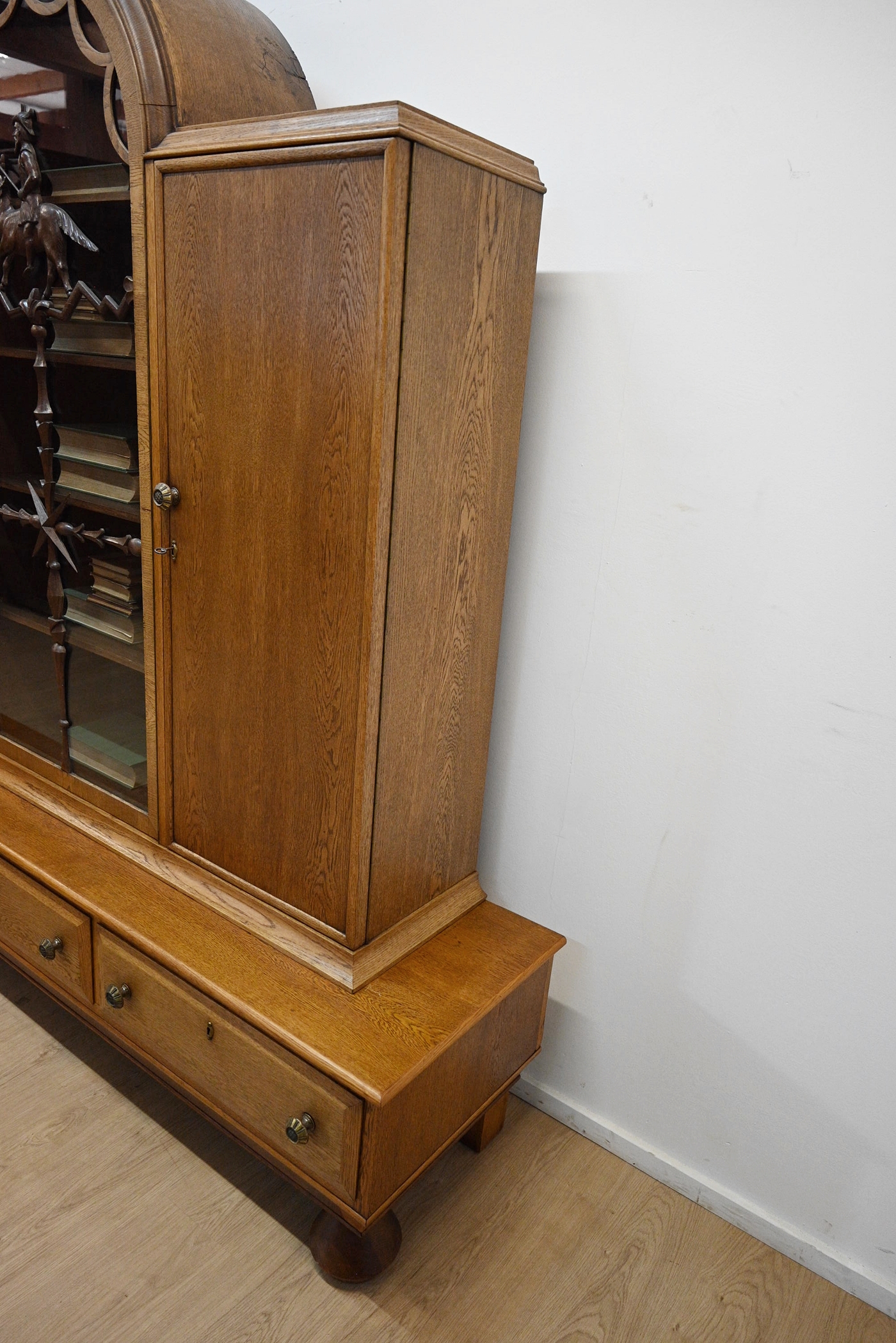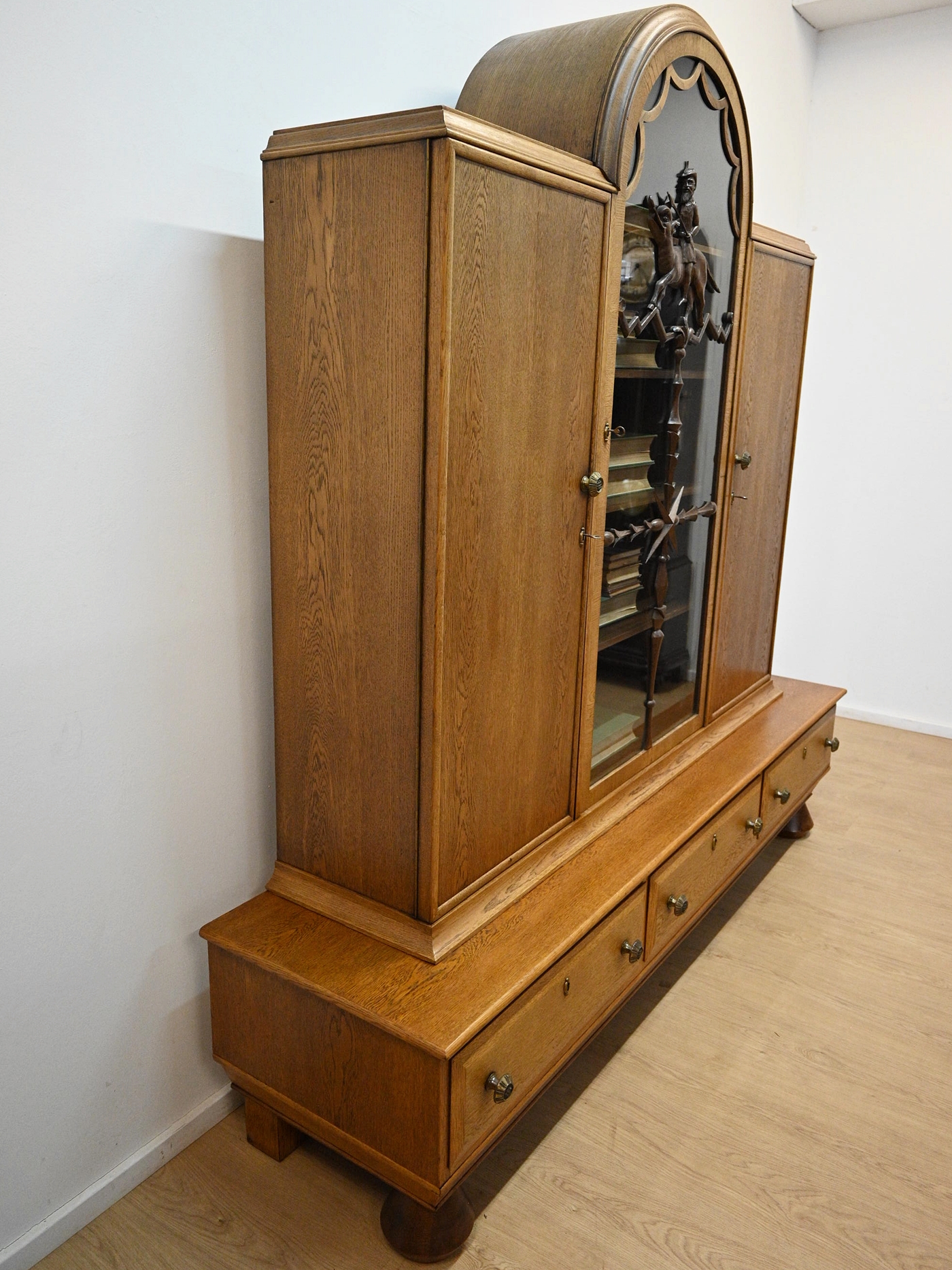 Stan dobry. Mebel przygotowany do użytkowania. Odświeżone zostały powierzchnie zewnętrzne jak i środek mebla. Mebel ma już swoje lata i ślady minionego czasu, które nie wpływają na jego odbiór estetyczny, są świadectwem autentyczności mebla. Bibliotekę od razu można wstawić do mieszkania.