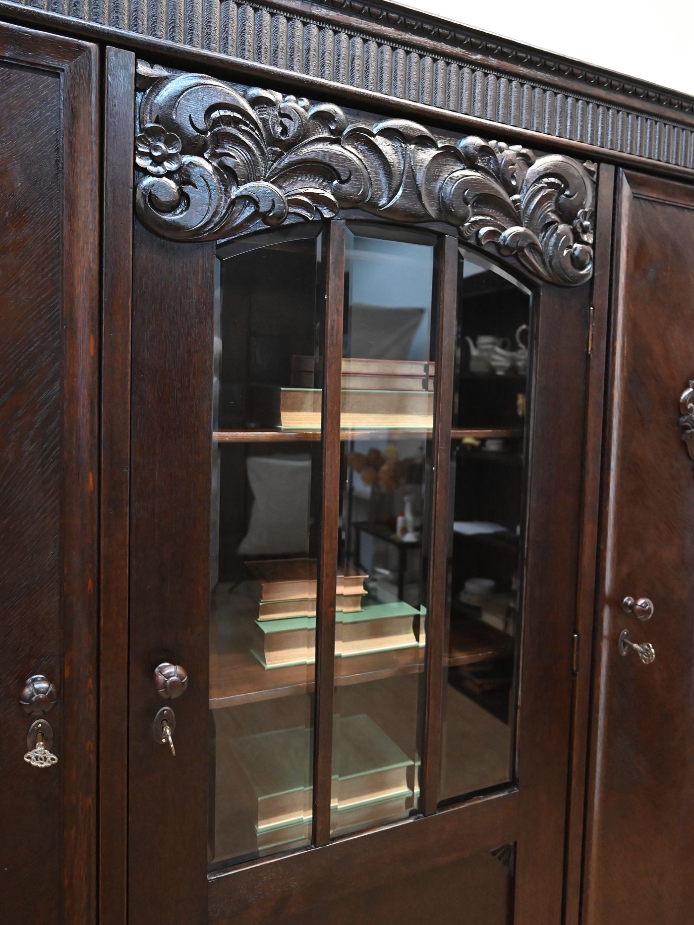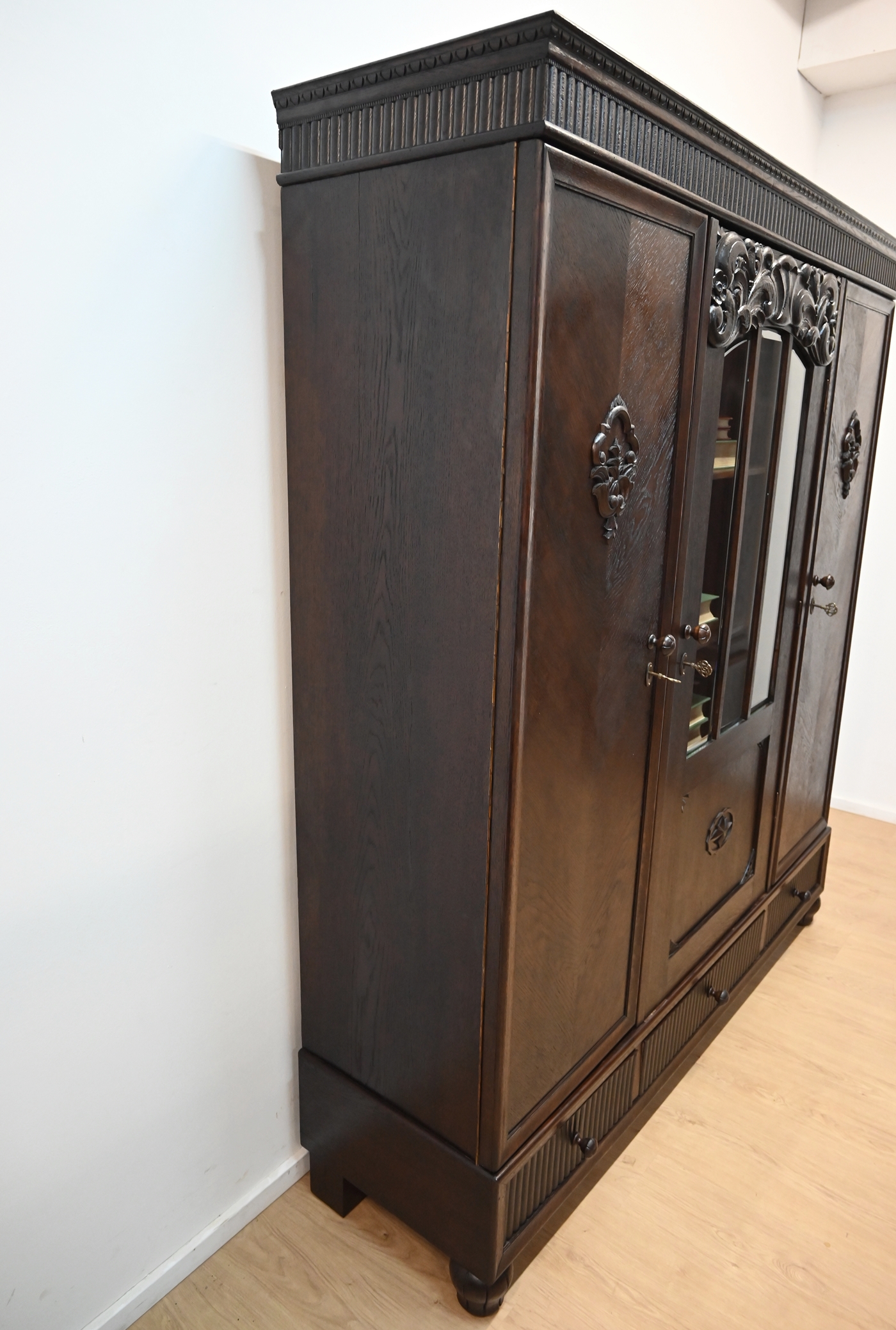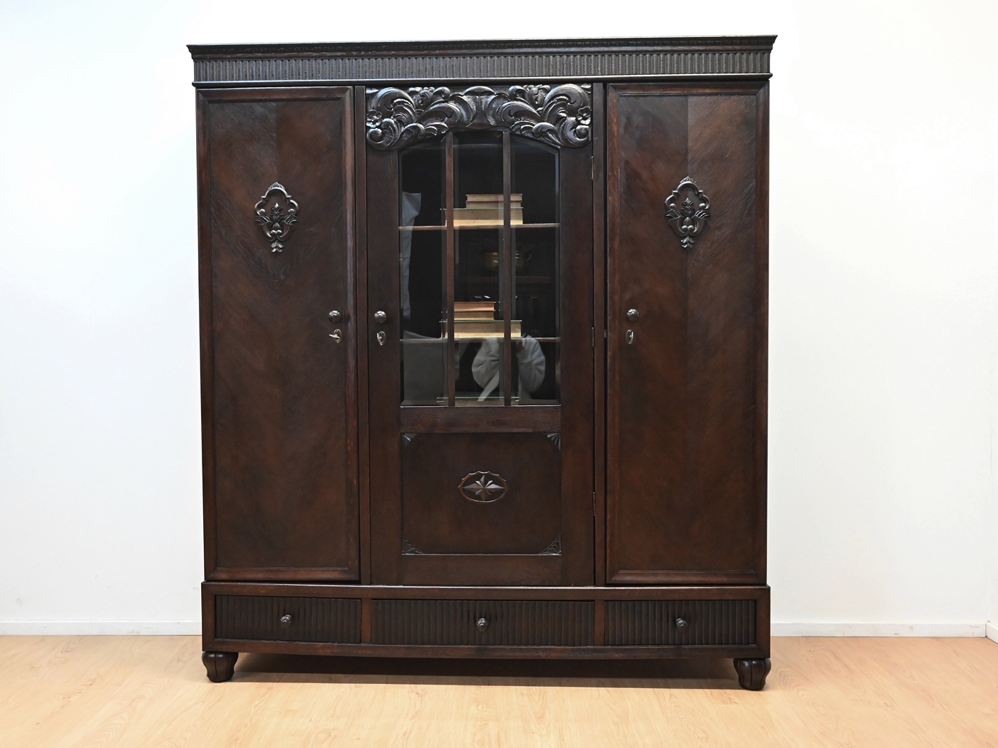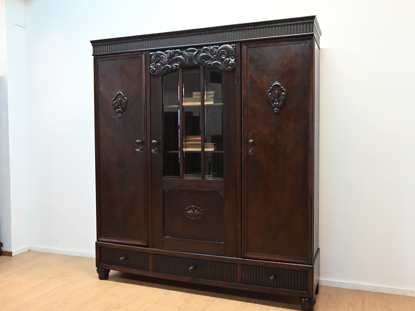 Stan dobry. Mebel przygotowany do użytkowania. Odświeżone zostały powierzchnie zewnętrzne jak i środek mebla. Mebel ma już swoje lata i ślady minionego czasu, które nie wpływają na jego odbiór estetyczny, są świadectwem autentyczności mebla. Bibliotekę od razu można wstawić do mieszkania.