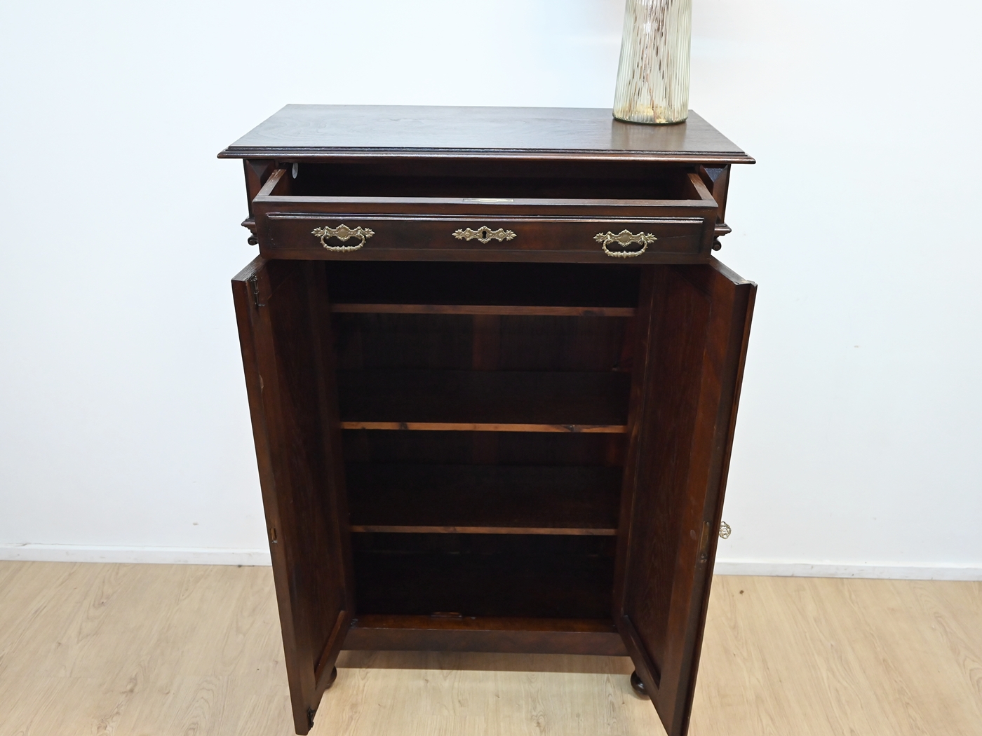 Wykonany jest w całości z drewna, fornirowany orzechem.