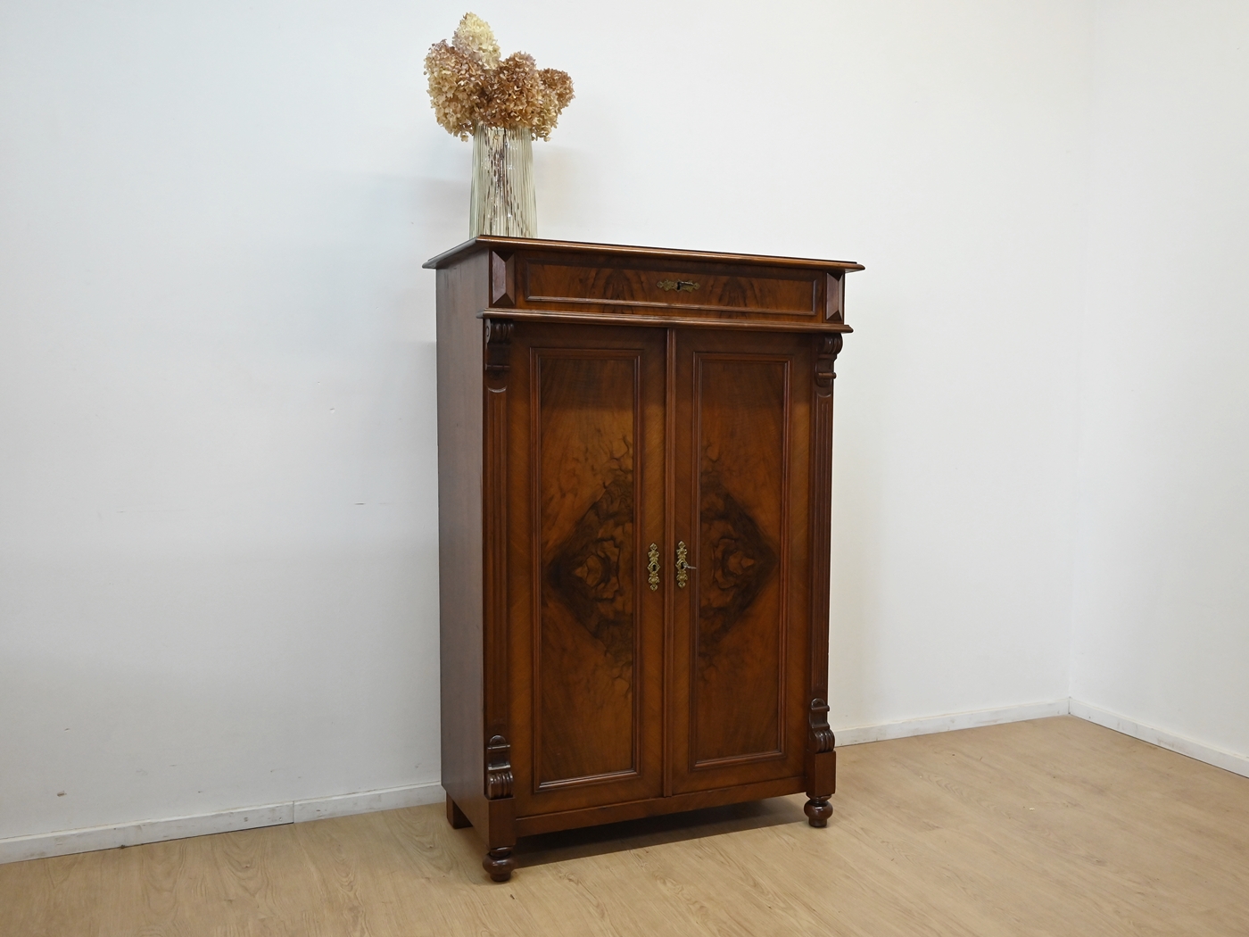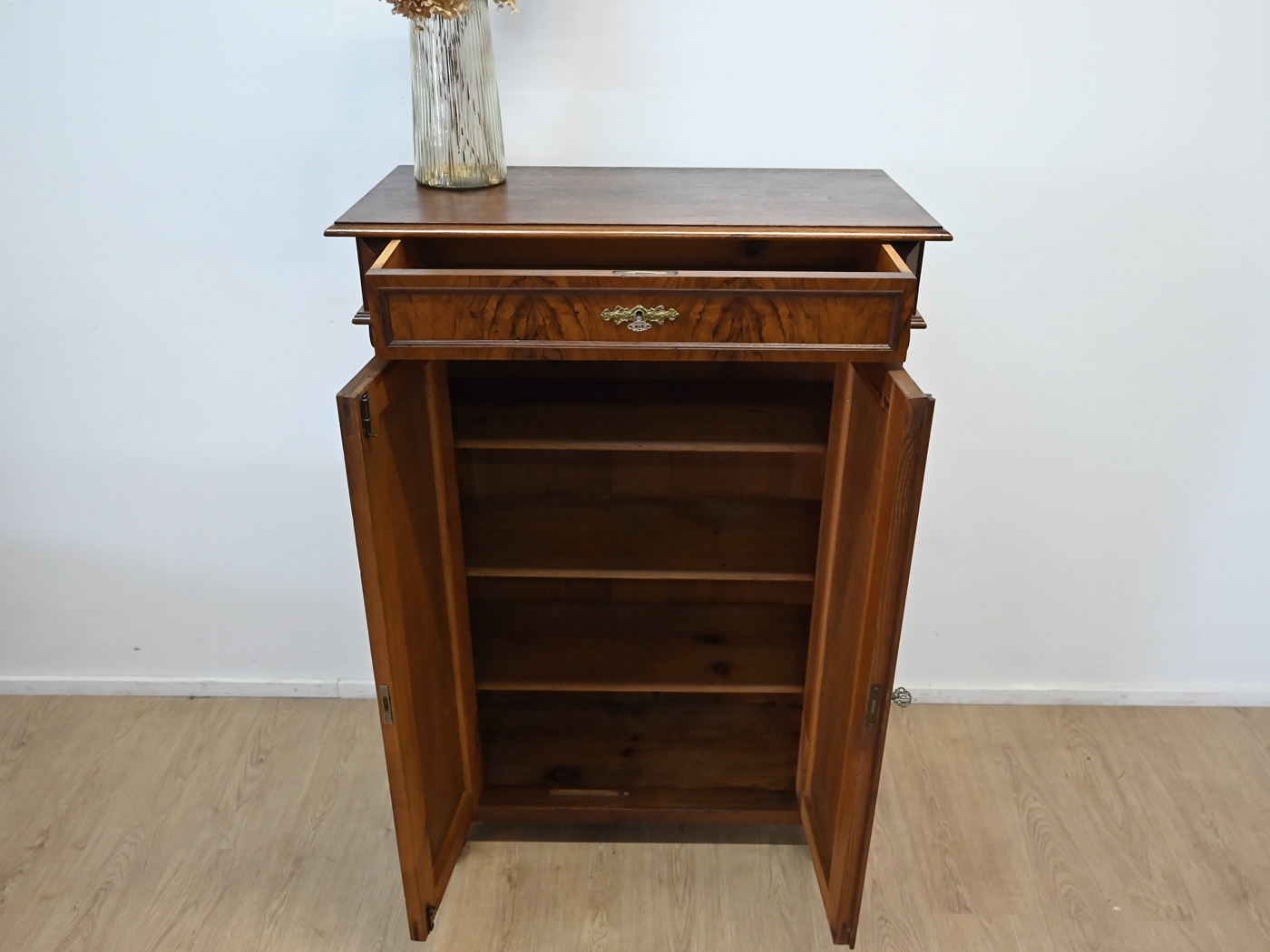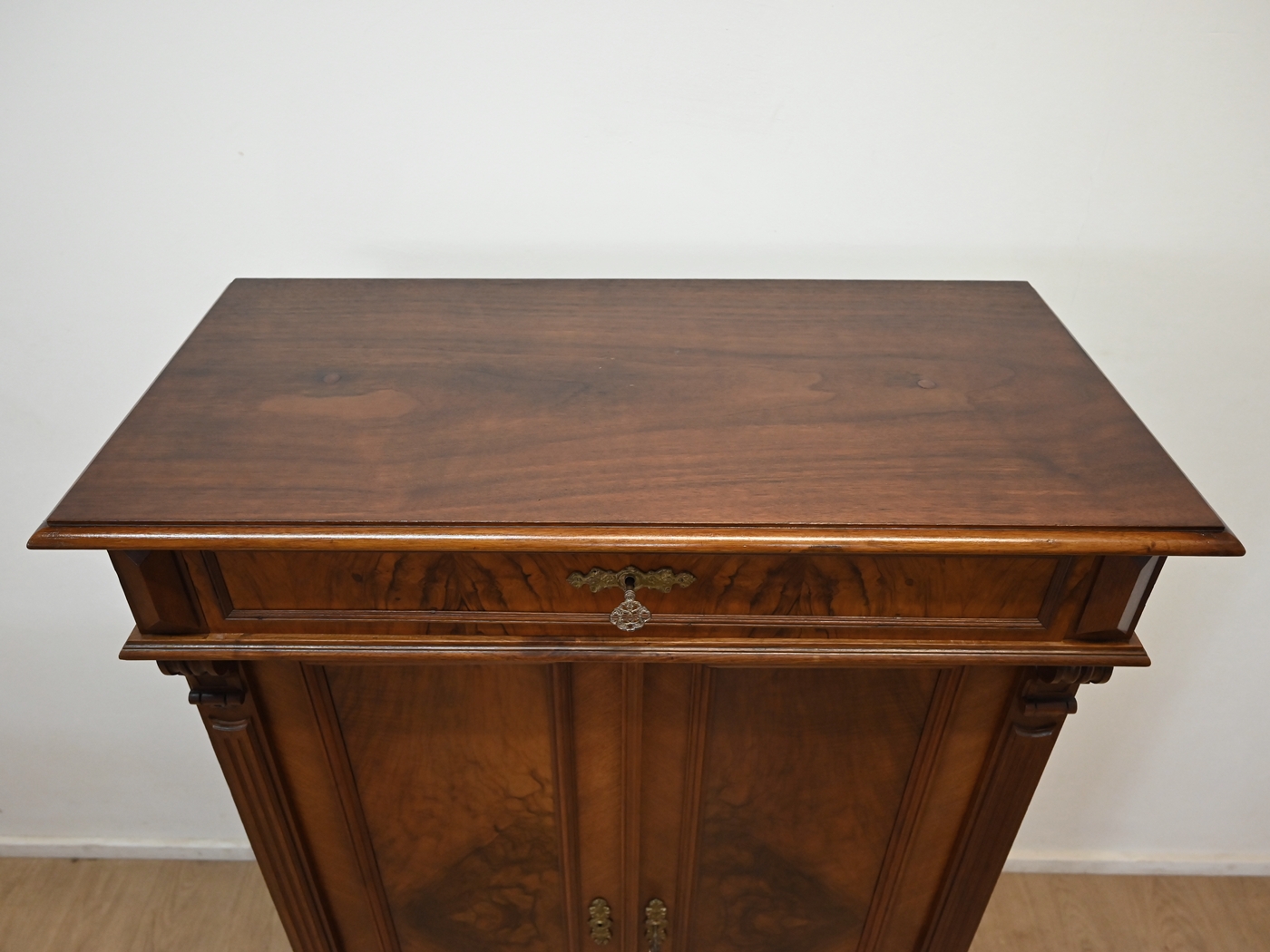 Wykonany jest w całości z drewna, fornirowany orzechem.