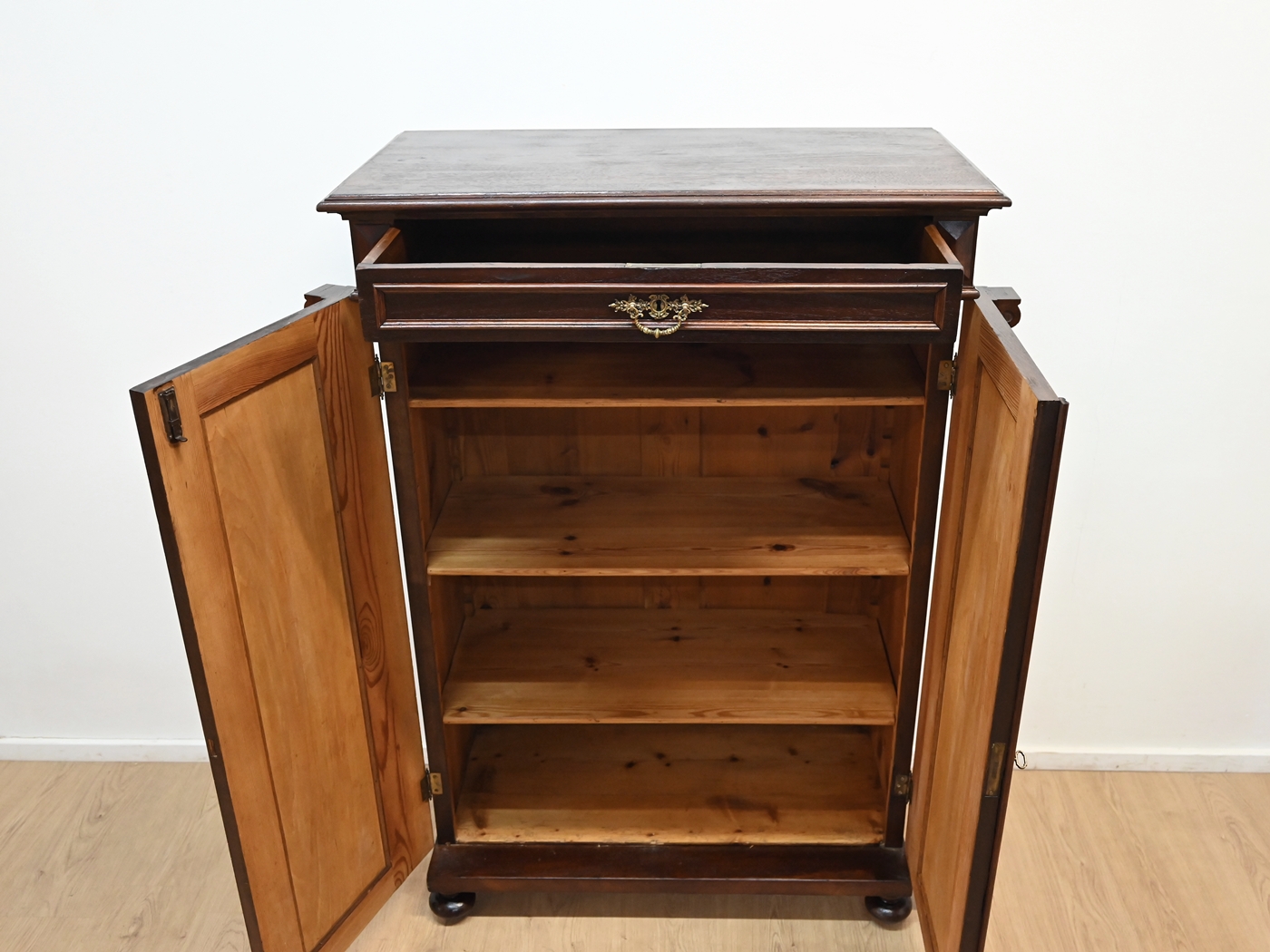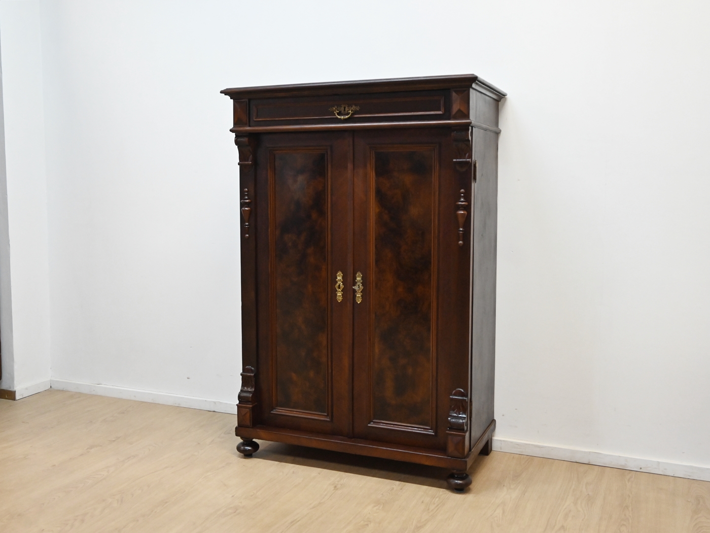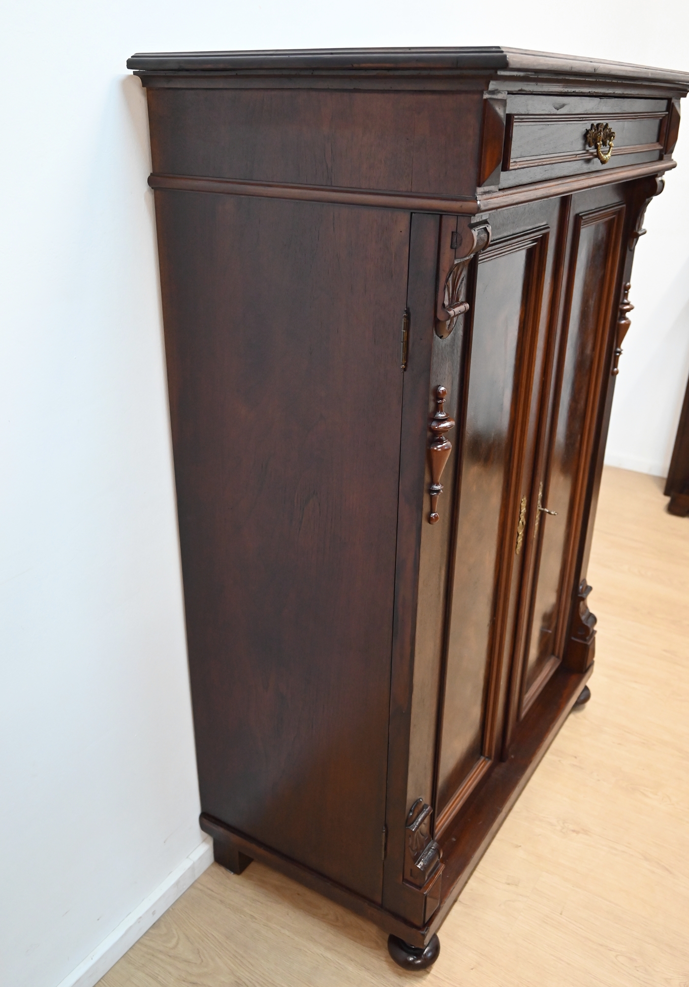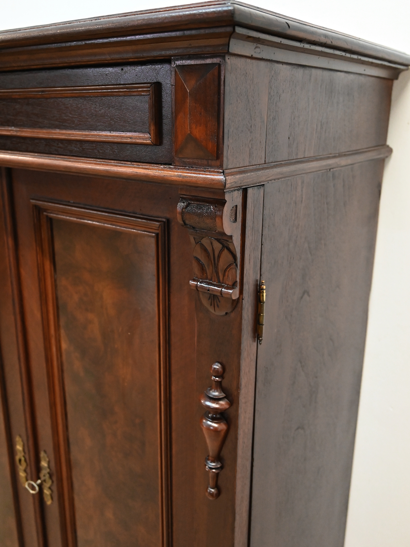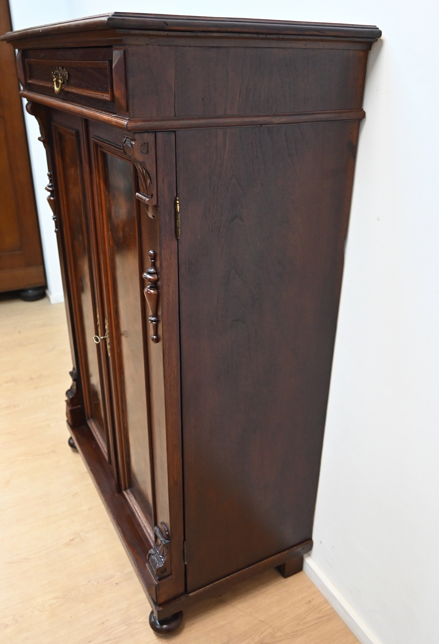 Wykonany jest w całości z drewna, fornirowany orzechem.