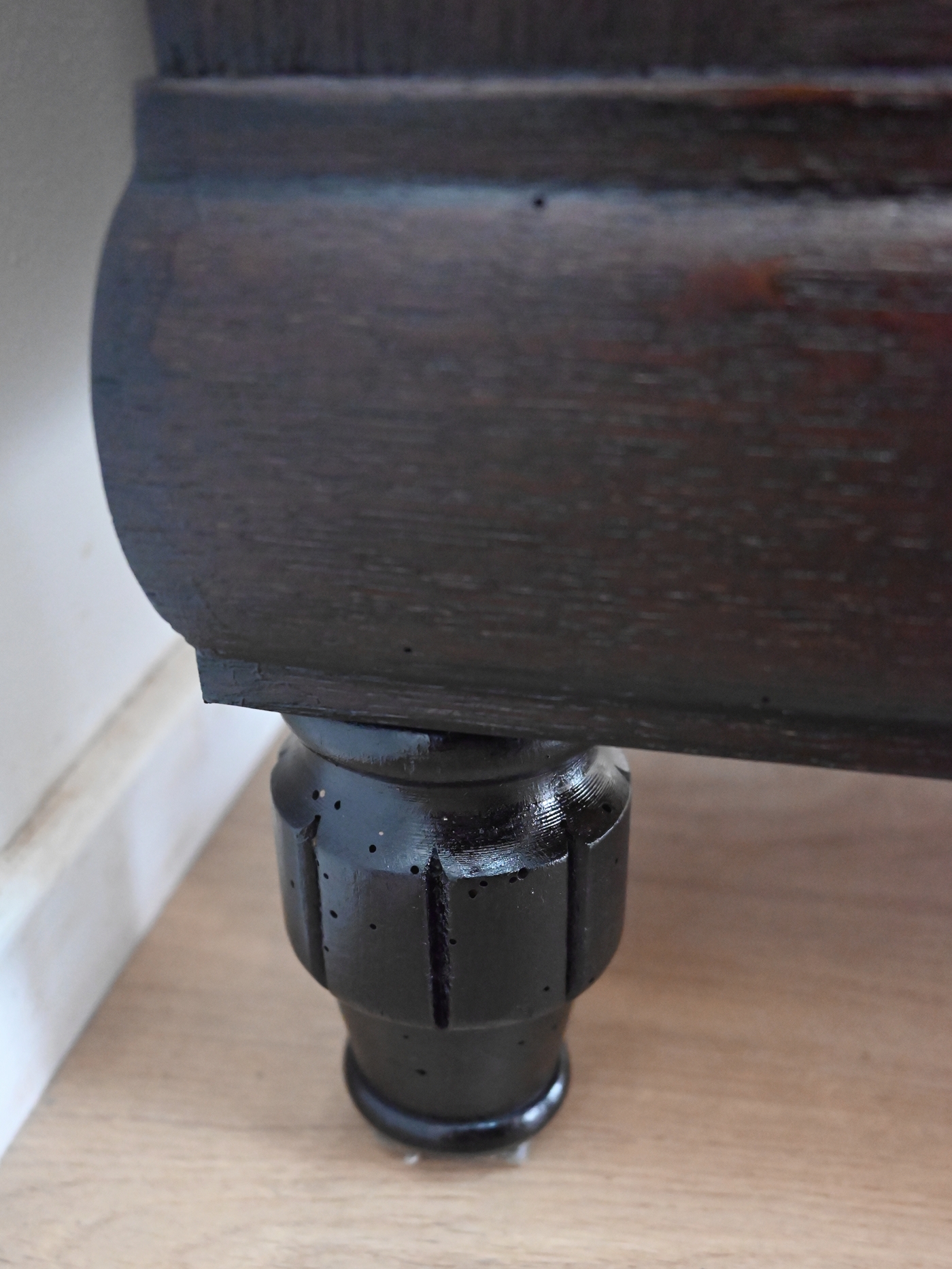 Ślady po kornikach. Mebel zaimpregnowany preparatem przeciw kornikom. Brak aktywnego kornika.