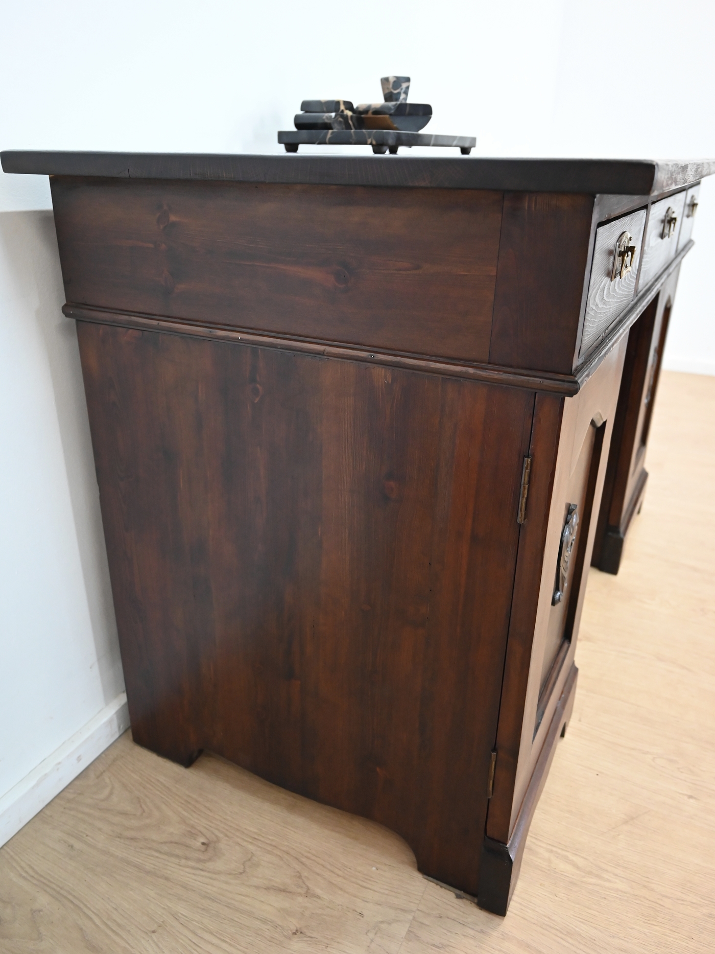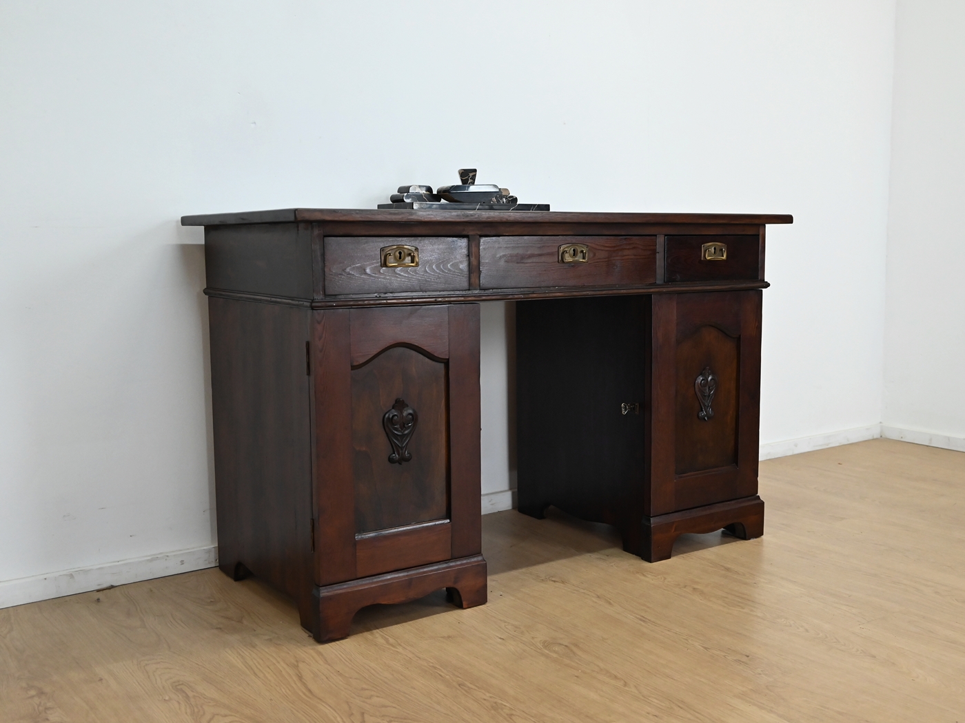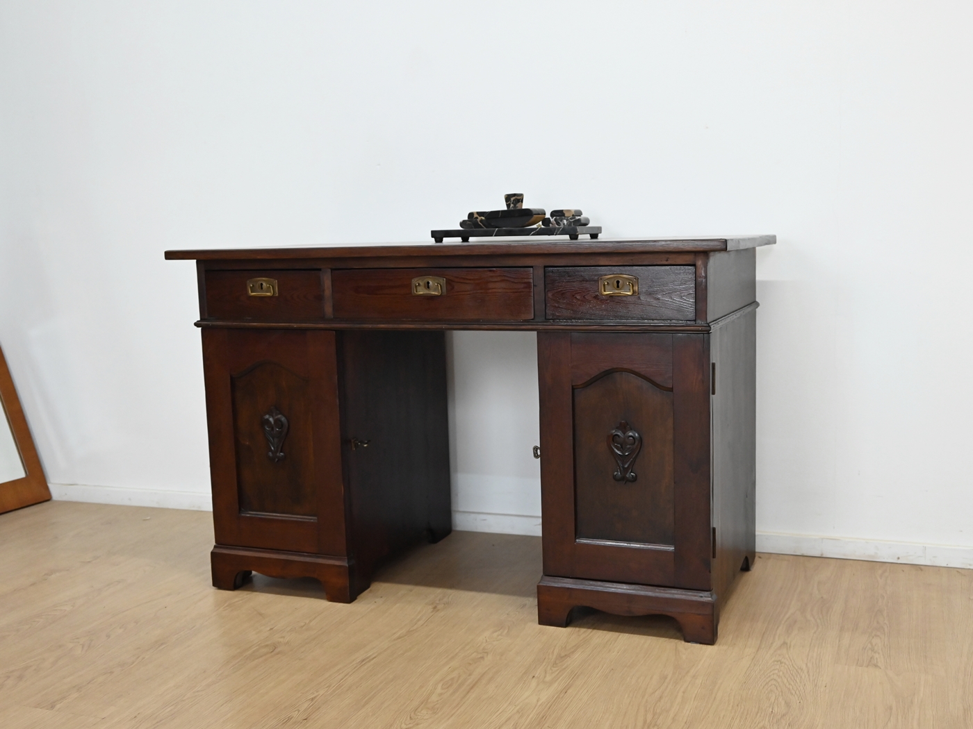 Stan dobry. Mebel przygotowany do użytkowania. Odświeżone zostały powierzchnie zewnętrzne jak i środek mebla. Mebel ma już swoje lata i ślady minionego czasu, które nie wpływają na jego odbiór estetyczny, są świadectwem autentyczności mebla. Biurko od razu można wstawić do mieszkania.