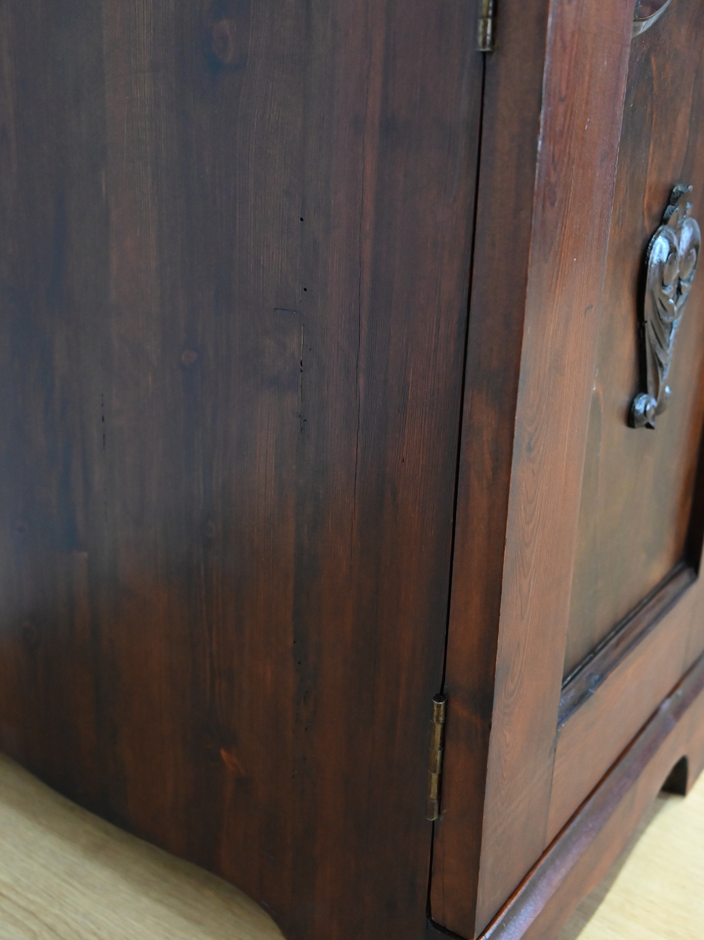 Ślady po kornikach. Mebel zaimpregnowany preparatem przeciw kornikom. Brak aktywnego kornika.