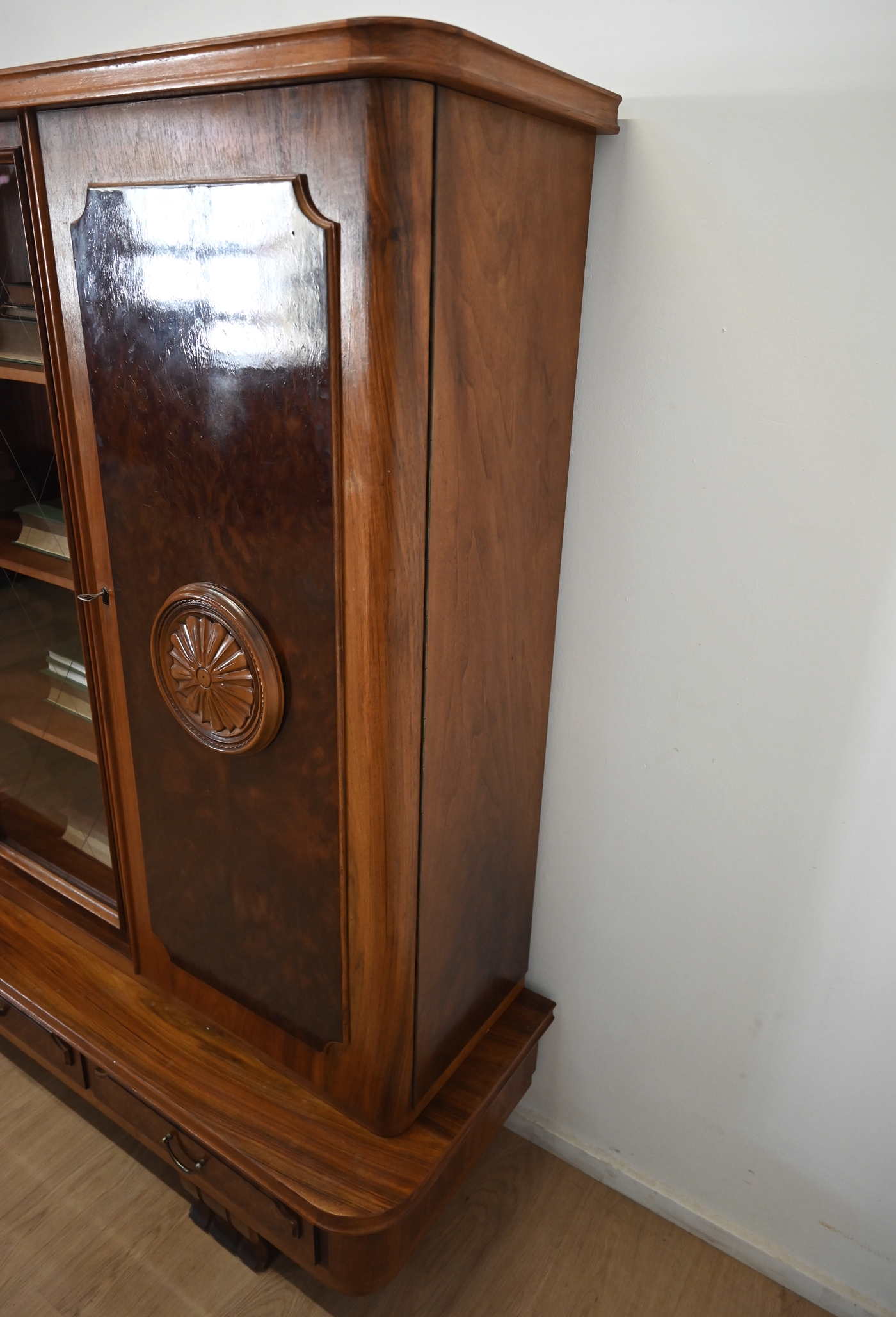 Wykonany jest w całości z drewna, fornirowany orzechem.