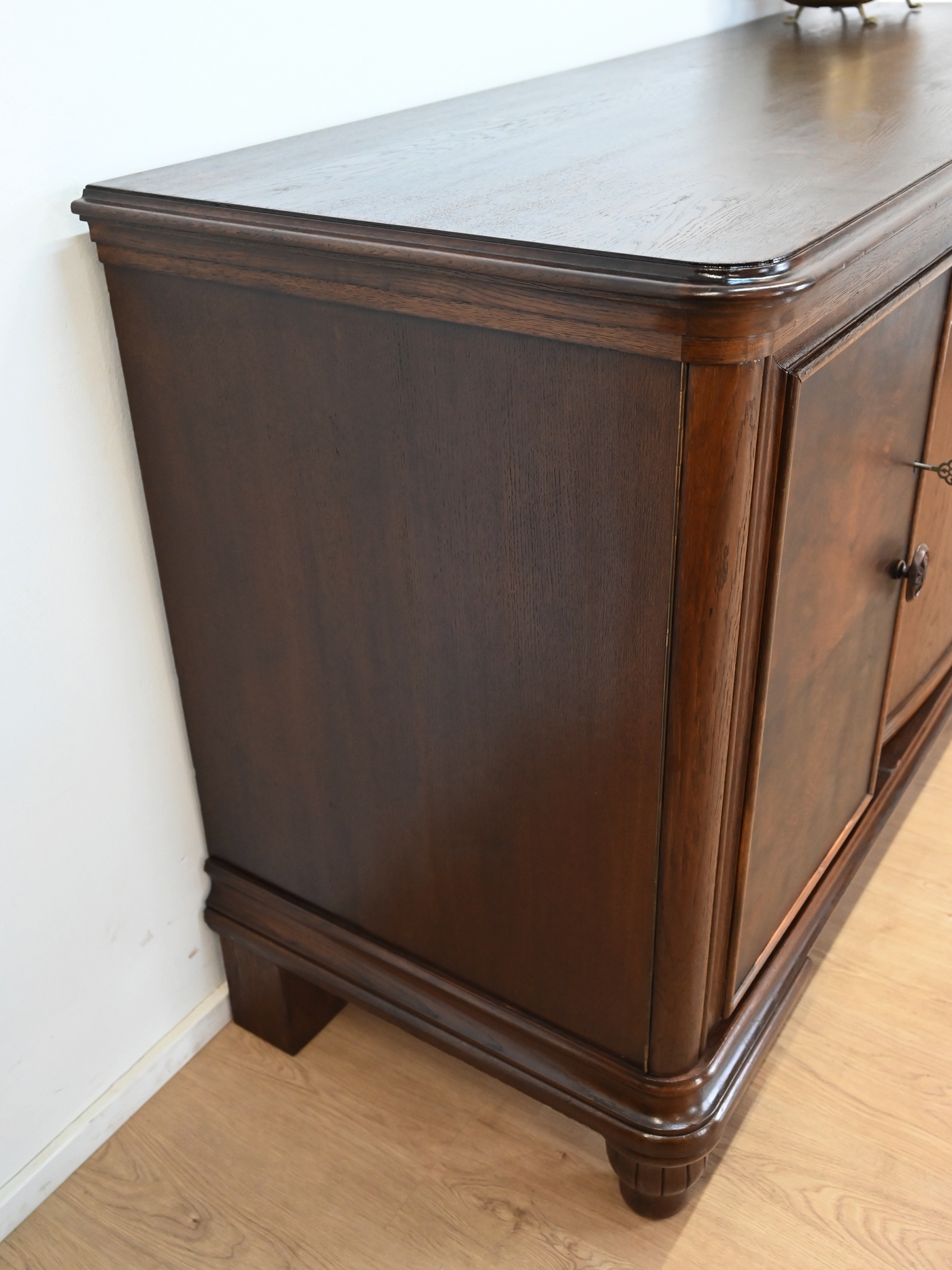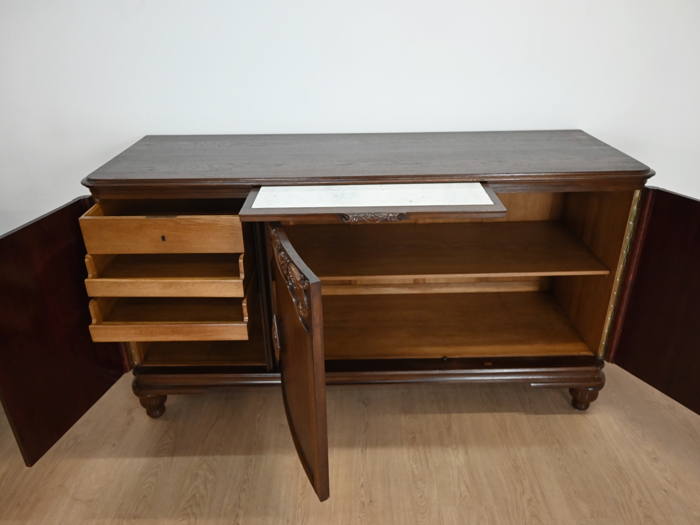Wykończony jest politurą szelakową w półmacie.