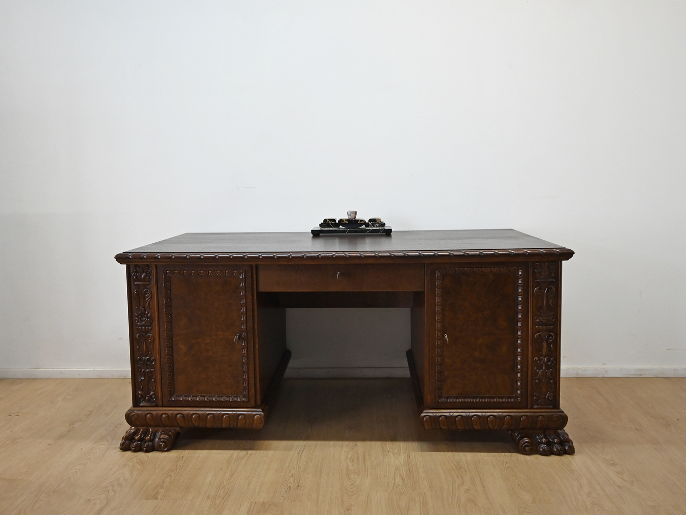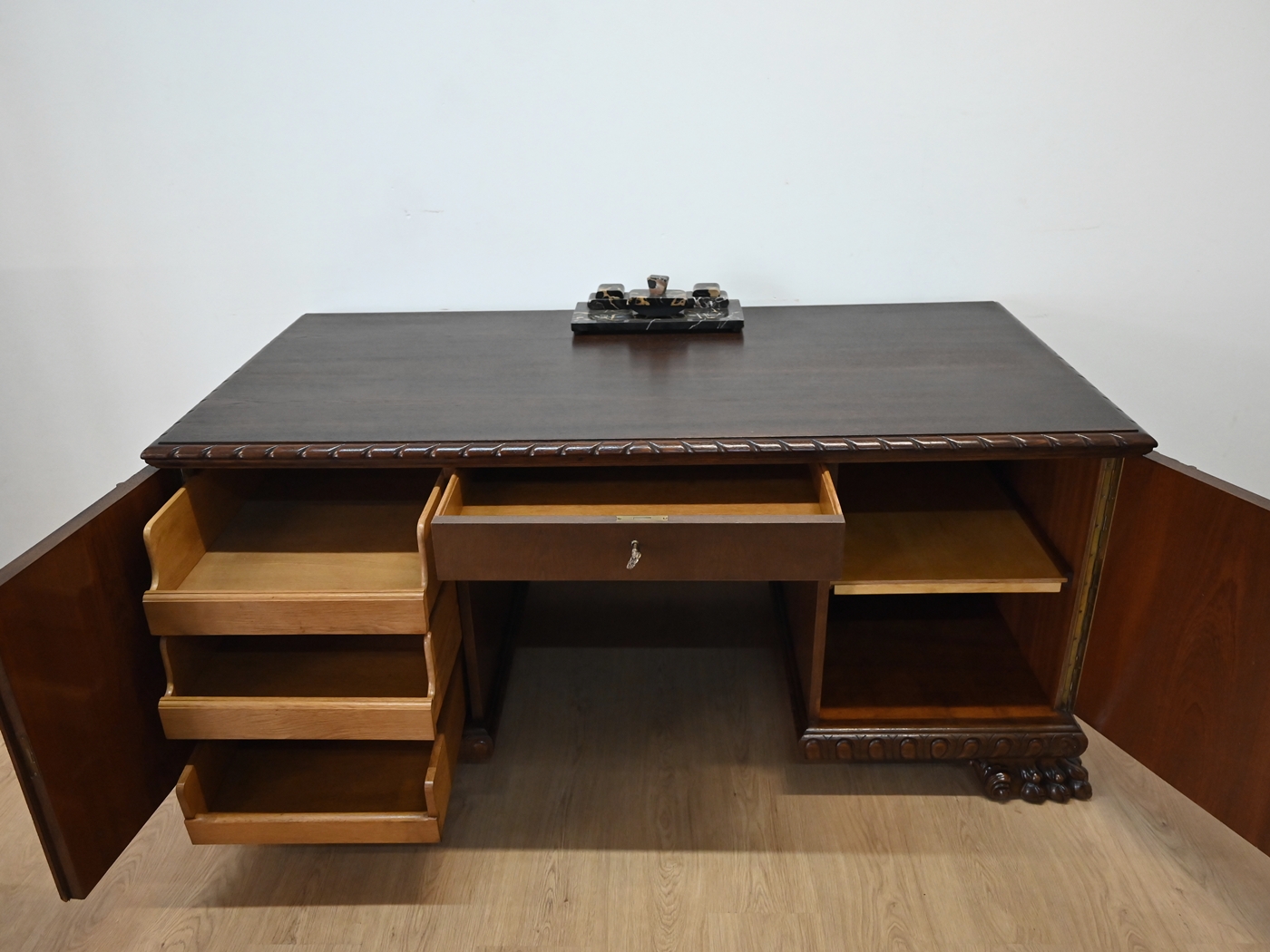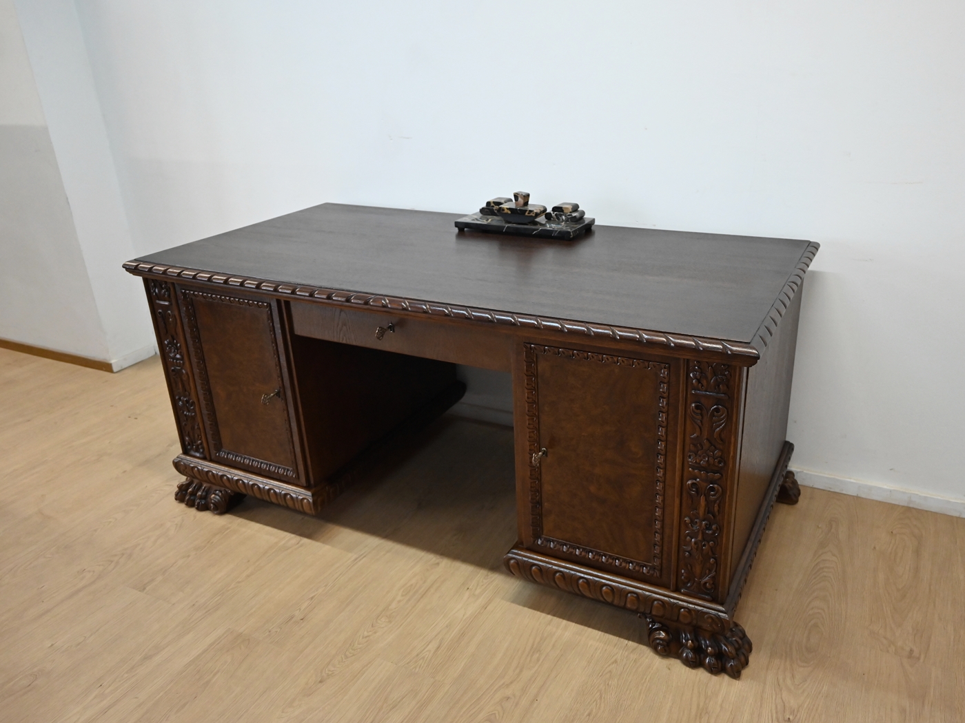 Stan bardzo dobry. Mebel przygotowany do użytkowania. Odświeżone zostały powierzchnie zewnętrzne jak i środek mebla. Mebel ma już swoje lata i ślady minionego czasu, które nie wpływają na jego odbiór estetyczny, są świadectwem autentyczności mebla. Biurko od razu można wstawić do mieszkania.