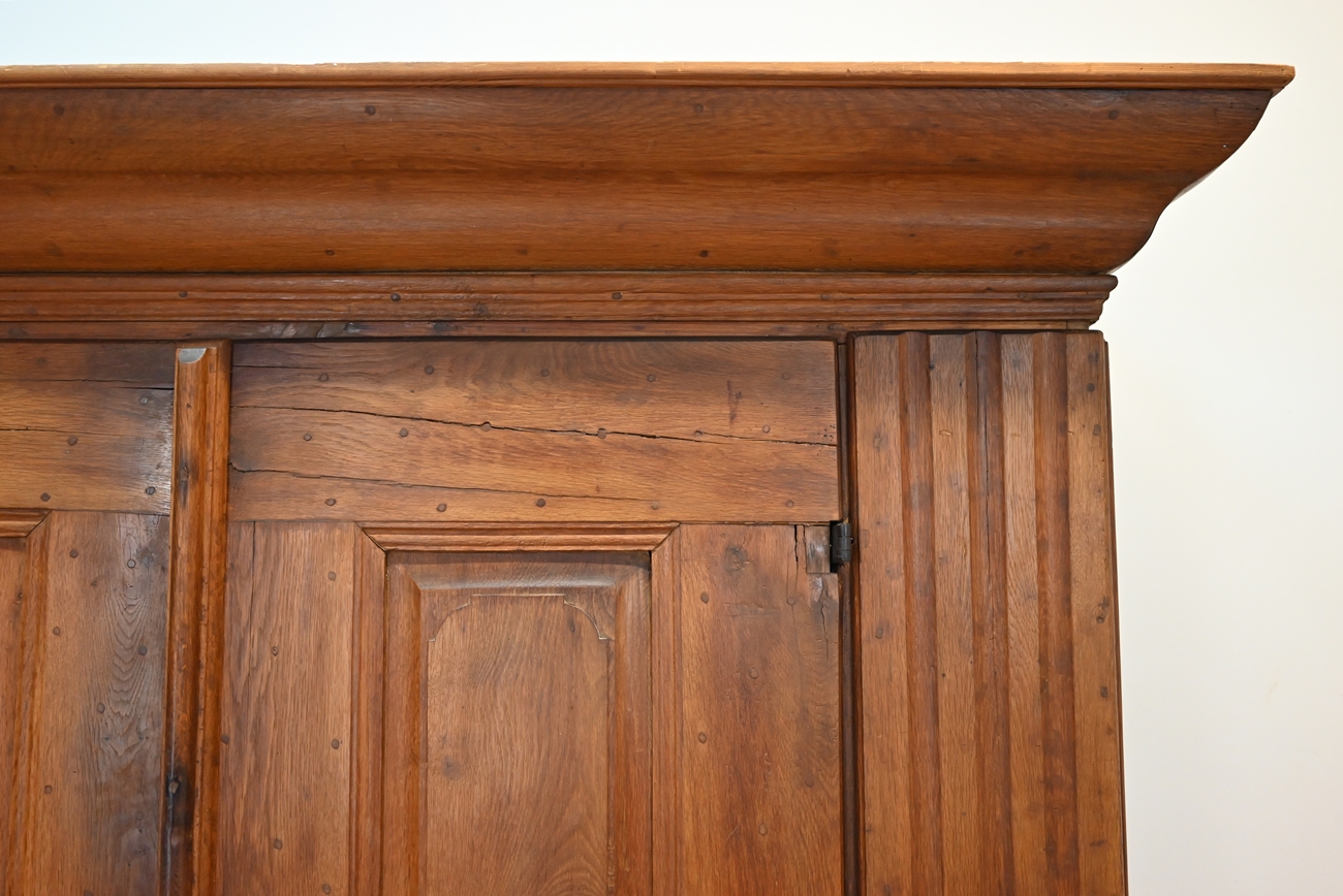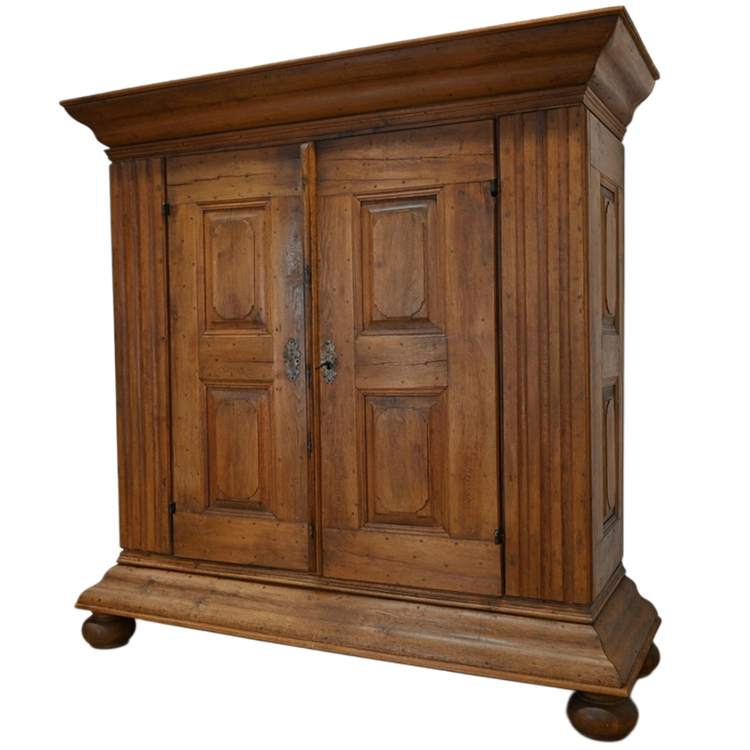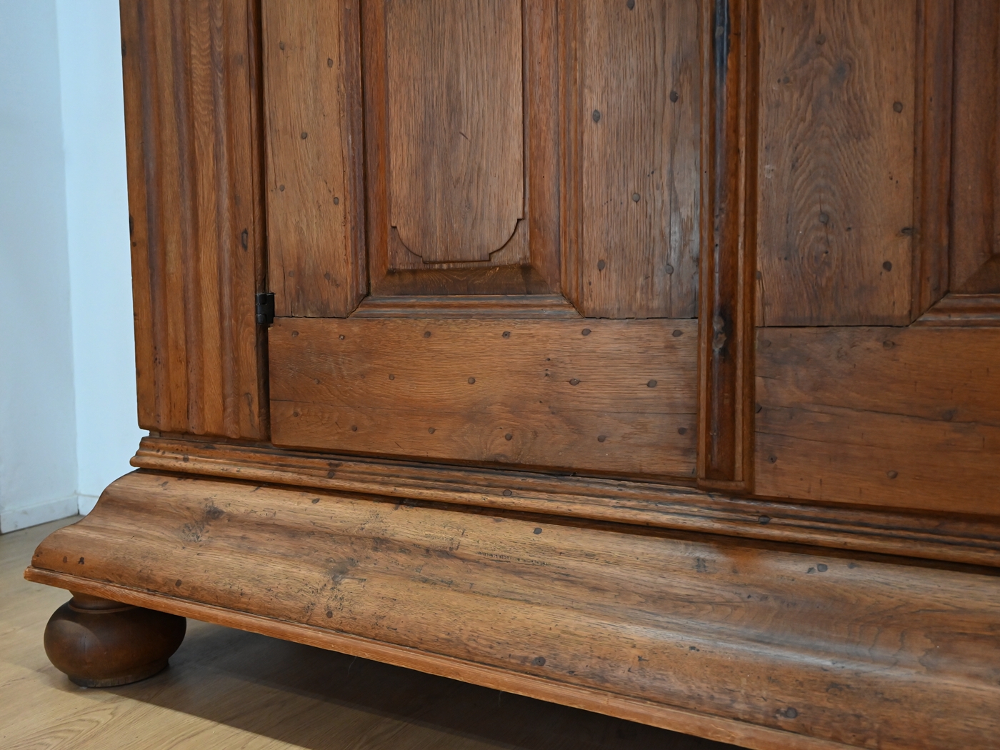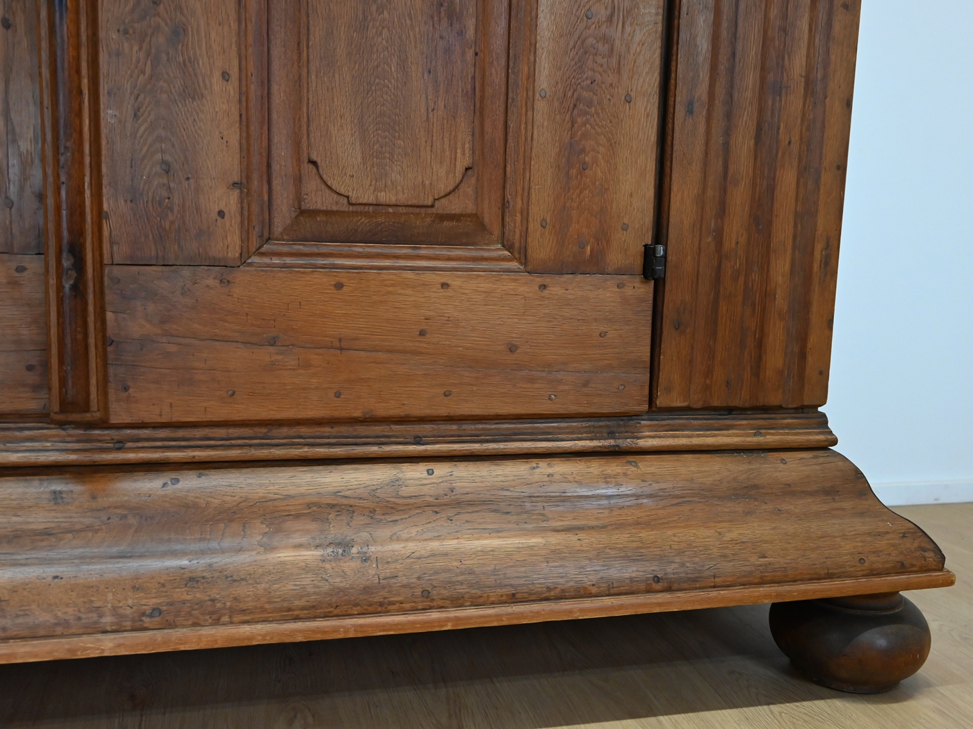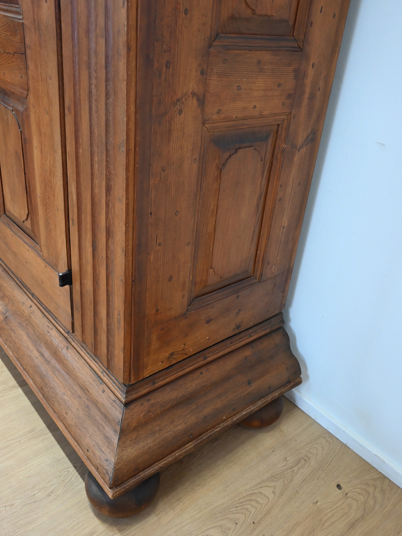 Mebel osadzony jest na dużych, charakterystycznych, toczonych nogach kulistych z masywnym cokołem i równie okazałym gzymsem wieńczącym. Szafa ozdobiona jest ośmioma kasetonami. Drzwi są lite, grube z wyraźną listwą przymykową z oryginalnym nakładanym zamkiem i kluczem. Na powierzchni widoczne są kołki, świadczące o dawnych technikach stolarskich. Część z nich miała funkcję konstrukcyjną – łączyła ramę z panelem lub zabezpieczała drewno przed paczeniem się. Inne pełniły rolę estetyczną, podkreślając solidny, rzemieślniczy charakter mebla i jego autentyczność.