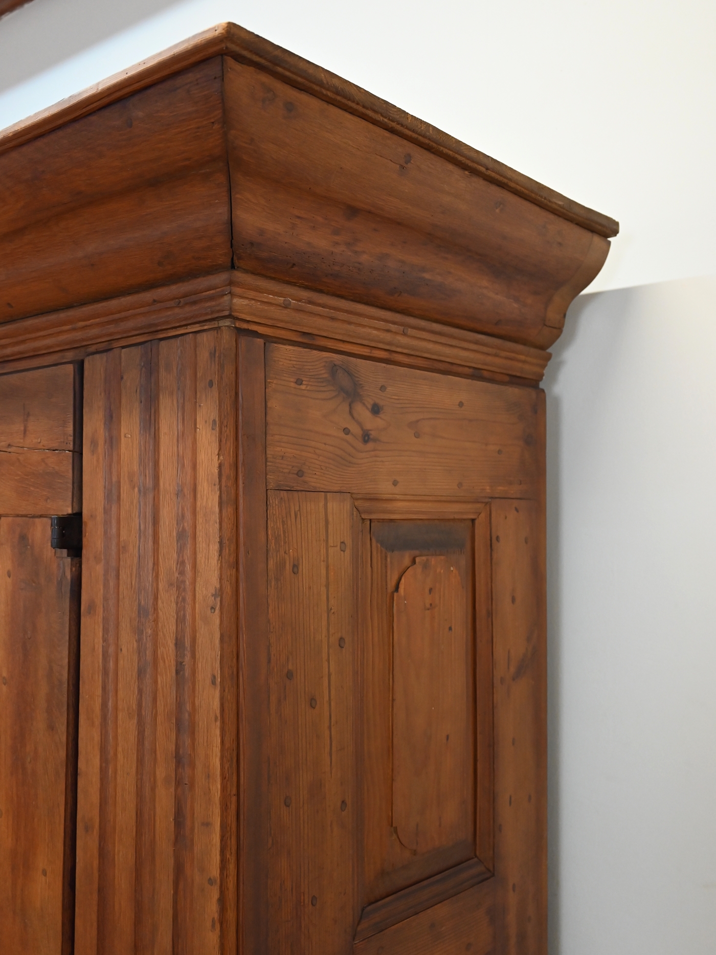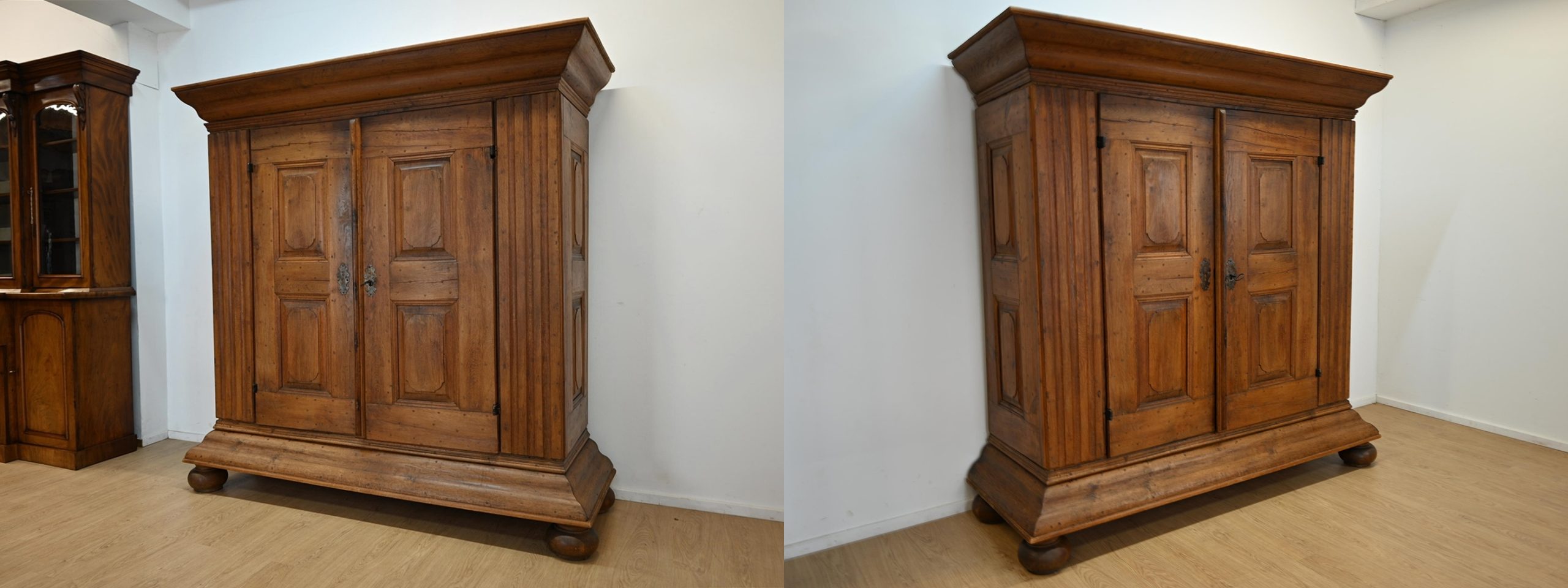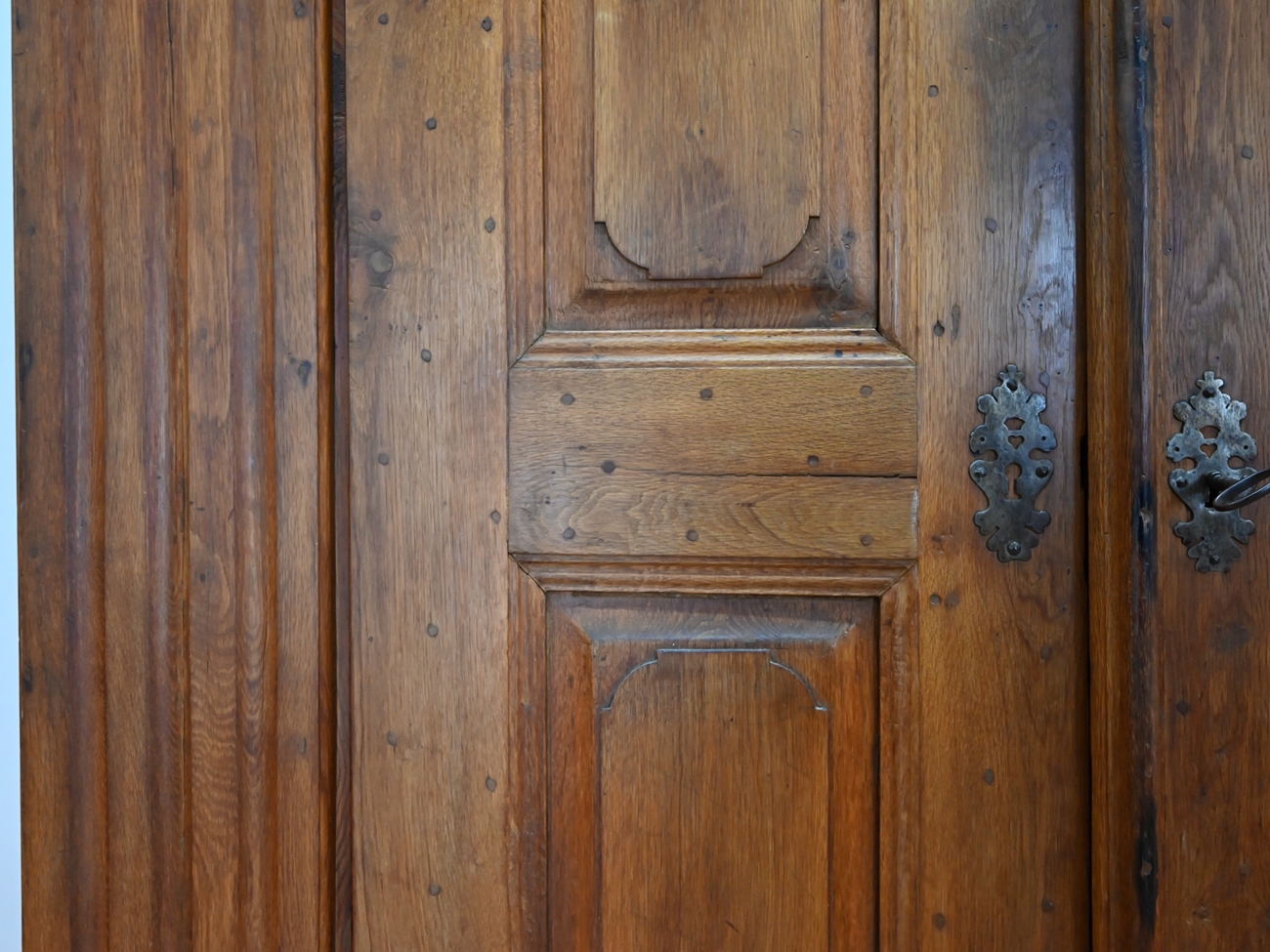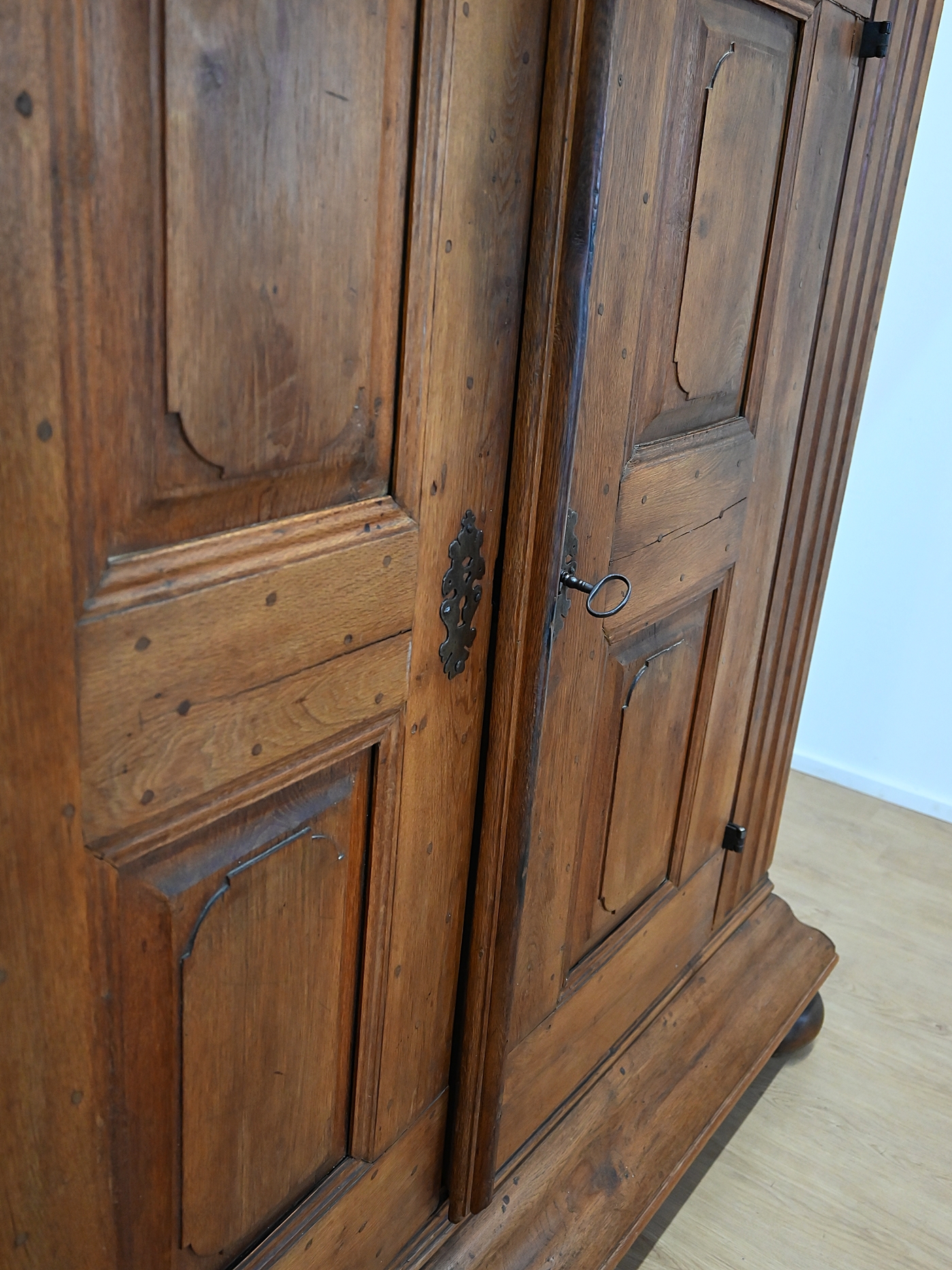 Mebel osadzony jest na dużych, charakterystycznych, toczonych nogach kulistych z masywnym cokołem i równie okazałym gzymsem wieńczącym. Szafa ozdobiona jest ośmioma kasetonami. Drzwi są lite, grube z wyraźną listwą przymykową z oryginalnym nakładanym zamkiem i kluczem. Na powierzchni widoczne są kołki, świadczące o dawnych technikach stolarskich. Część z nich miała funkcję konstrukcyjną – łączyła ramę z panelem lub zabezpieczała drewno przed paczeniem się. Inne pełniły rolę estetyczną, podkreślając solidny, rzemieślniczy charakter mebla i jego autentyczność.
