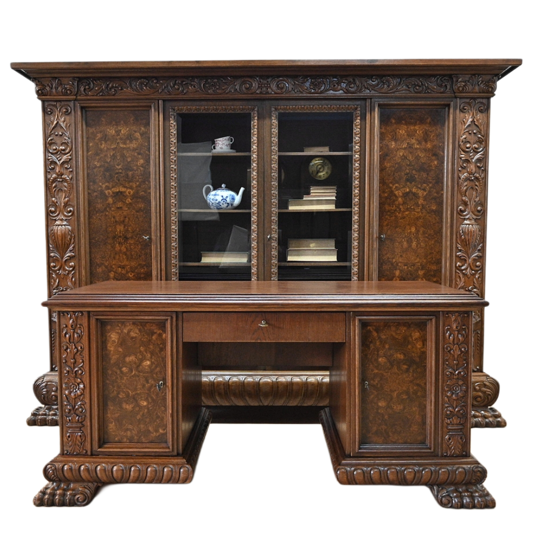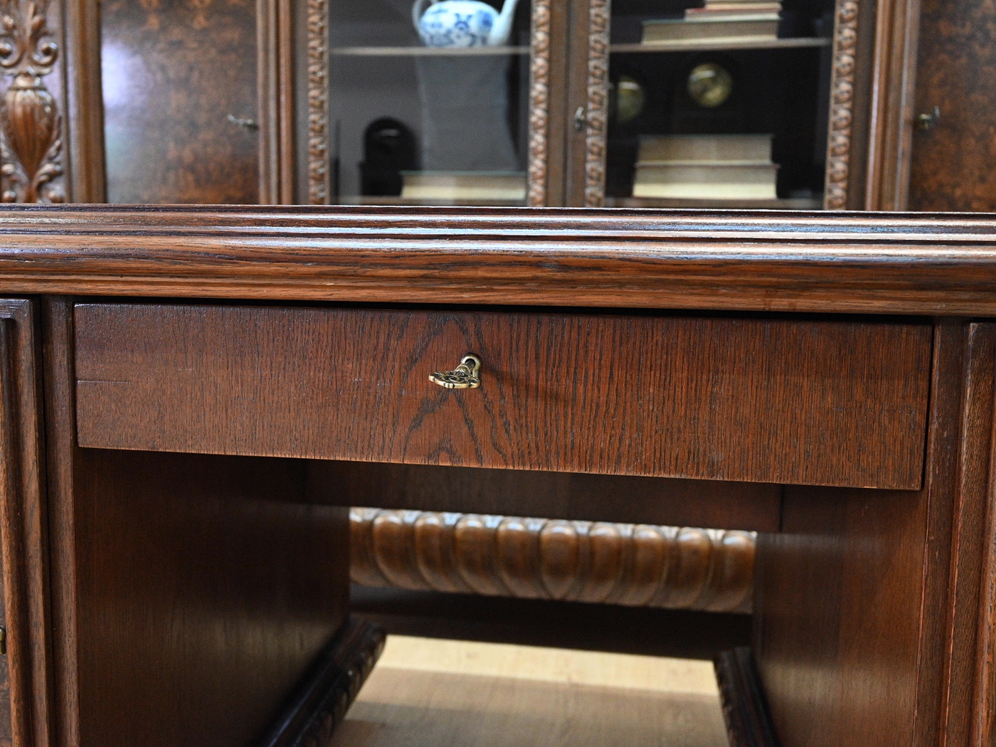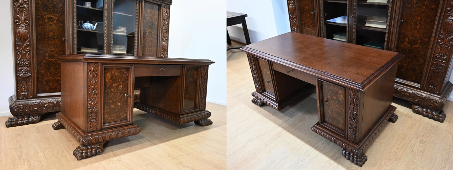 Stan bardzo dobry. Meble przygotowane do użytkowania. Odświeżone zostały powierzchnie zewnętrzne jak i środki mebli. Meble mają już swoje lata i ślady minionego czasu, które nie wpływają na ich odbiór estetyczny, są świadectwem autentyczności mebli. Gabinet od razu można wstawić do mieszkania.