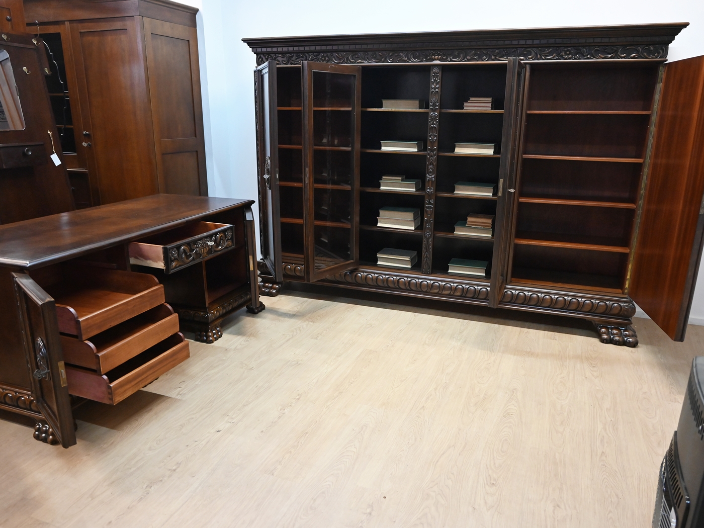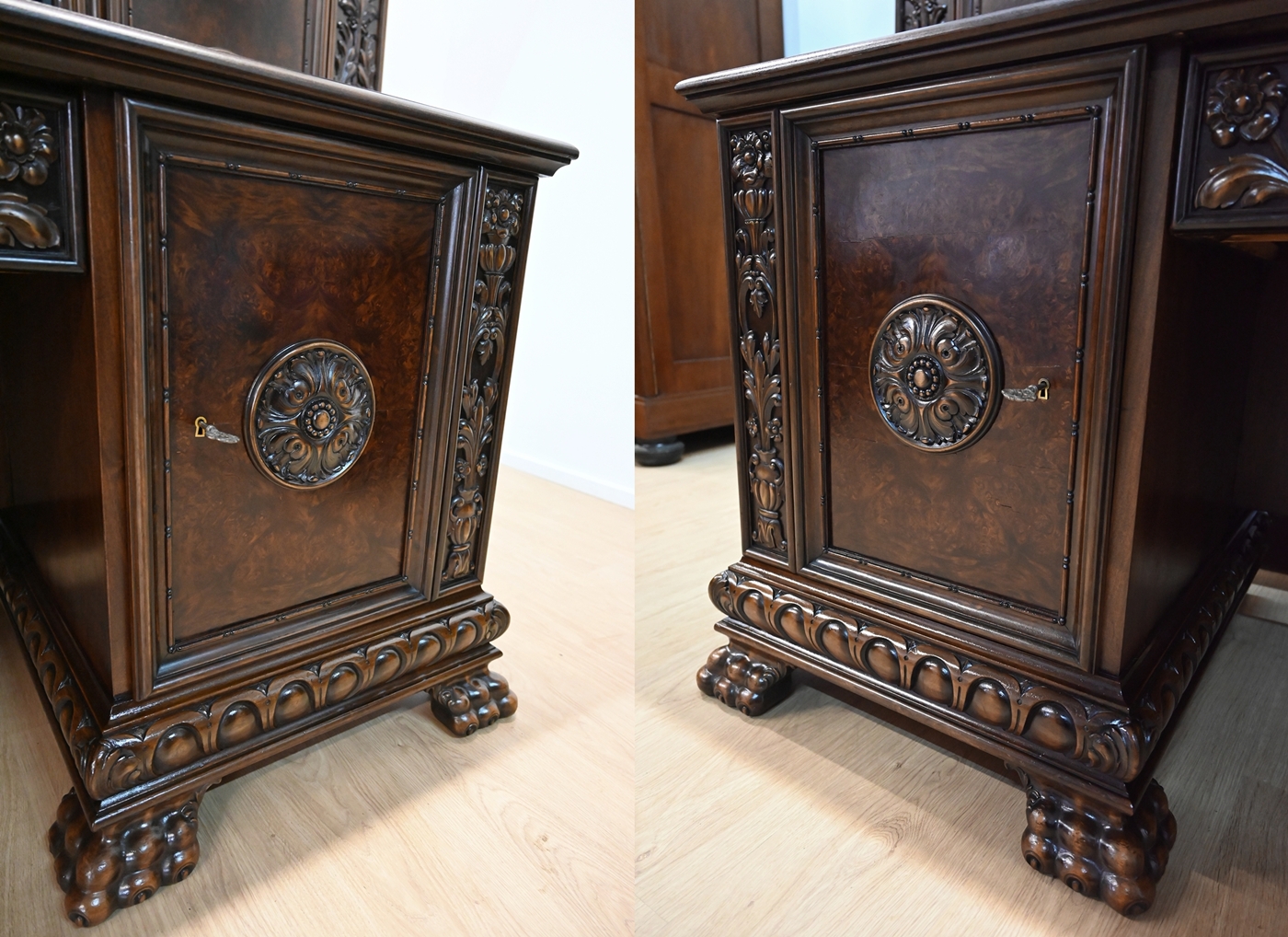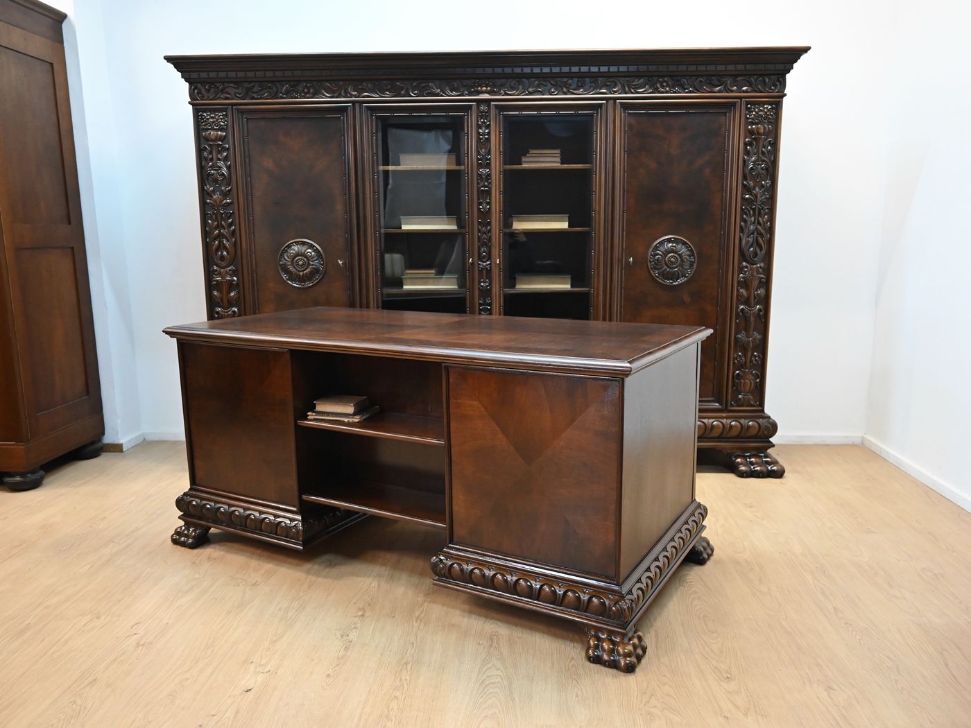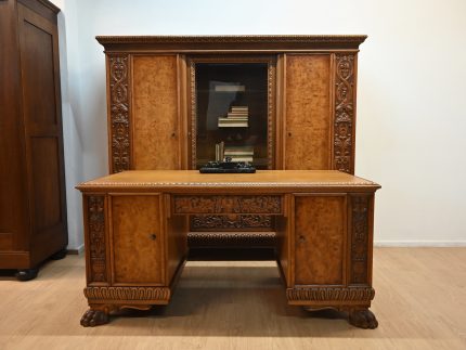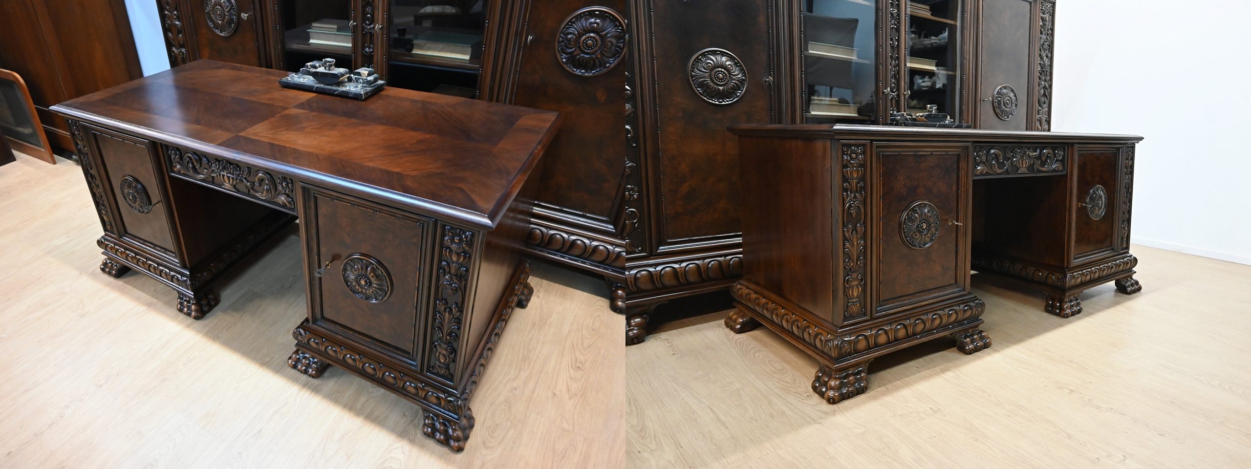 Stan bardzo dobry. Meble przygotowane do użytkowania. Odświeżone zostały powierzchnie zewnętrzne jak i środki mebli. Meble mają już swoje lata i ślady minionego czasu, które nie wpływają na ich odbiór estetyczny, są świadectwem autentyczności mebli. Gabinet od razu można wstawić do mieszkania.
