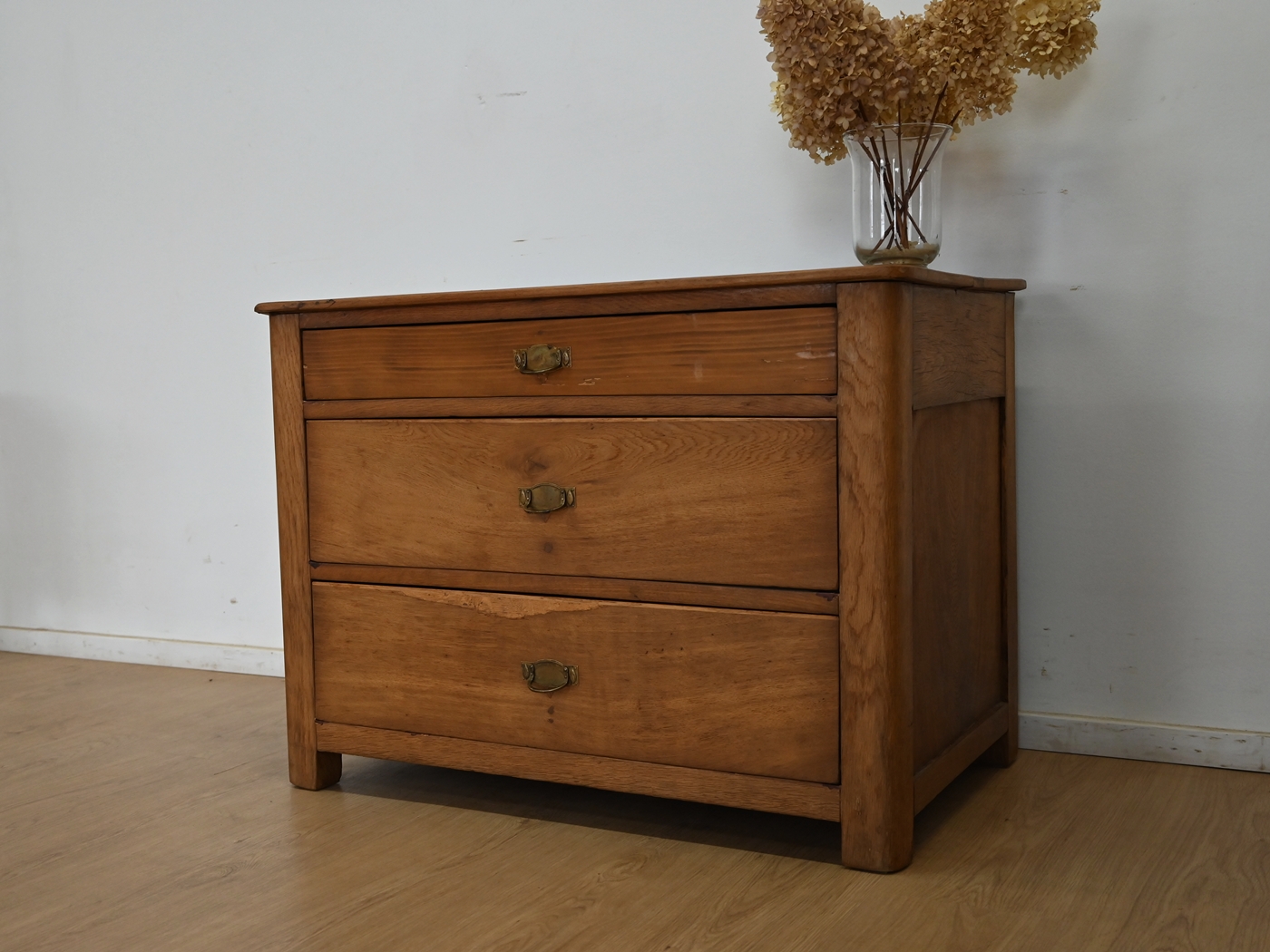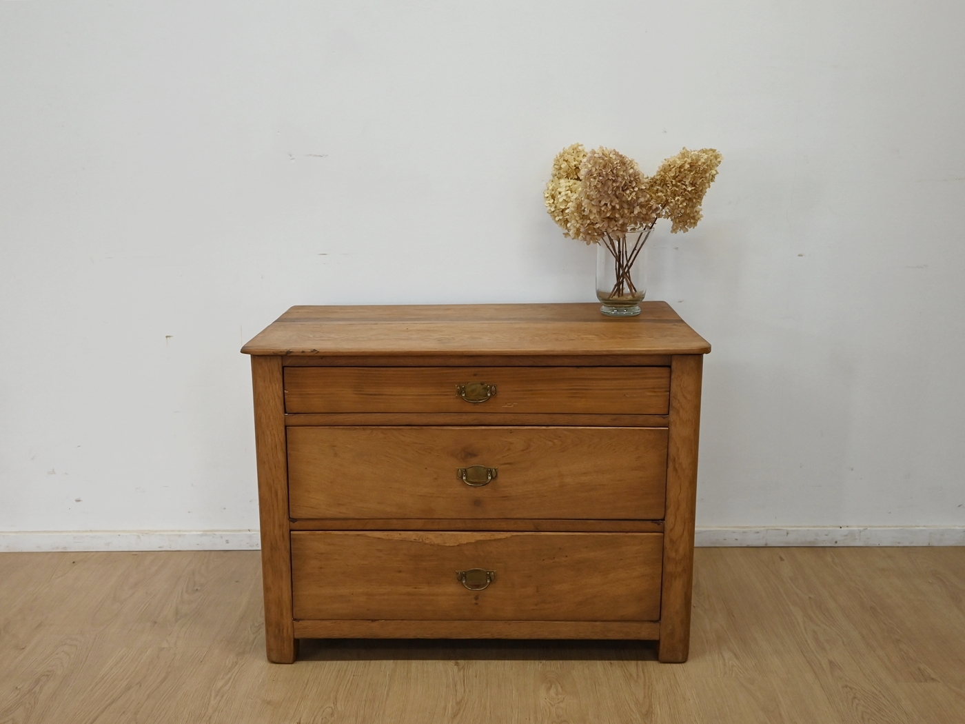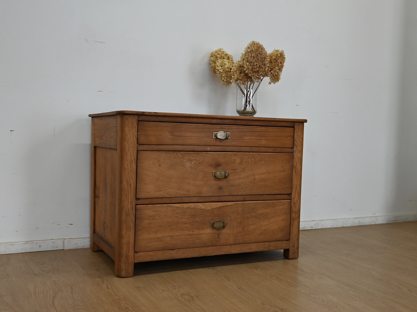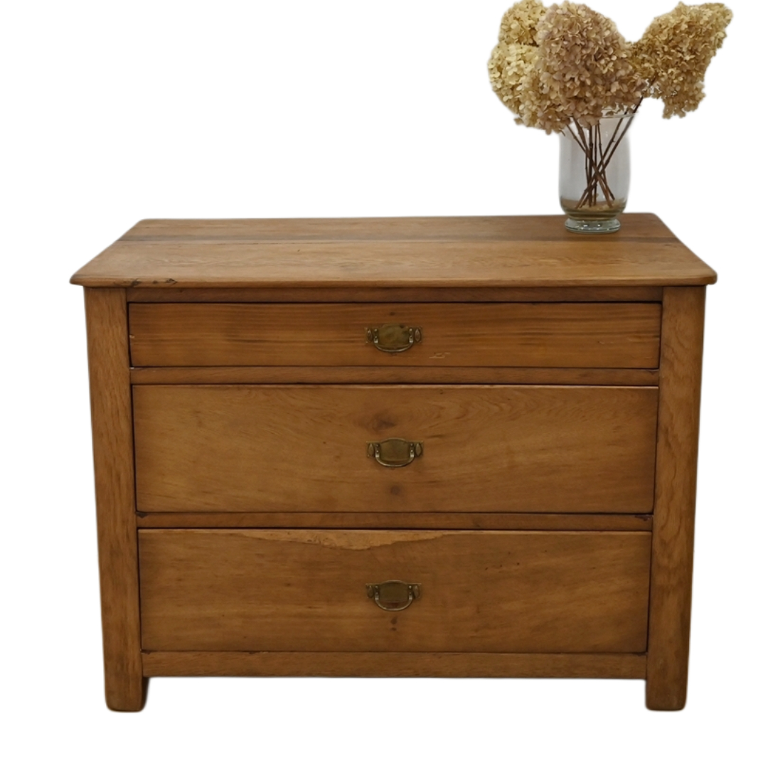 Wykonany jest w całości z drewna, fronty w litym dębie a środek, plecy i górna szuflada w sośnie.
