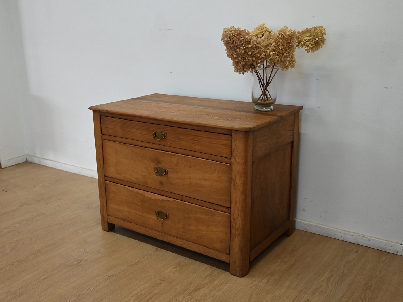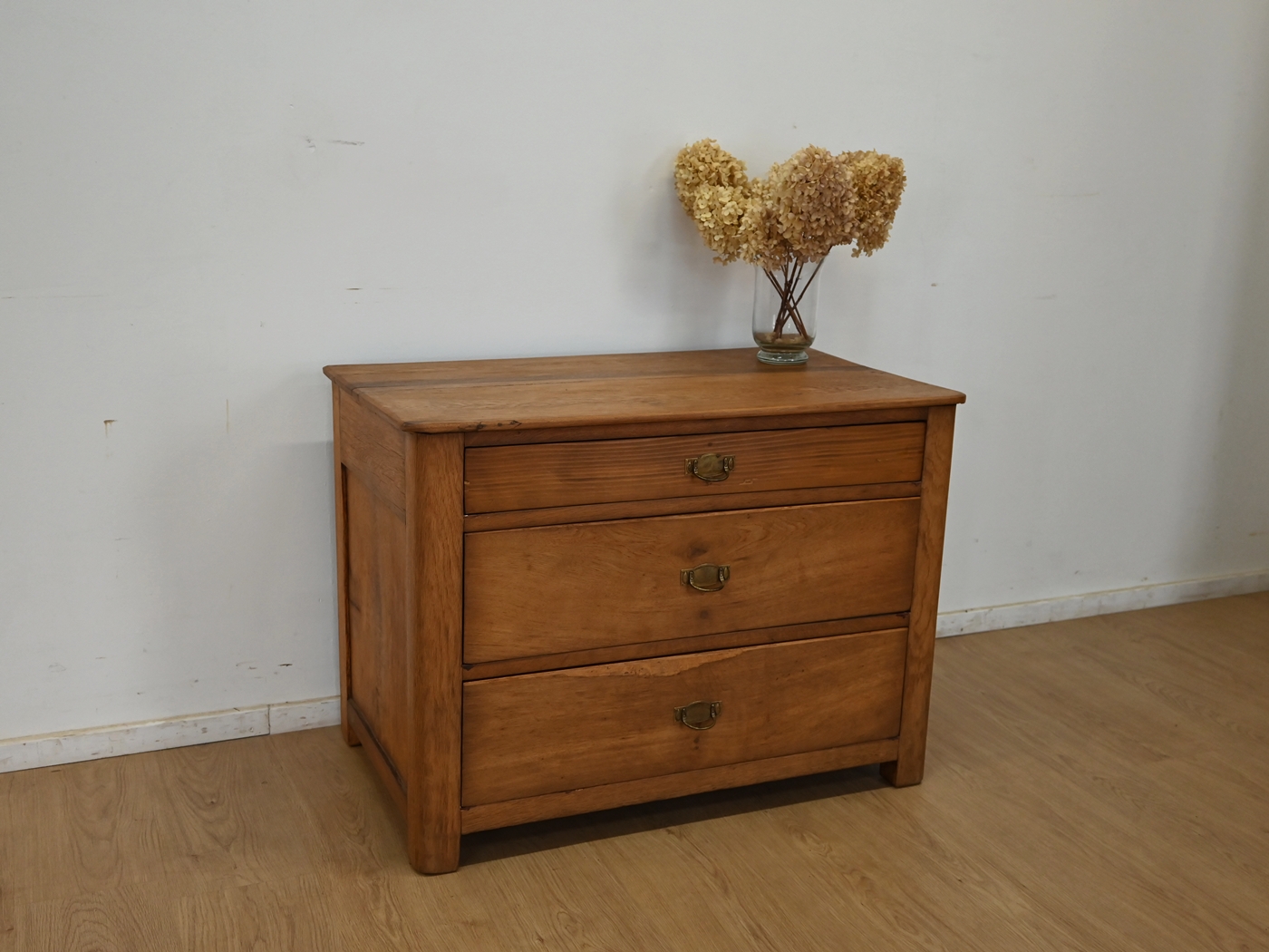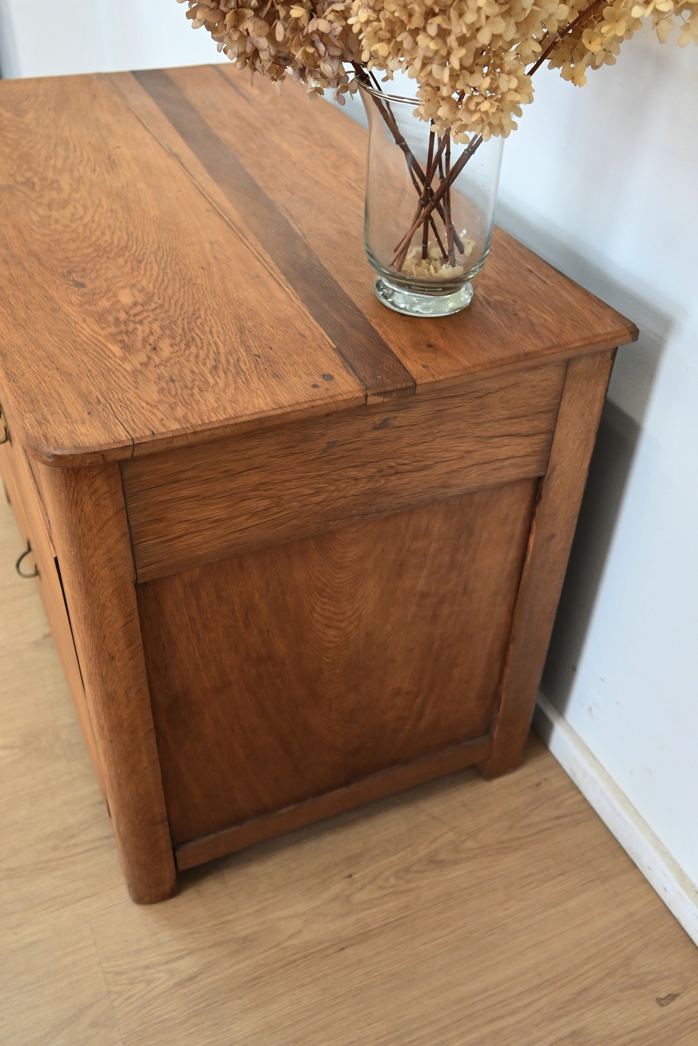 Wykonany jest w całości z drewna, fronty w litym dębie a środek, plecy i górna szuflada w sośnie.