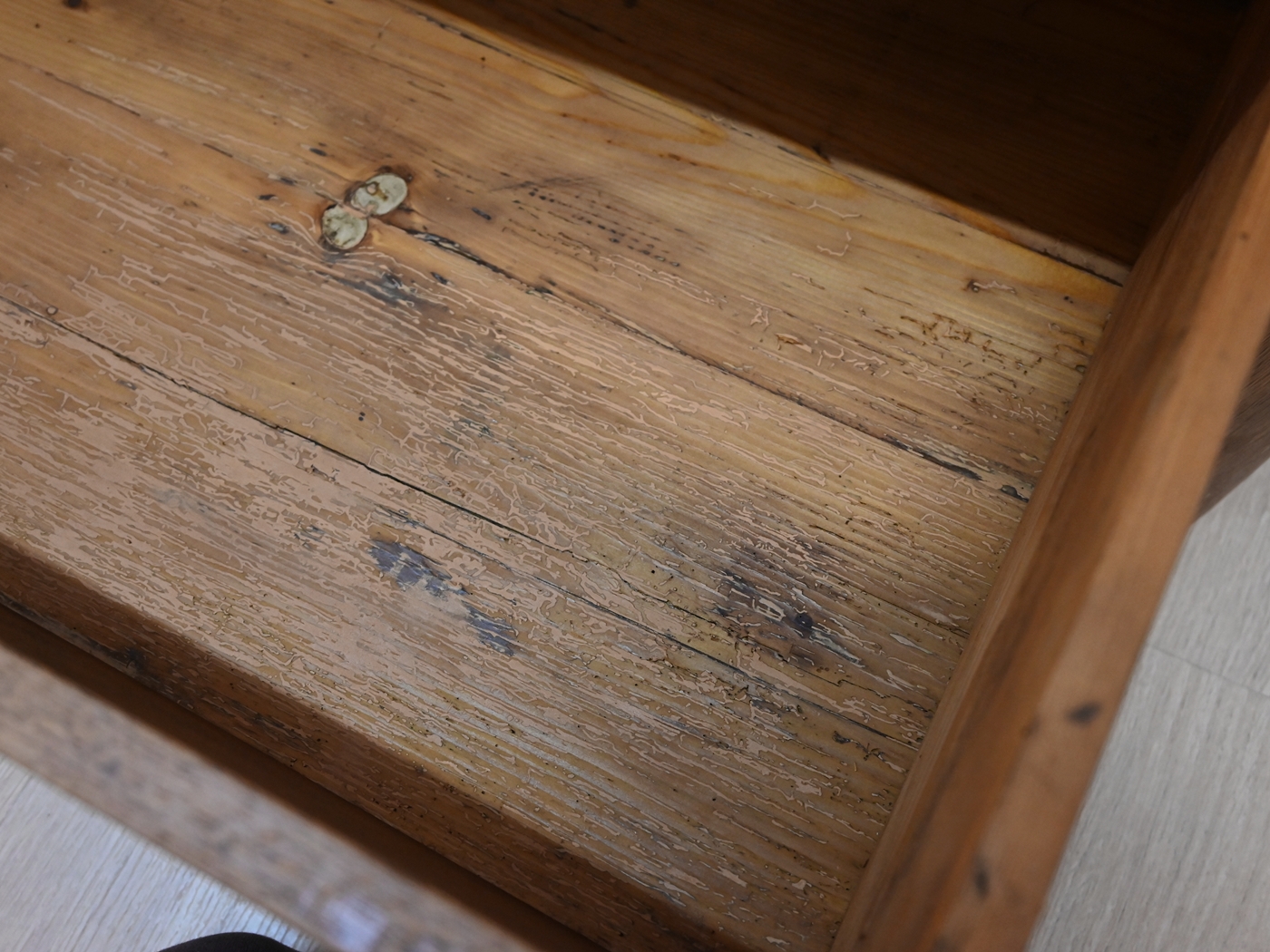 Ślady po kornikach. Mebel zaimpregnowany preparatem przeciw kornikom. Brak aktywnego kornika.