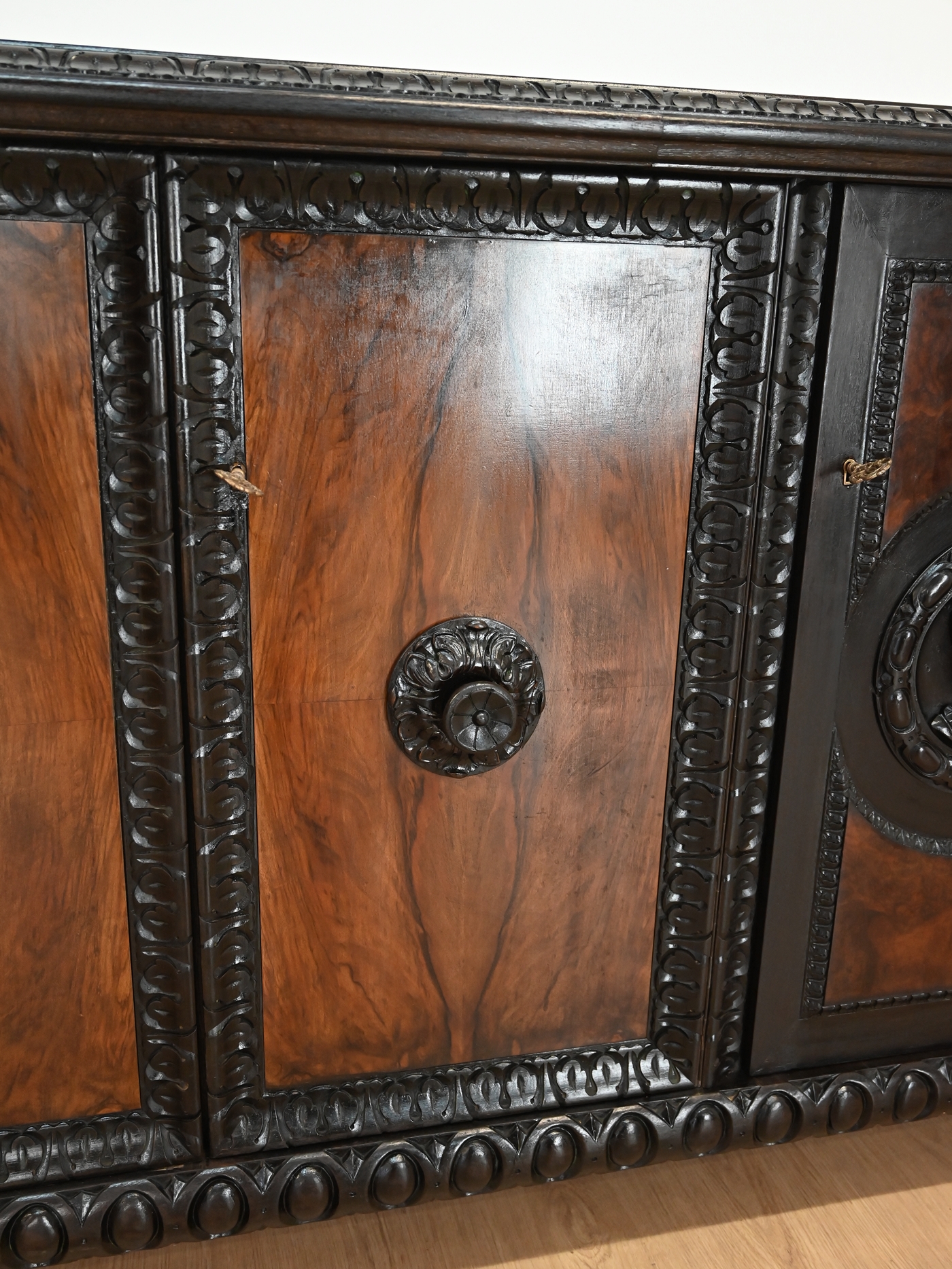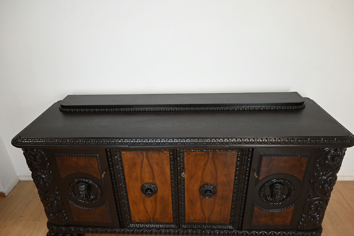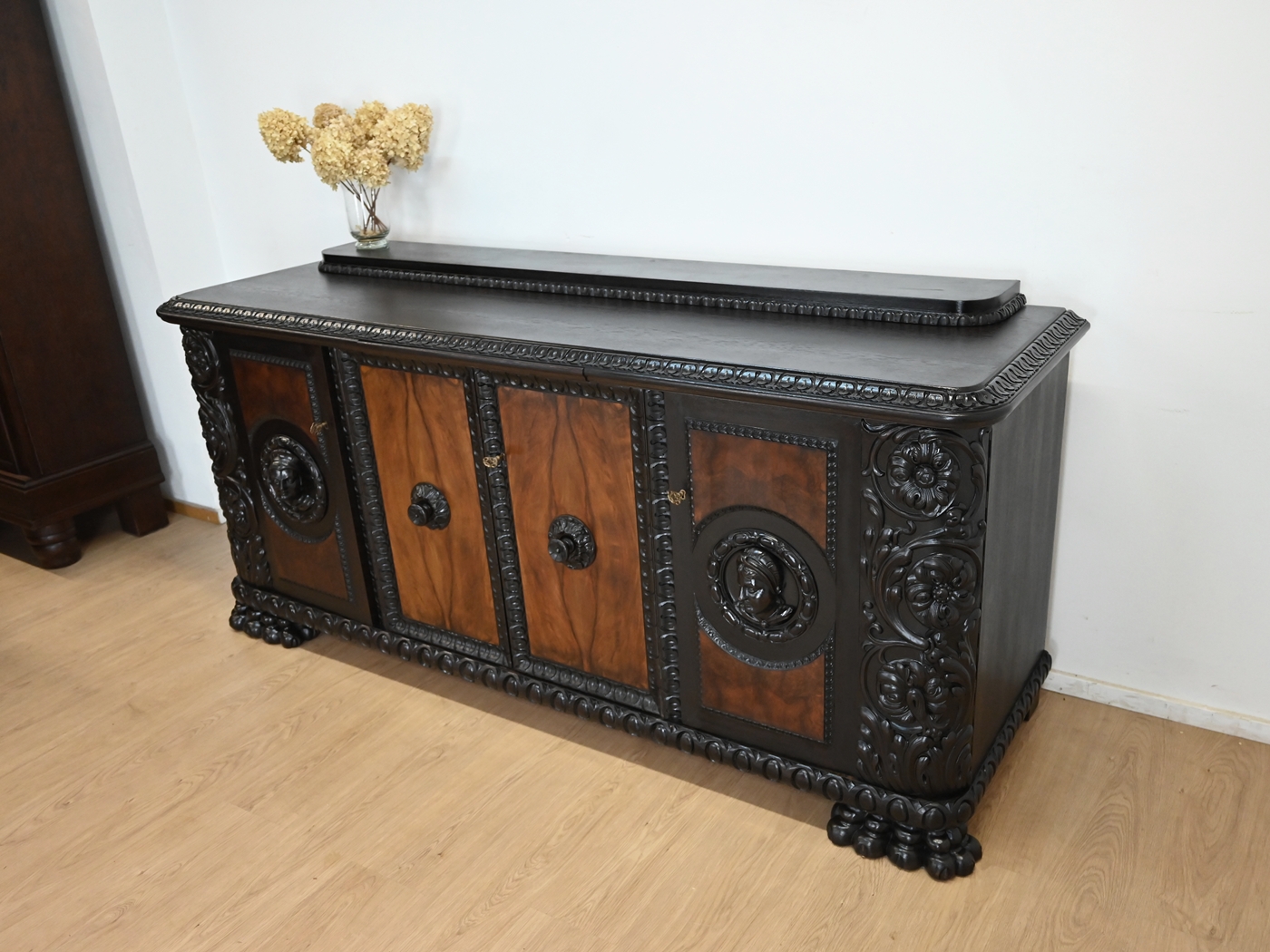 Wykonany jest w całości z drewna, fornirowany dębem i orzechem.