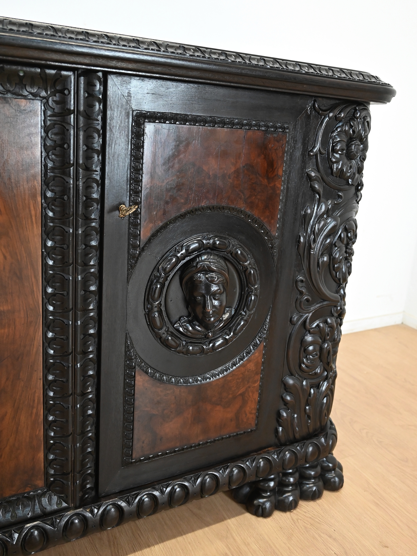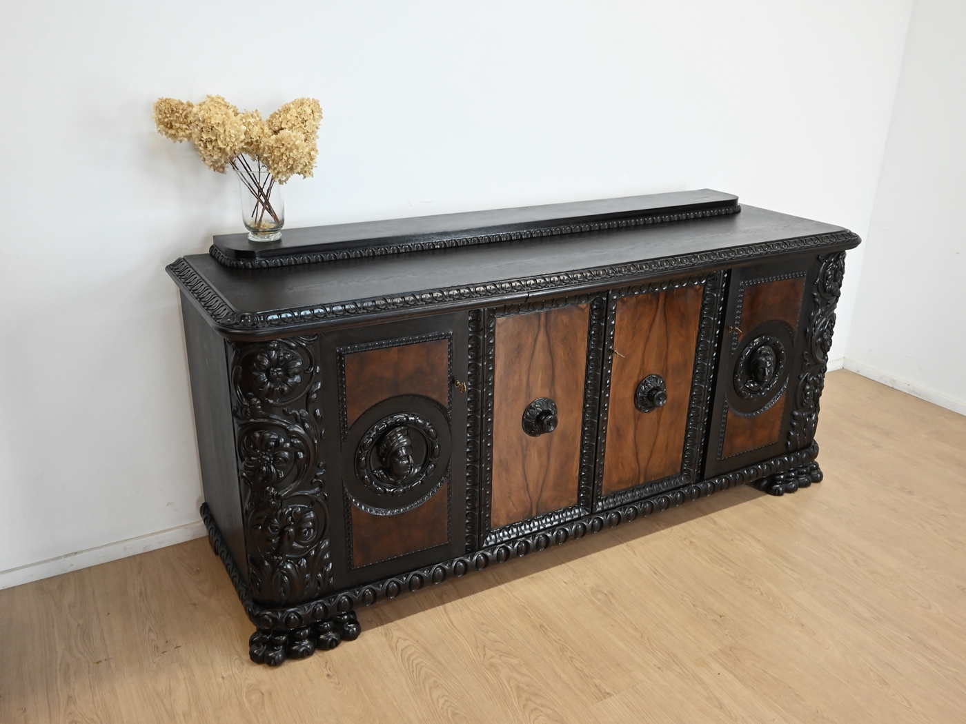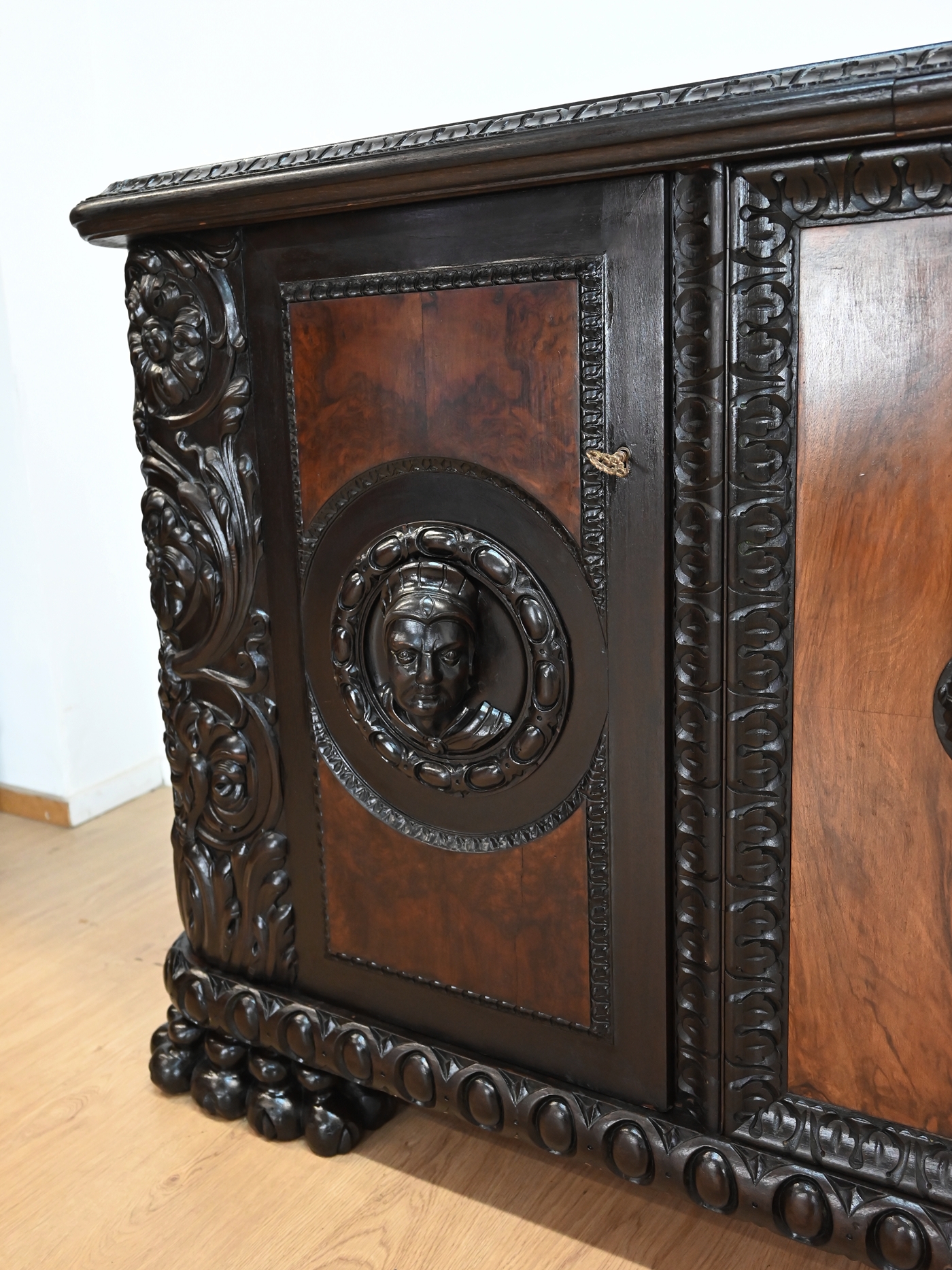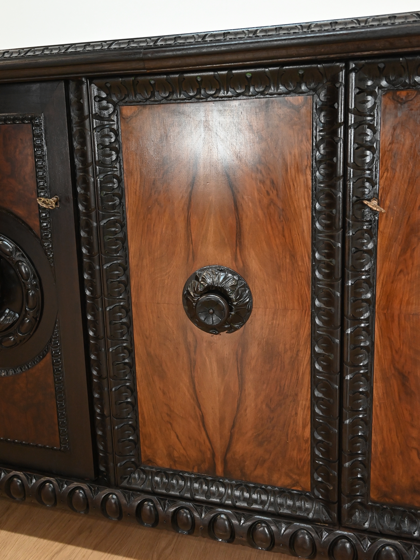 Wykonany jest w całości z drewna, fornirowany dębem i orzechem.