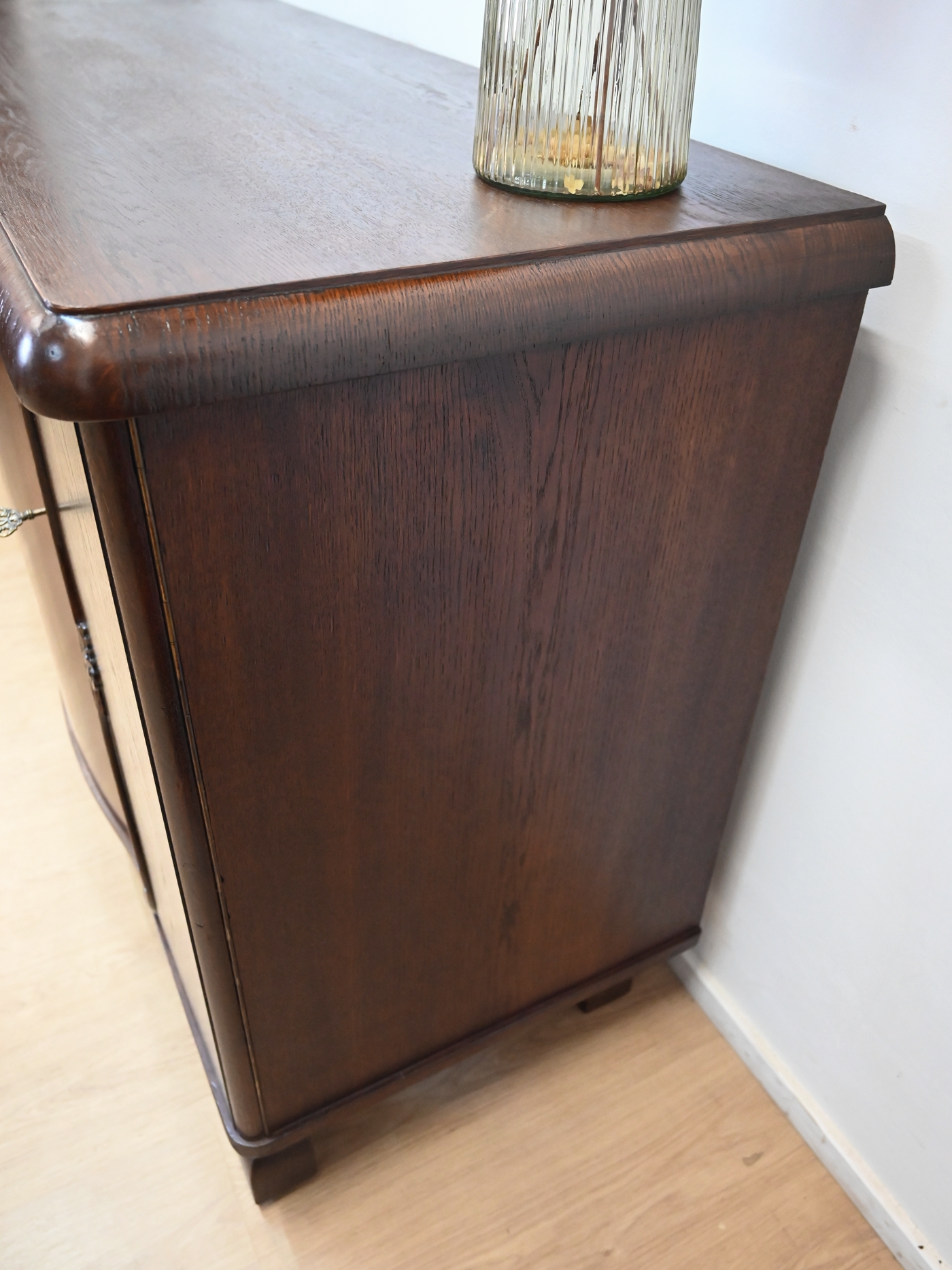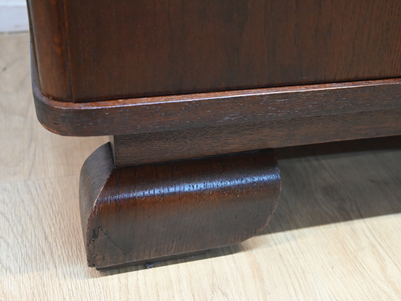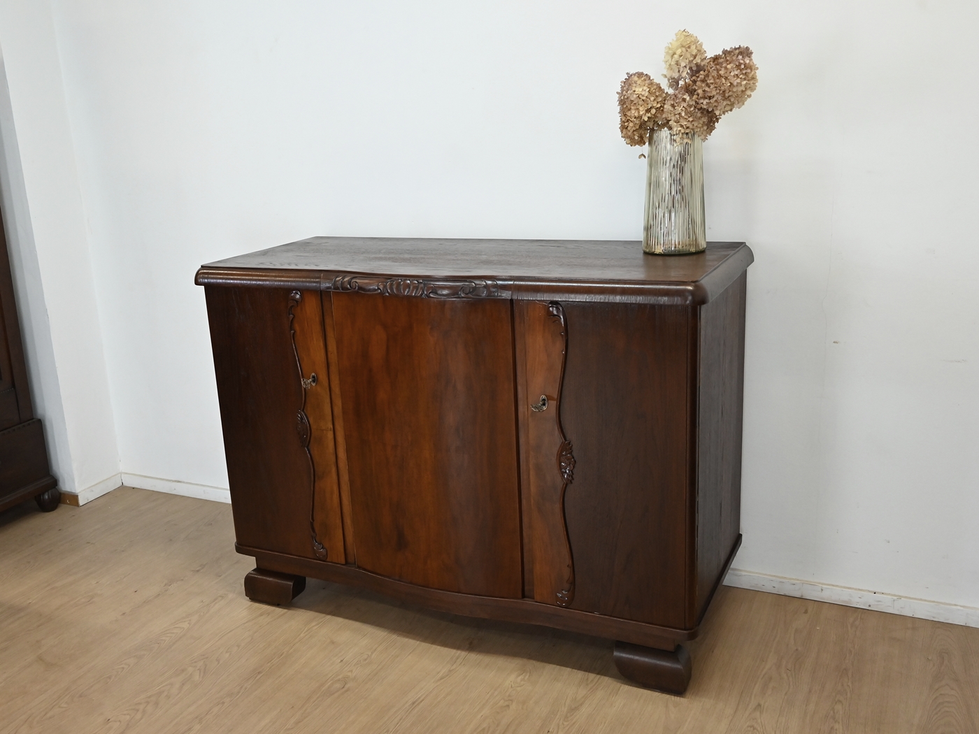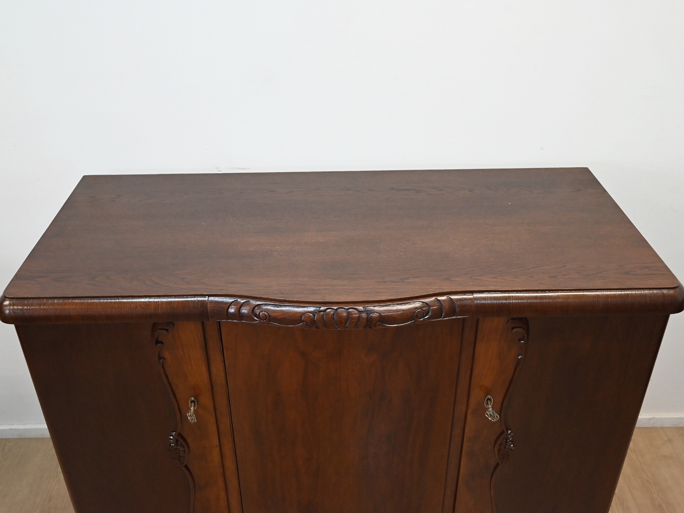 Stan bardzo dobry. Mebel przygotowany do użytkowania. Odświeżone zostały powierzchnie zewnętrzne jak i środek mebla. Mebel ma już swoje lata i ślady minionego czasu, które nie wpływają na jego odbiór estetyczny, są świadectwem autentyczności mebla. Komodę od razu można wstawić do mieszkania.