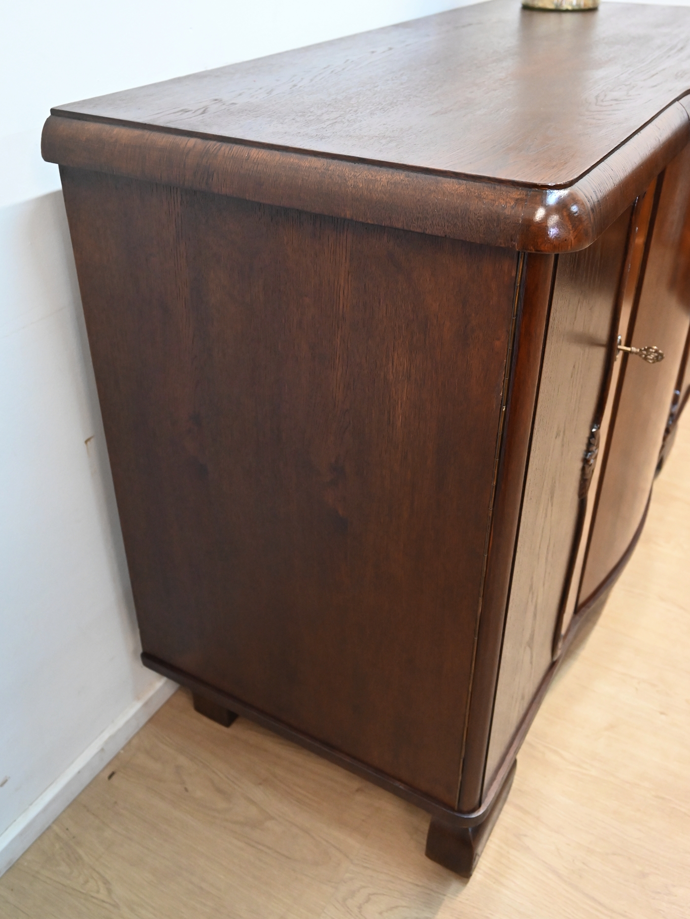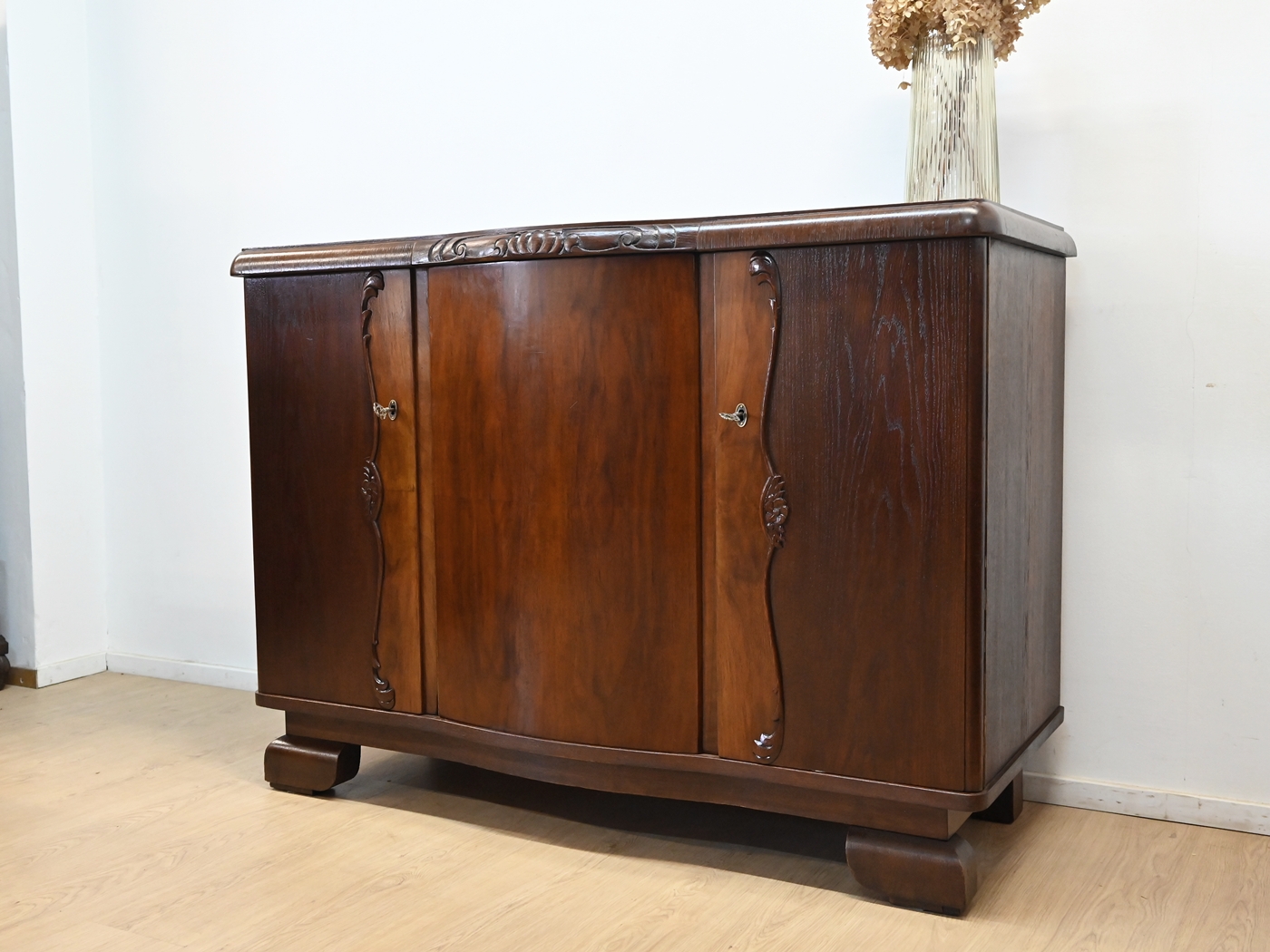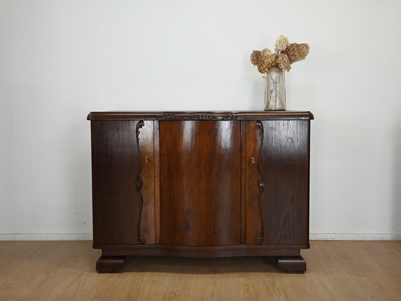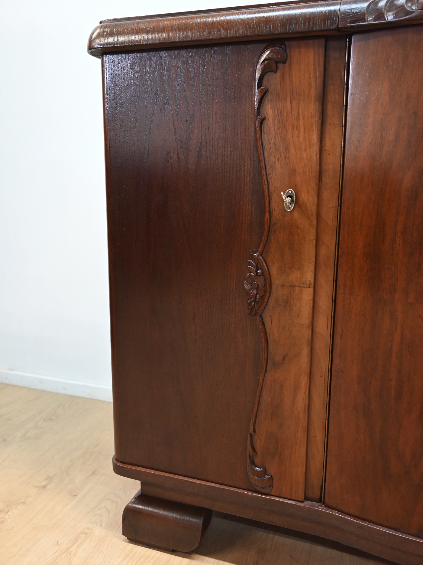Stan bardzo dobry. Mebel przygotowany do użytkowania. Odświeżone zostały powierzchnie zewnętrzne jak i środek mebla. Mebel ma już swoje lata i ślady minionego czasu, które nie wpływają na jego odbiór estetyczny, są świadectwem autentyczności mebla. Komodę od razu można wstawić do mieszkania.