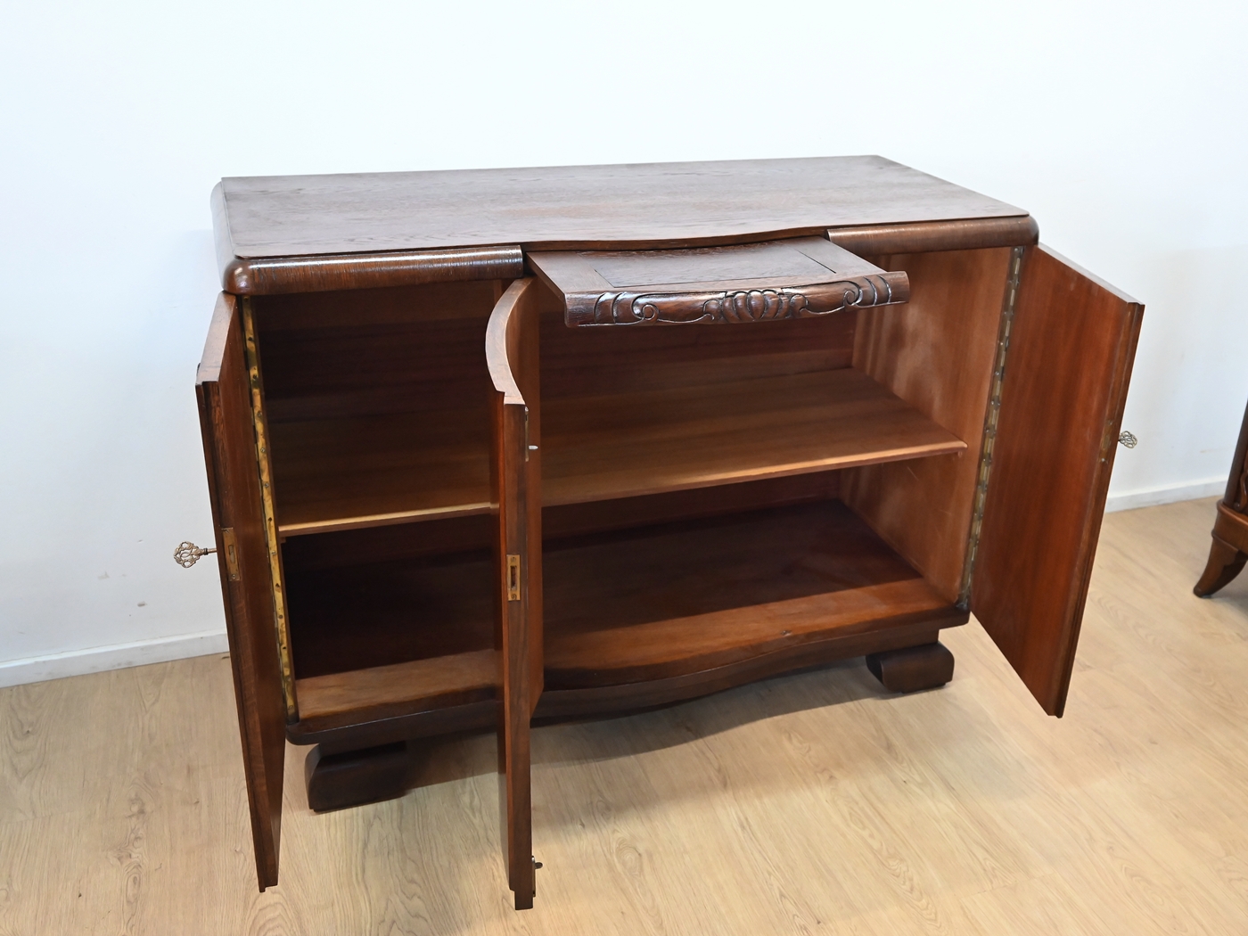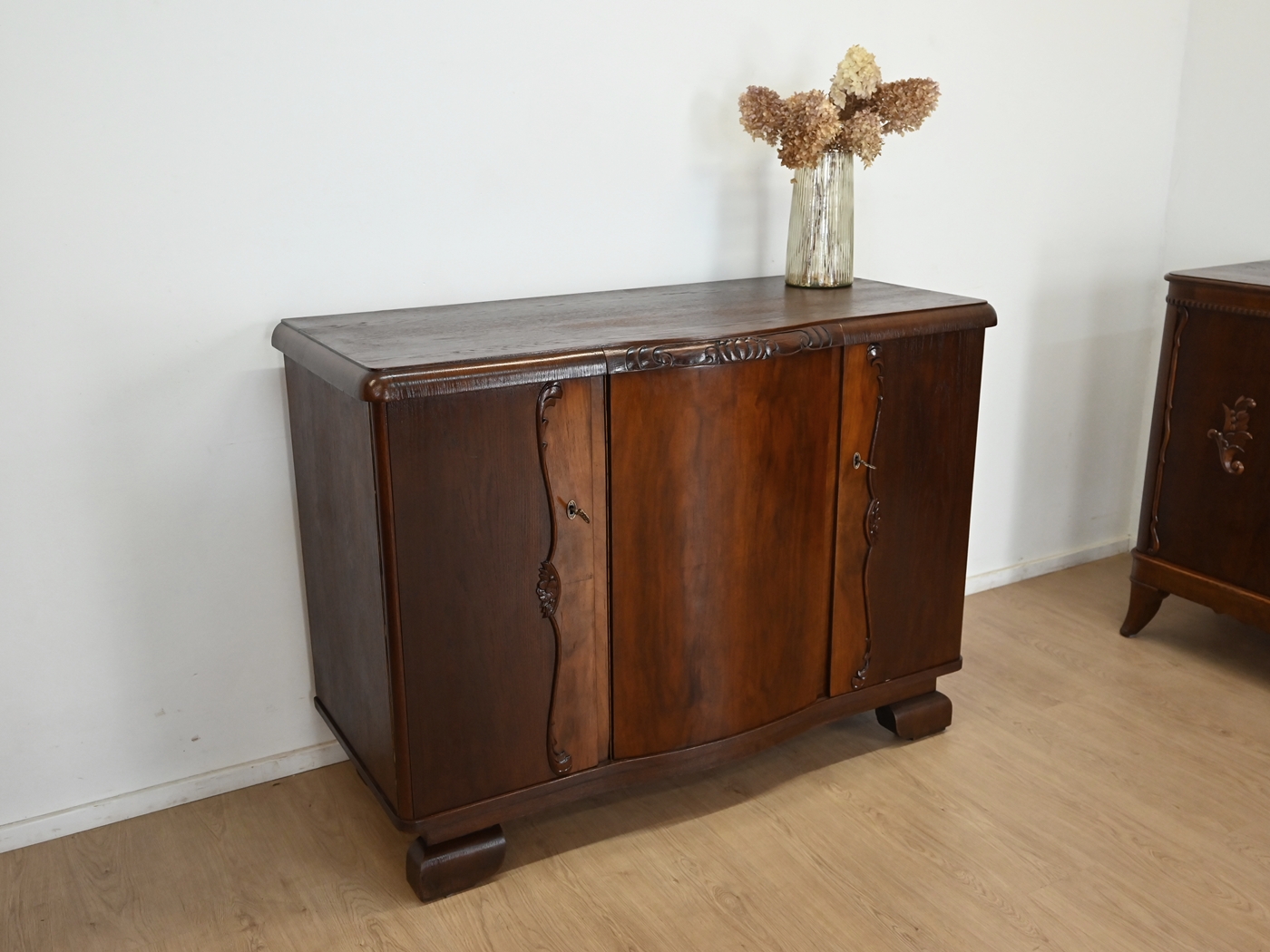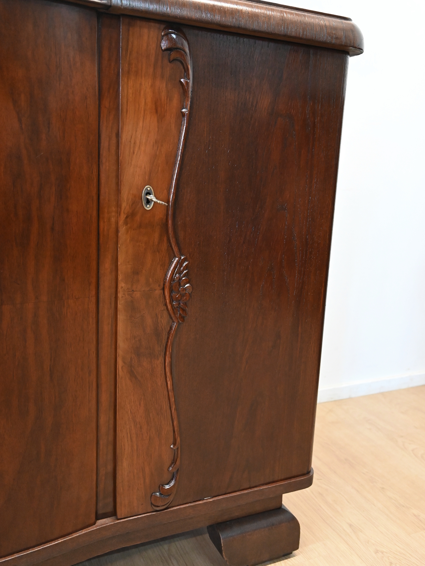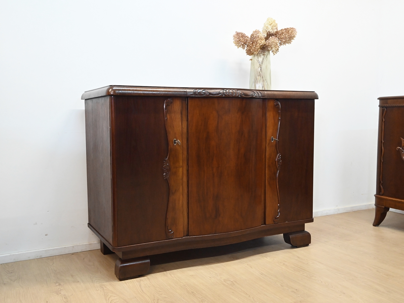 Stan bardzo dobry. Mebel przygotowany do użytkowania. Odświeżone zostały powierzchnie zewnętrzne jak i środek mebla. Mebel ma już swoje lata i ślady minionego czasu, które nie wpływają na jego odbiór estetyczny, są świadectwem autentyczności mebla. Komodę od razu można wstawić do mieszkania.