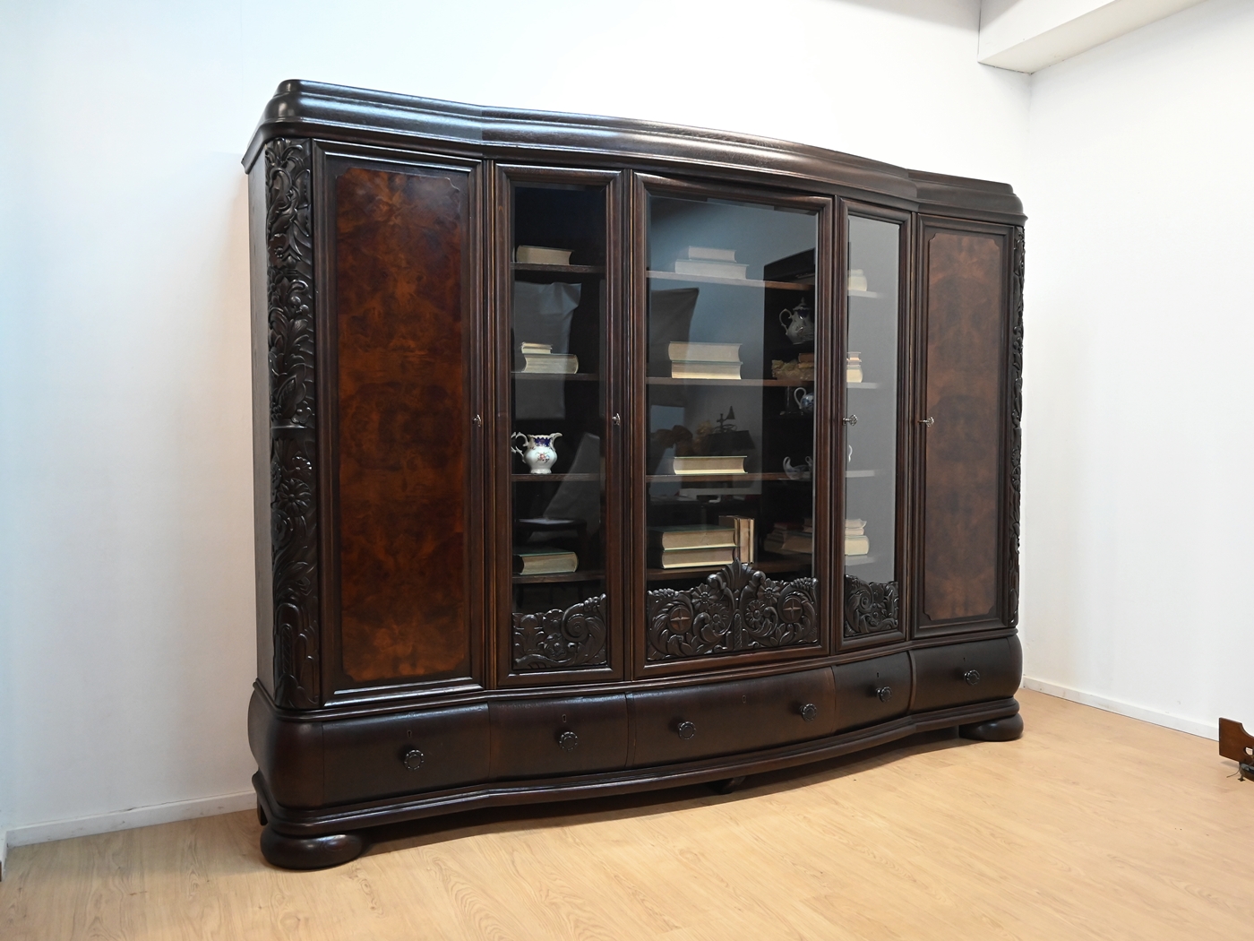 Stan bardzo dobry. Mebel przygotowany do użytkowania. Odświeżone zostały powierzchnie zewnętrzne jak i środek mebla. Mebel ma już swoje lata i ślady minionego czasu, które nie wpływają na jego odbiór estetyczny, są świadectwem autentyczności mebla. Bibliotekę od razu można wstawić do mieszkania.