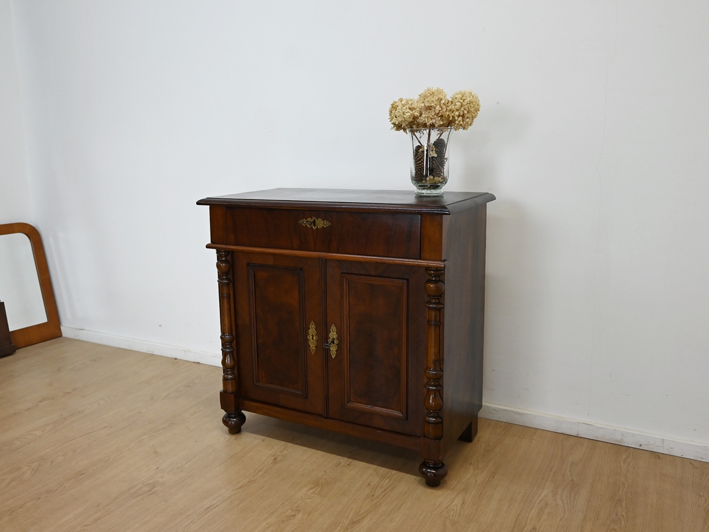 Stan dobry. Mebel przygotowany do użytkowania. Odświeżone zostały powierzchnie zewnętrzne jak i środek mebla. Mebel ma już swoje lata i ślady minionego czasu, które nie wpływają na jego odbiór estetyczny, są świadectwem autentyczności mebla. Szafkę od razu można wstawić do mieszkania.