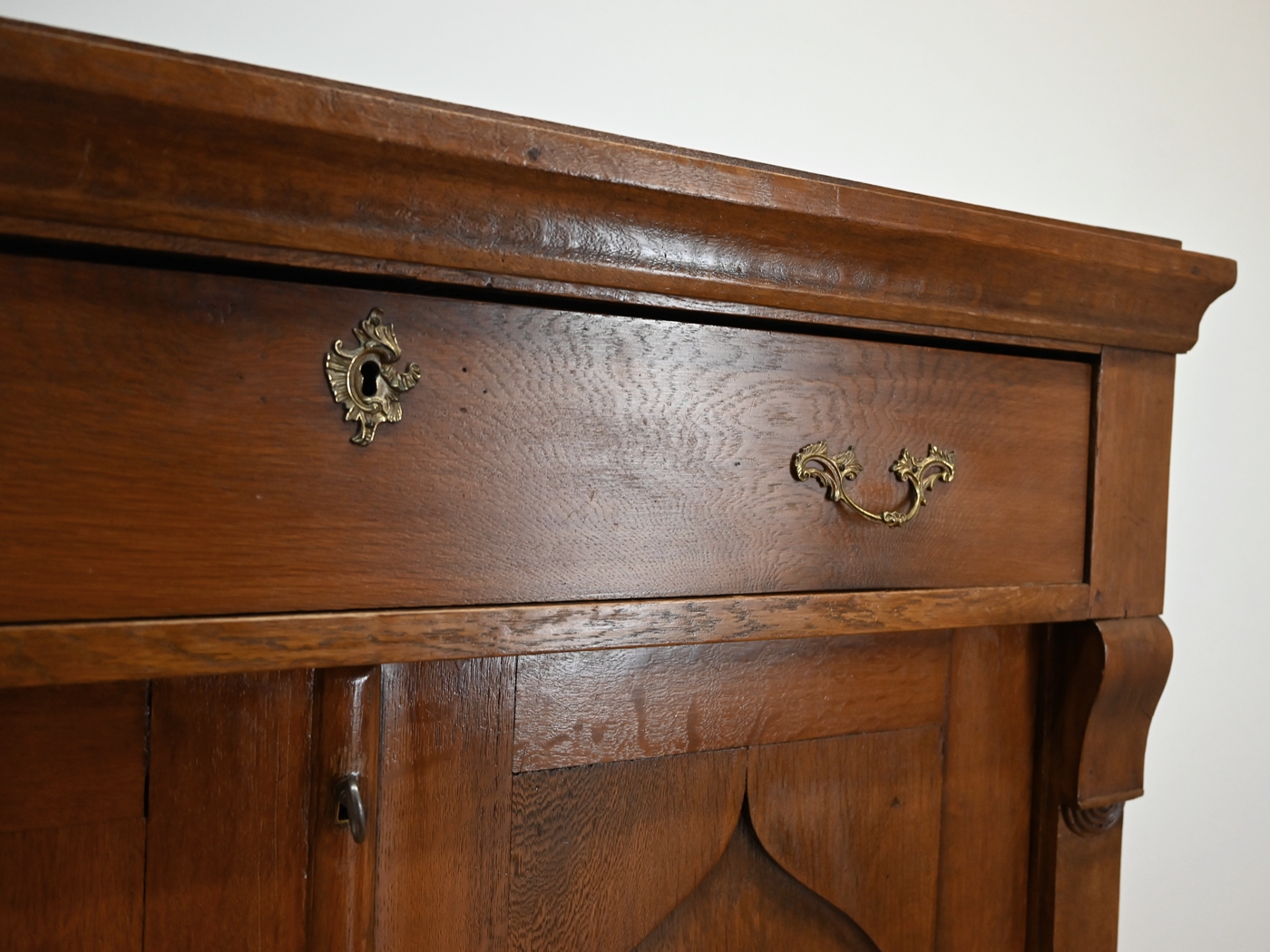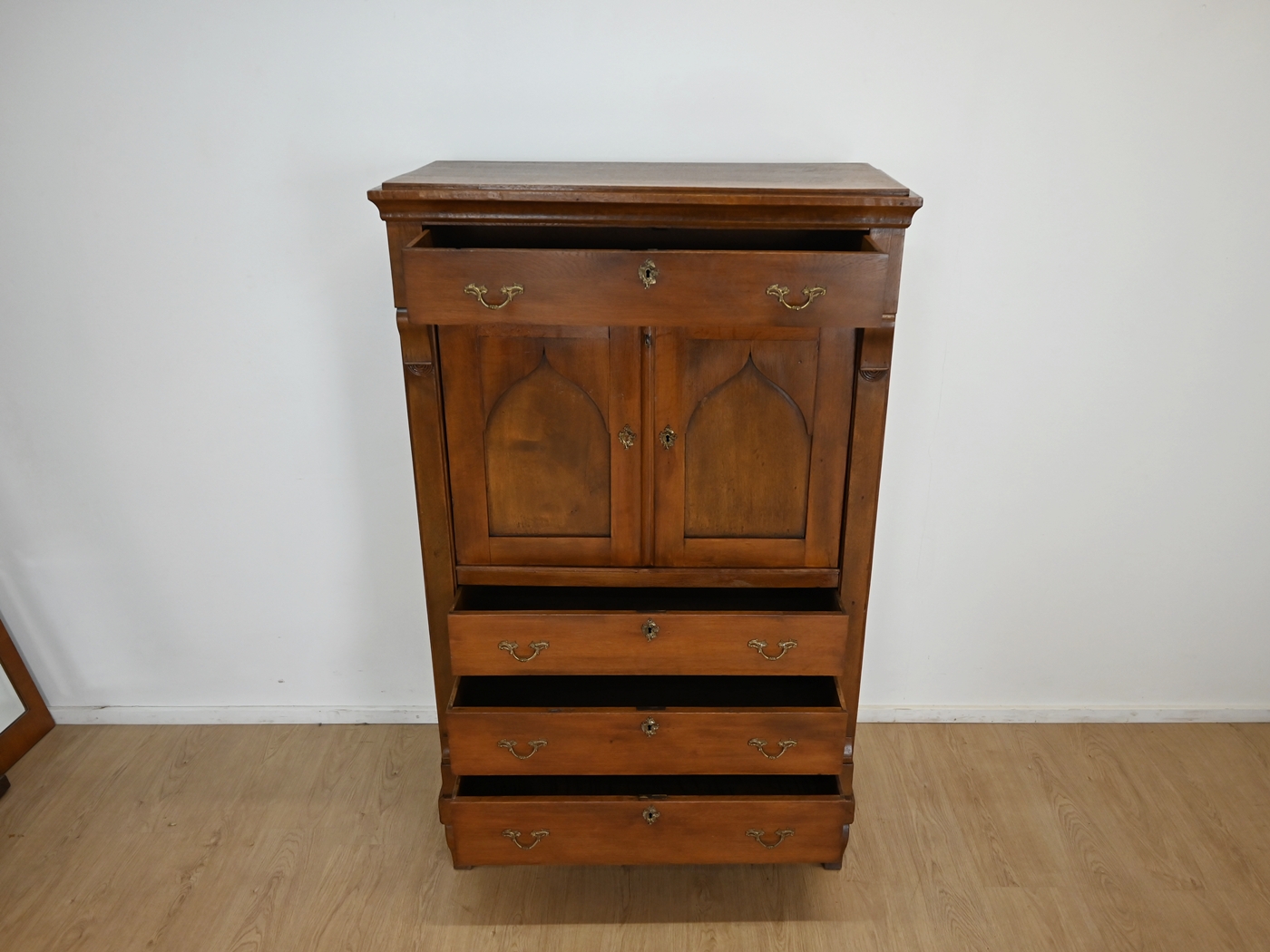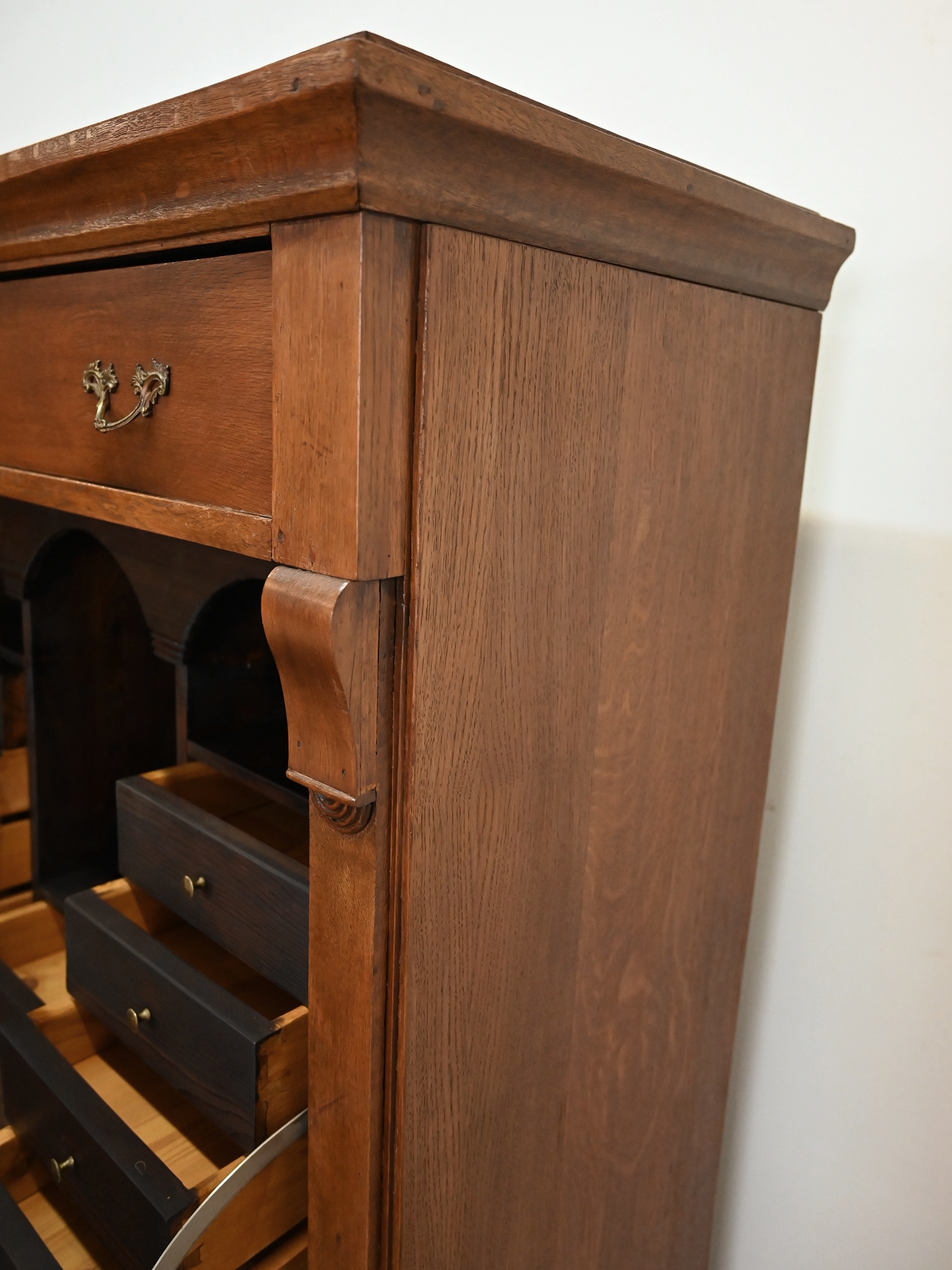 Ślady po kornikach w plecach, spodzie. Mebel zaimpregnowany preparatem przeciw kornikom. Brak aktywnego kornika.