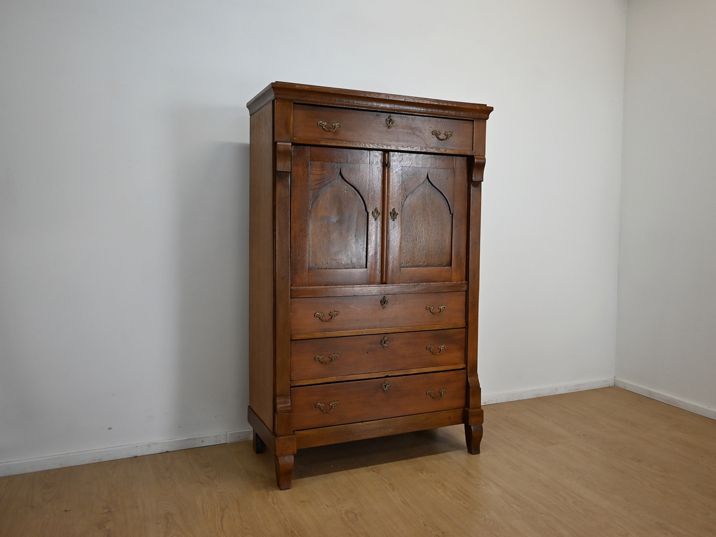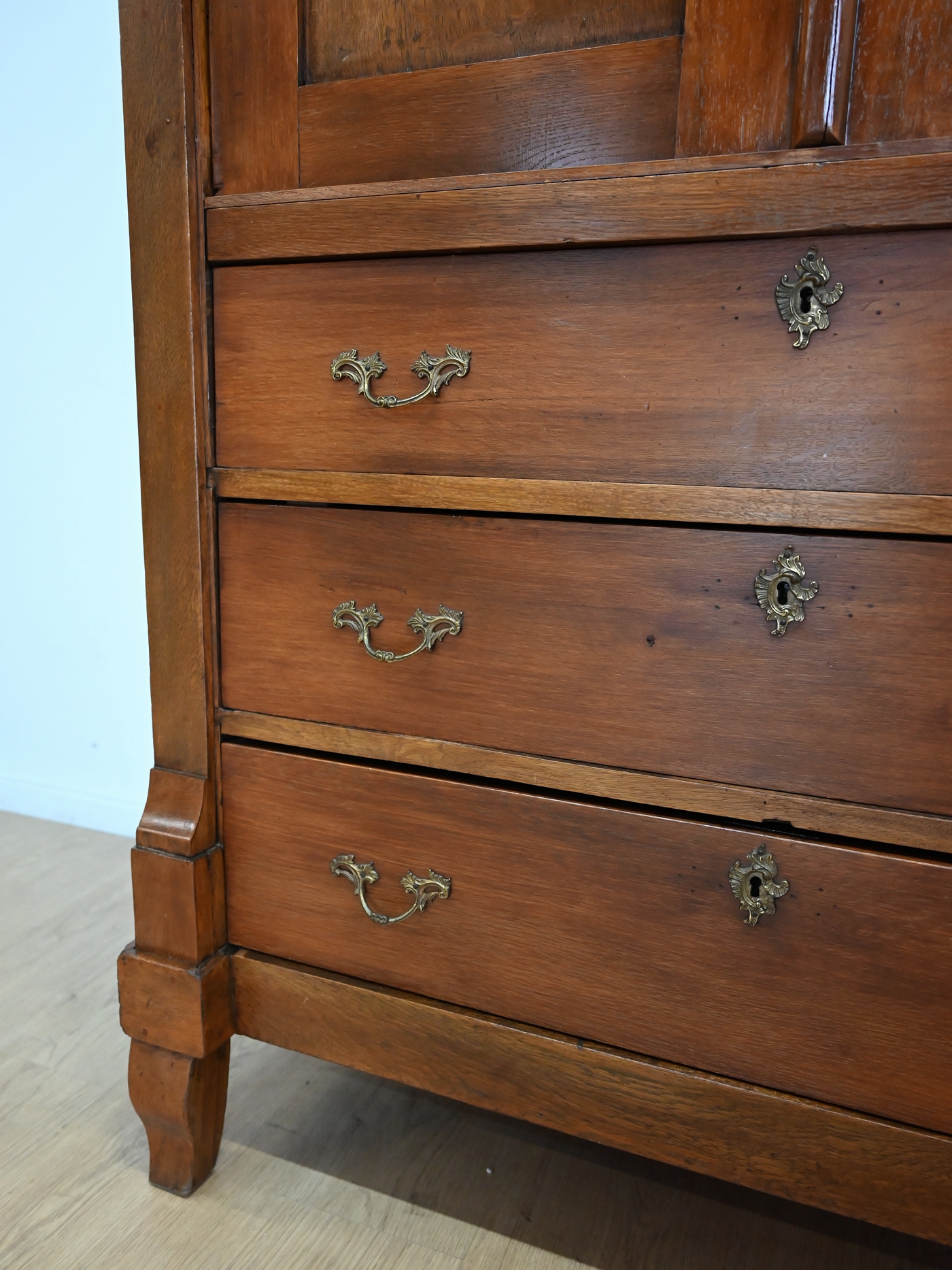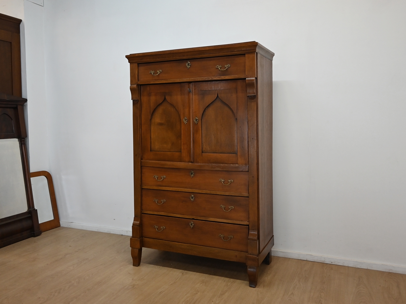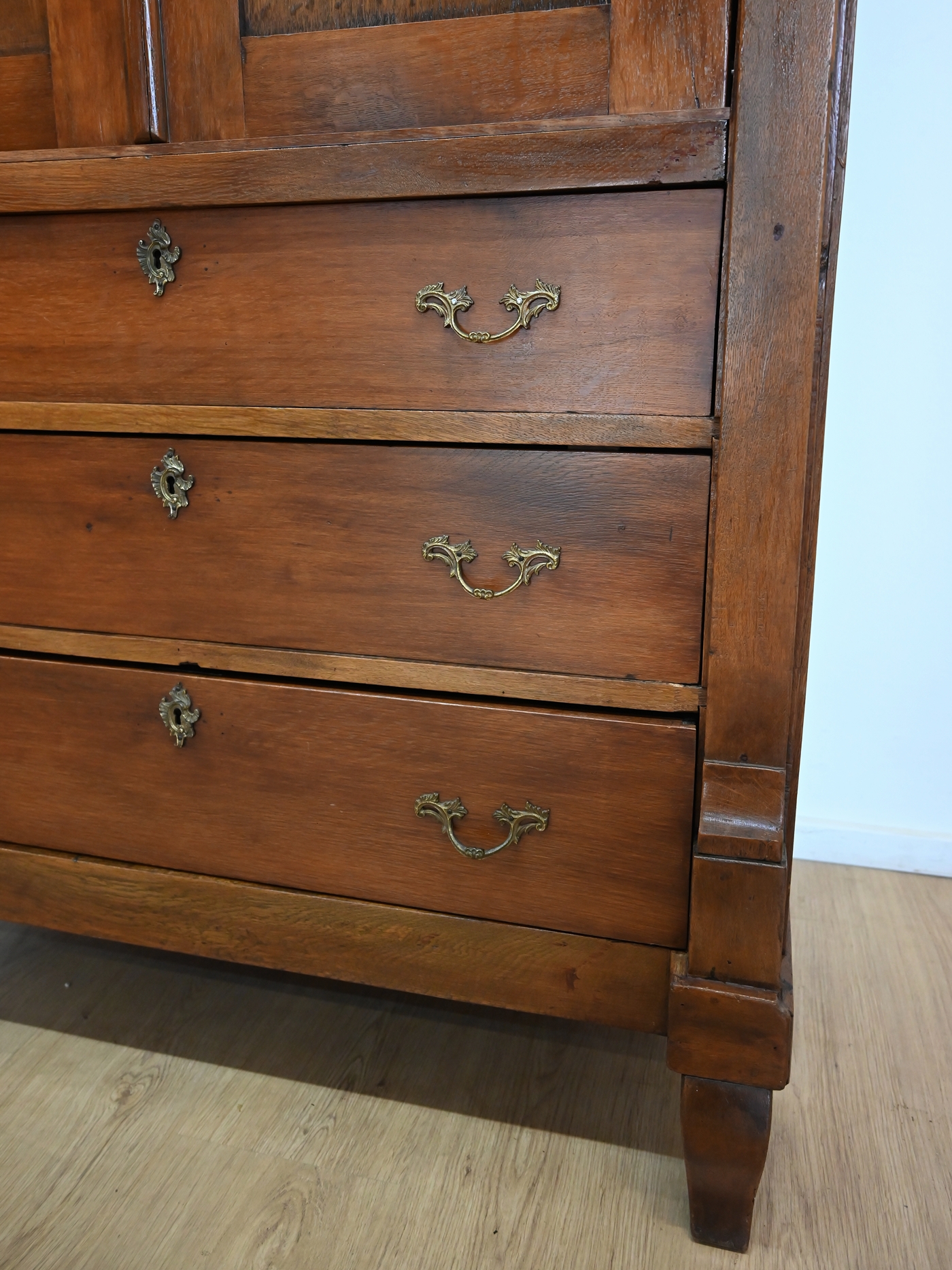 Ślady po kornikach w plecach, spodzie. Mebel zaimpregnowany preparatem przeciw kornikom. Brak aktywnego kornika.