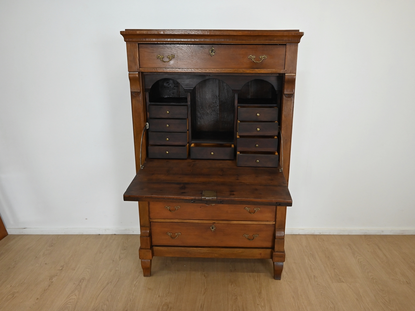 Stan dobry. Mebel przygotowany do użytkowania. Odświeżone zostały powierzchnie zewnętrzne jak i środek mebla. Mebel ma już swoje lata i ślady minionego czasu, które nie wpływają na jego odbiór estetyczny, są świadectwem autentyczności mebla. Sekreterę od razu można wstawić do mieszkania.