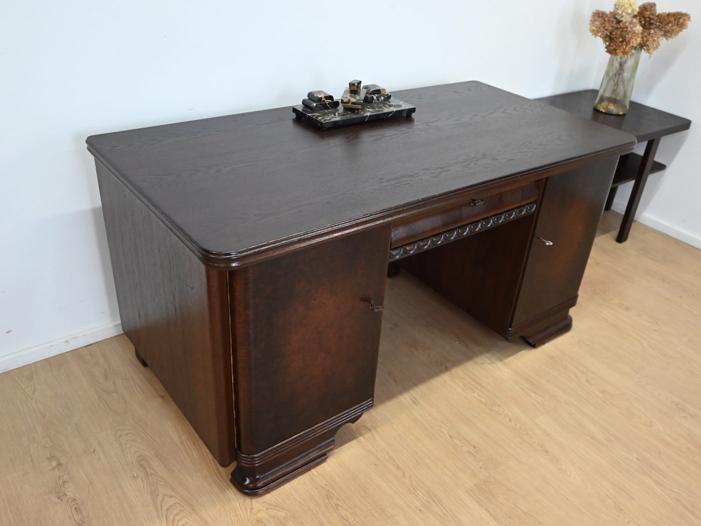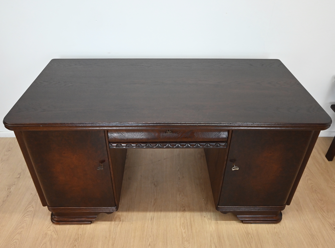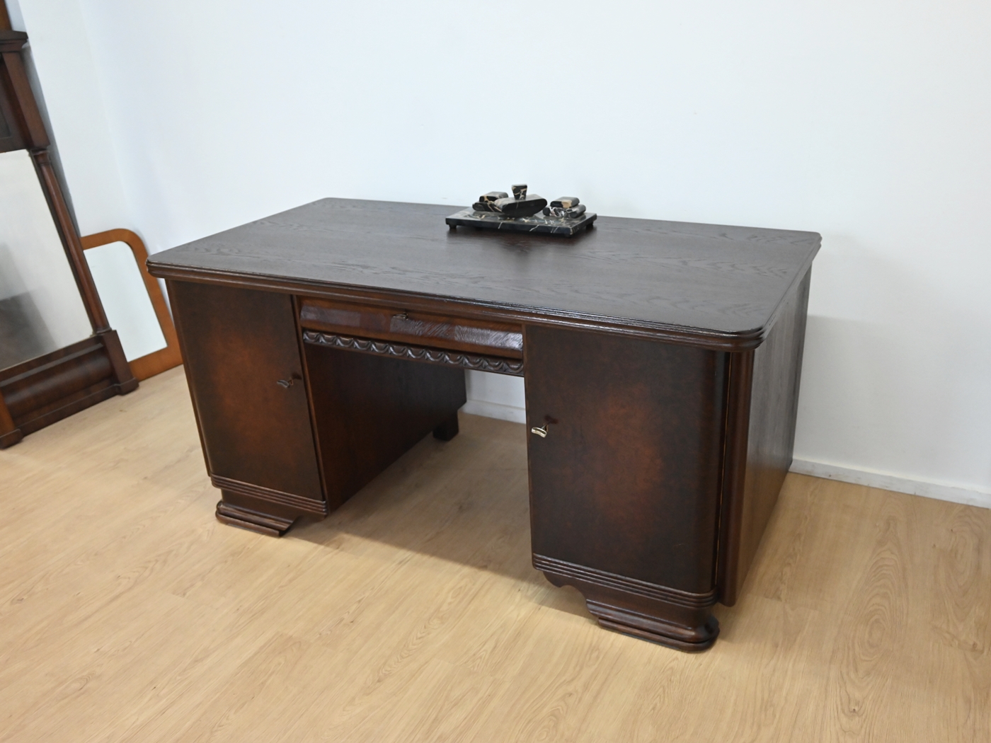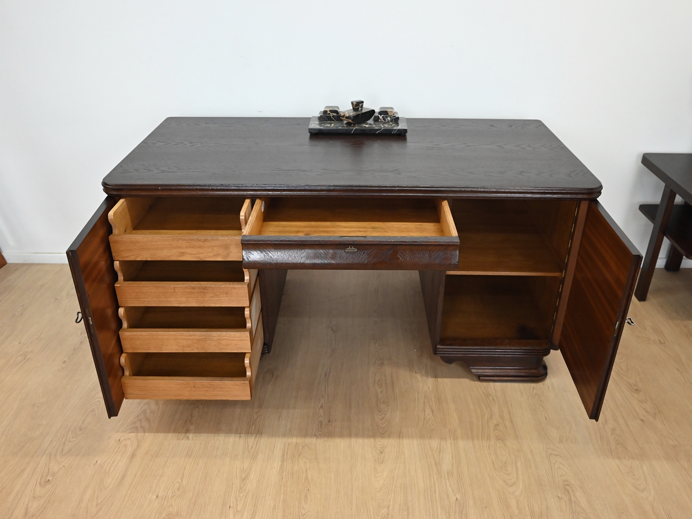 Stan bardzo dobry. Mebel przygotowany do użytkowania. Odświeżone zostały powierzchnie zewnętrzne jak i środek mebla. Mebel ma już swoje lata i ślady minionego czasu, które nie wpływają na jego odbiór estetyczny, są świadectwem autentyczności mebla. Biurko od razu można wstawić do mieszkania.
