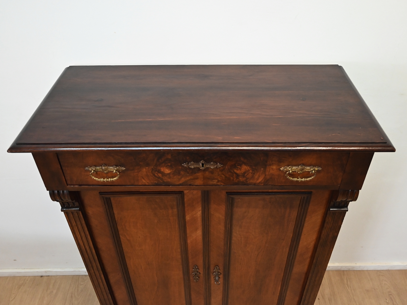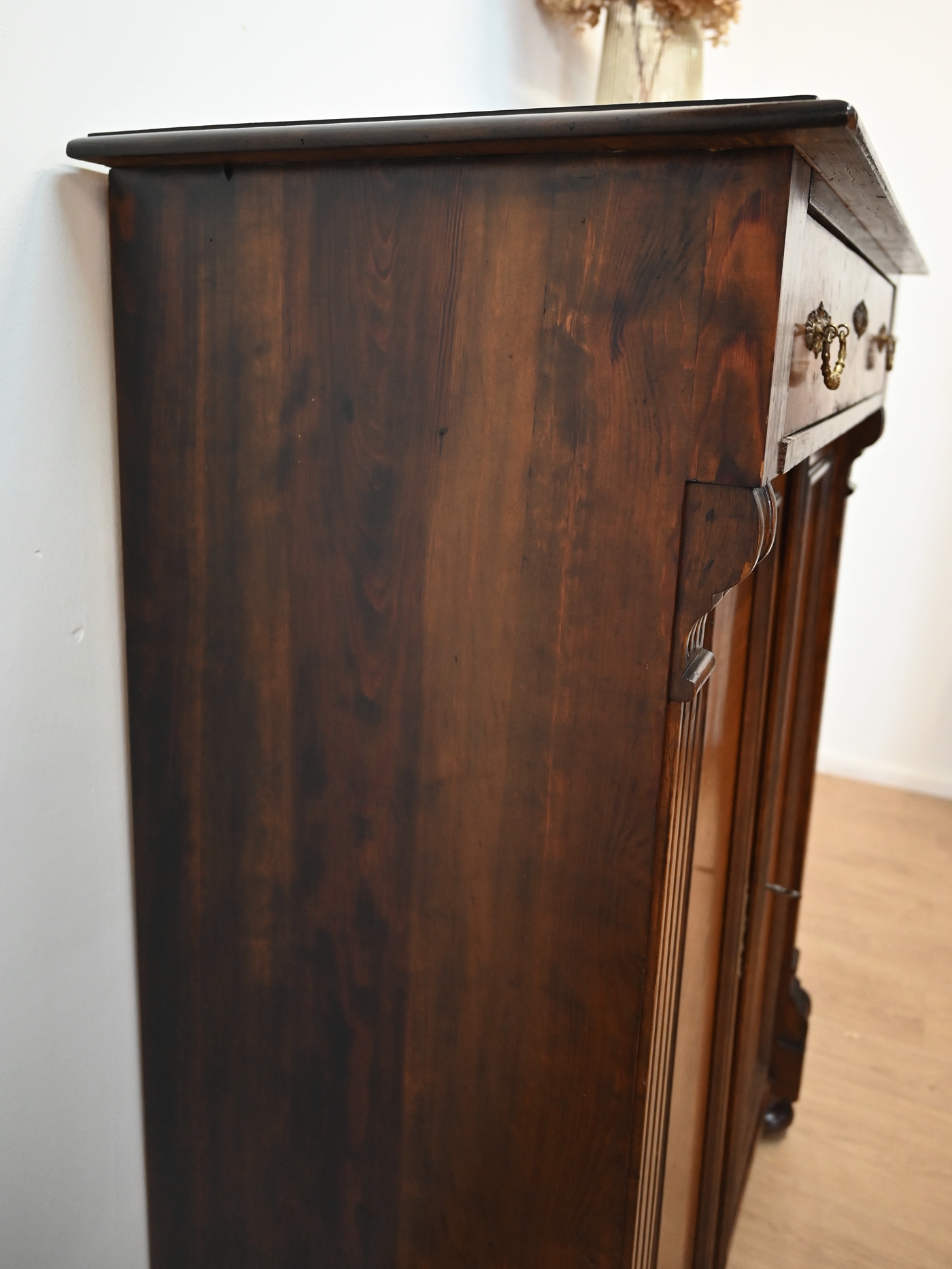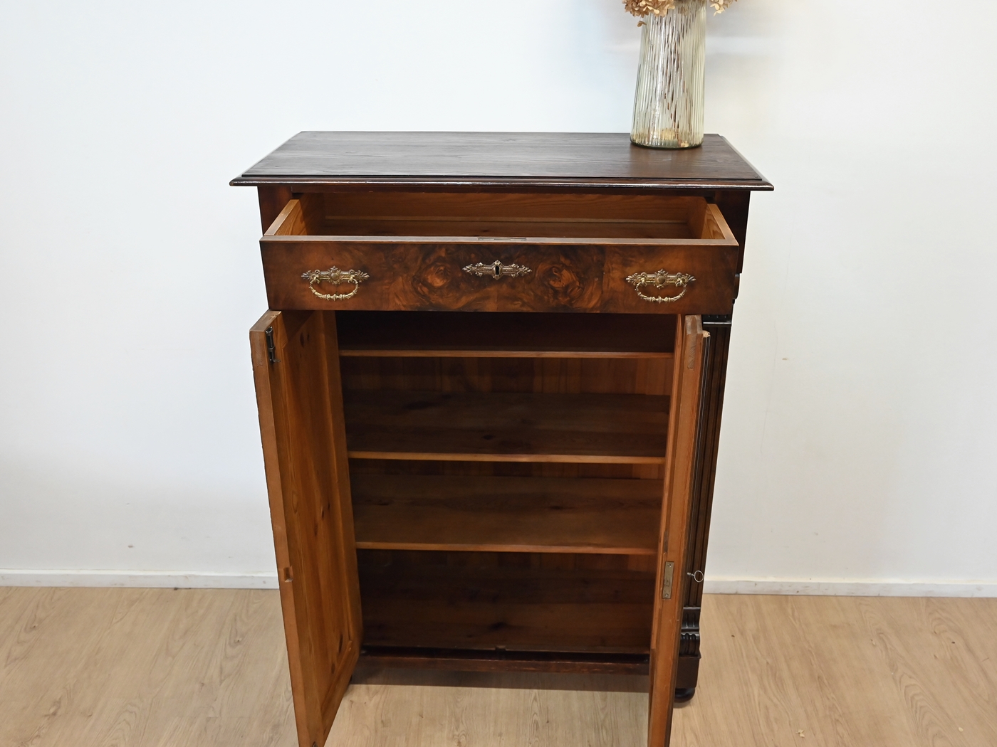 Wykonany jest w całości z drewna, sosnowy, drzwi i szuflada fornirowane orzechem.