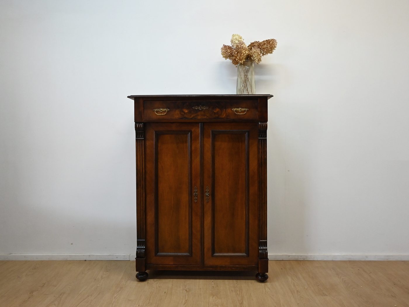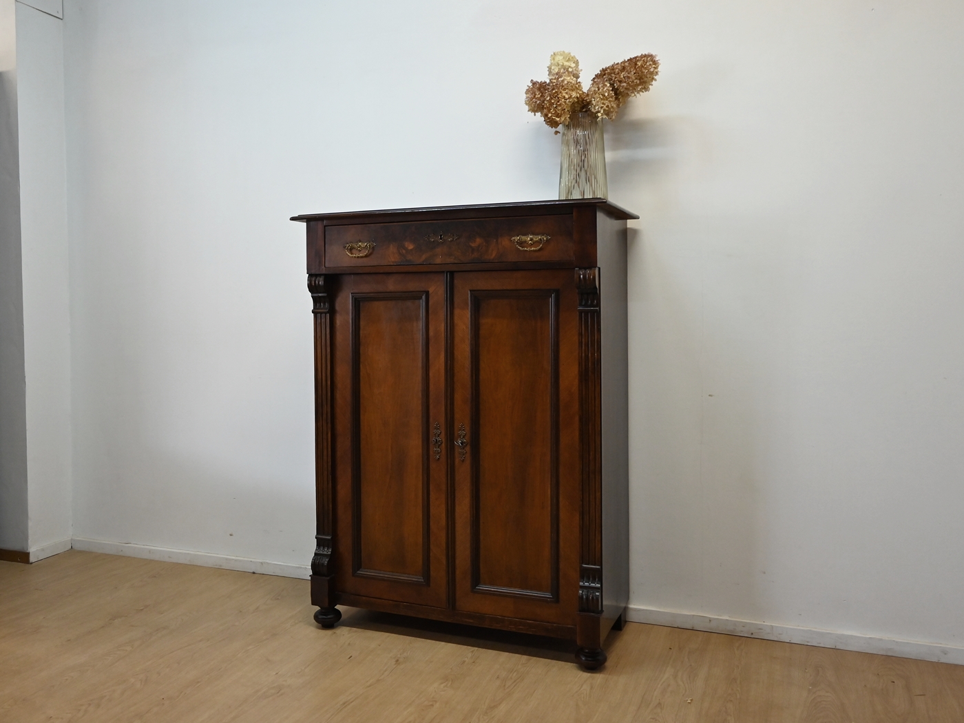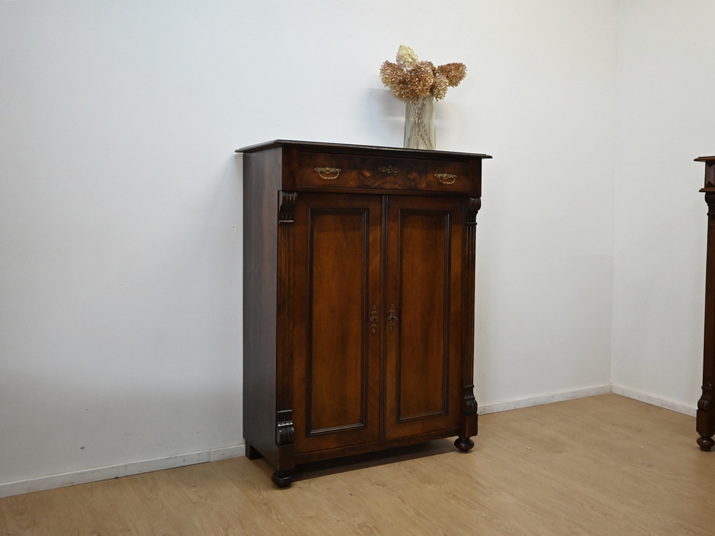 Wykonany jest w całości z drewna, sosnowy, drzwi i szuflada fornirowane orzechem.