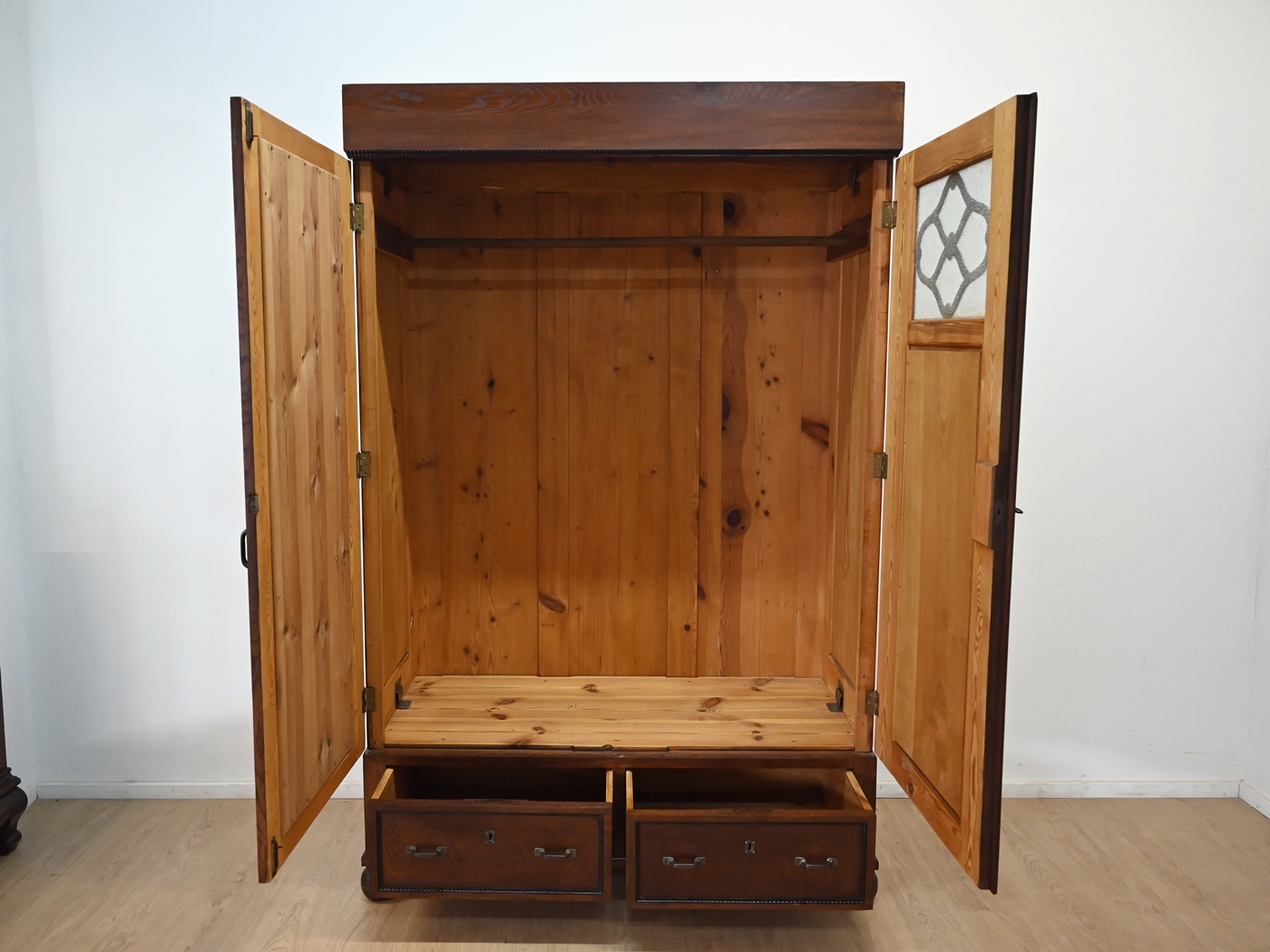 Ślady po kornikach, małe ilości w plecach, spodzie. Mebel zaimpregnowany preparatem przeciw kornikom. Brak aktywnego kornika.