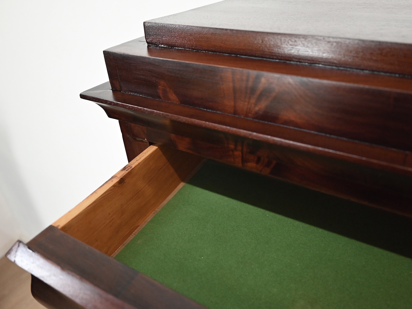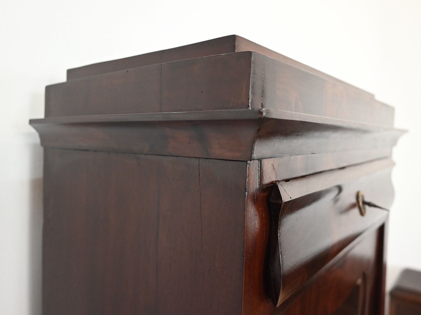 Wykonany jest w całości z drewna, fornirowany mahoniem.