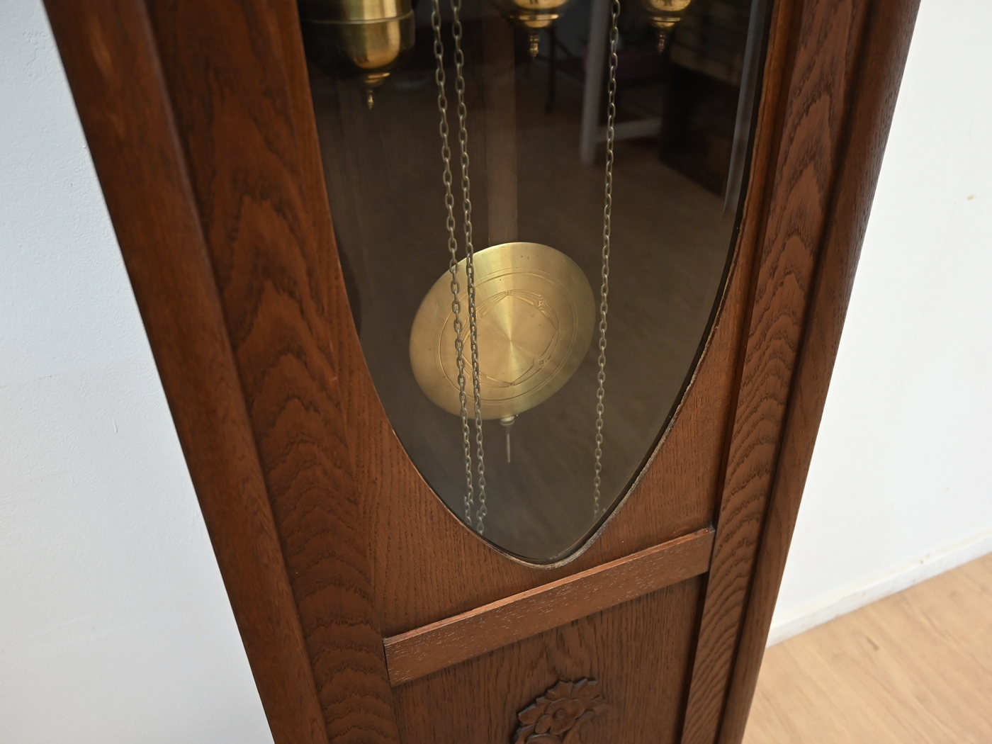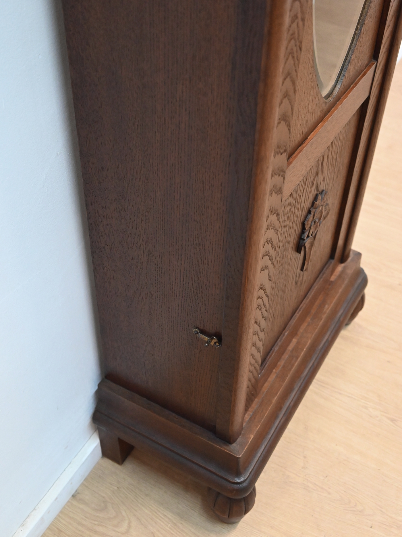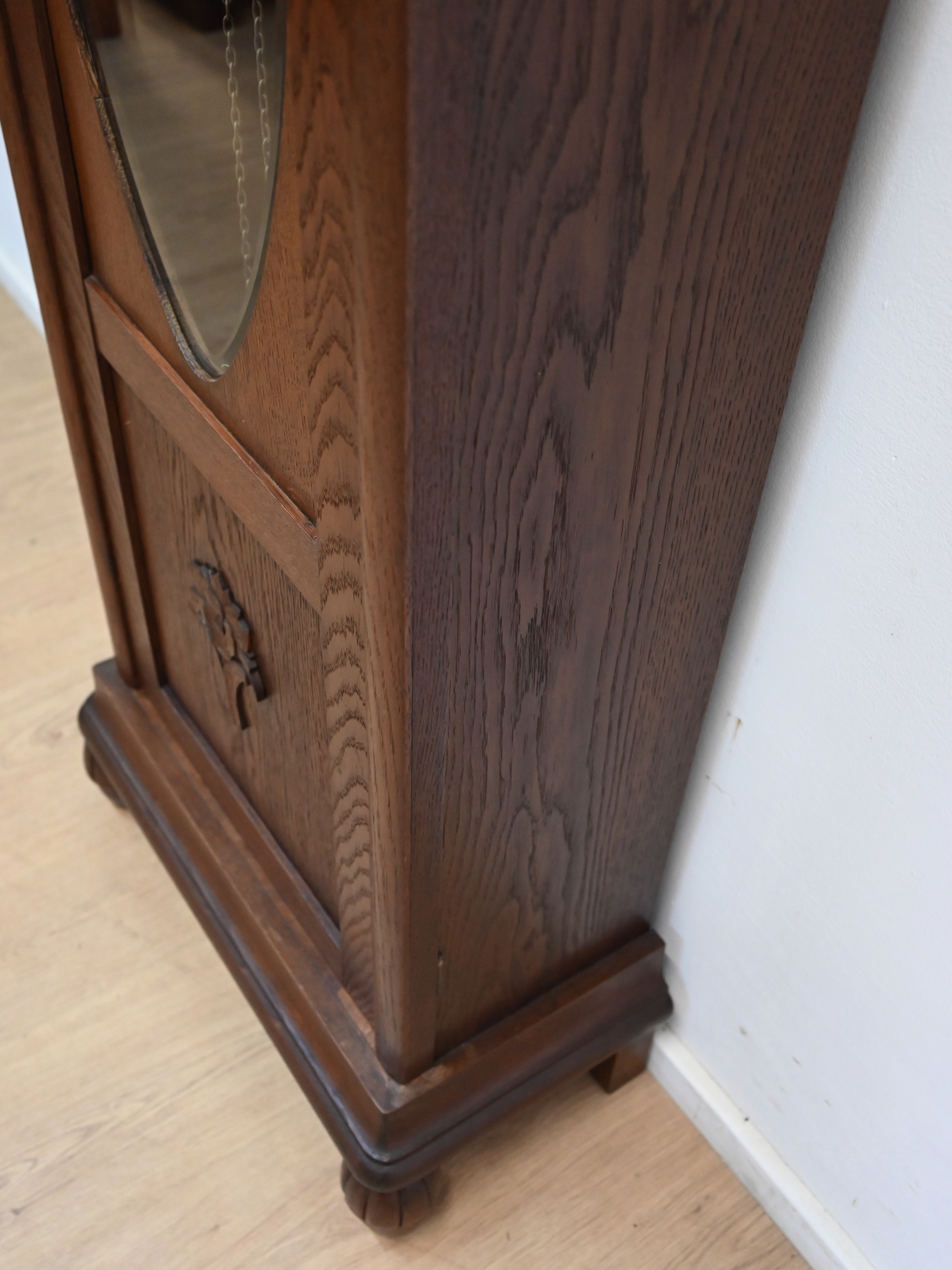 Stan bardzo dobry. Mebel przygotowany do użytkowania. Odświeżone zostały powierzchnie zewnętrzne jak i środek mebla. Mebel ma już swoje lata i ślady minionego czasu, które nie wpływają na jego odbiór estetyczny, są świadectwem autentyczności mebla. Zegar od razu można wstawić do mieszkania.
