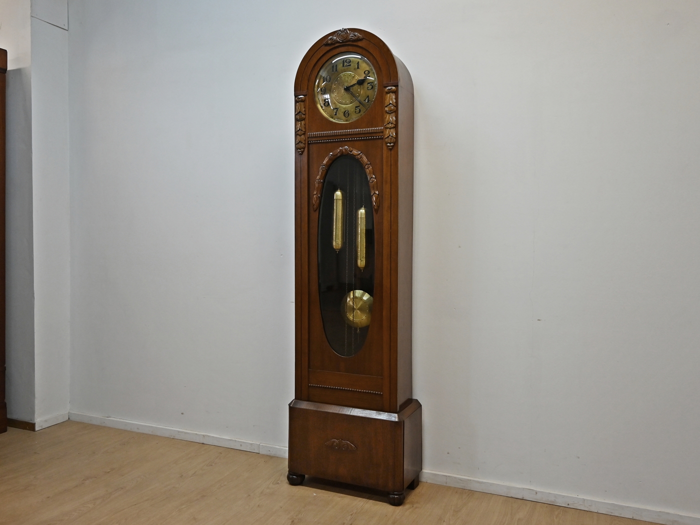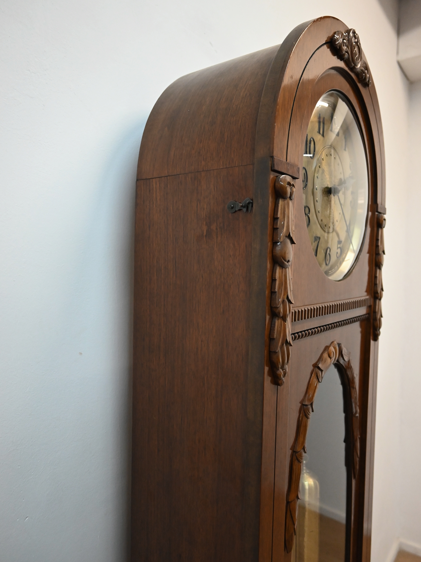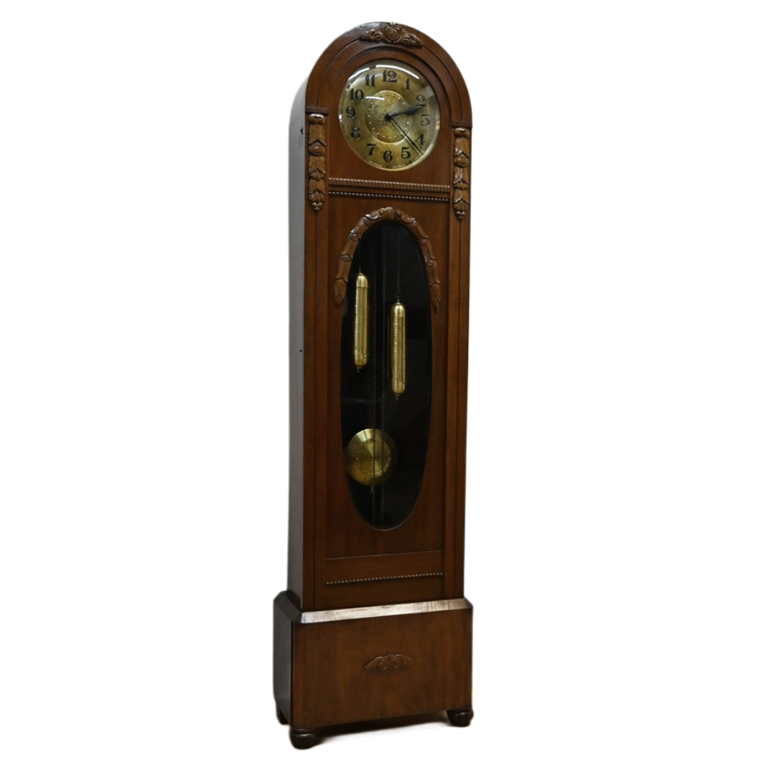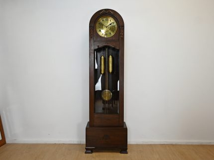 Mechanizm sprawny. Pięknie wybija godziny i połówki. Szyba fazowana. Szybka na tarczy wypukła. Średnica tarczy 30cm. Ze względu na delikatność mechanizmu preferowany odbiór własny lub nasz transport. Nie dajemy gwarancji na mechanizm.