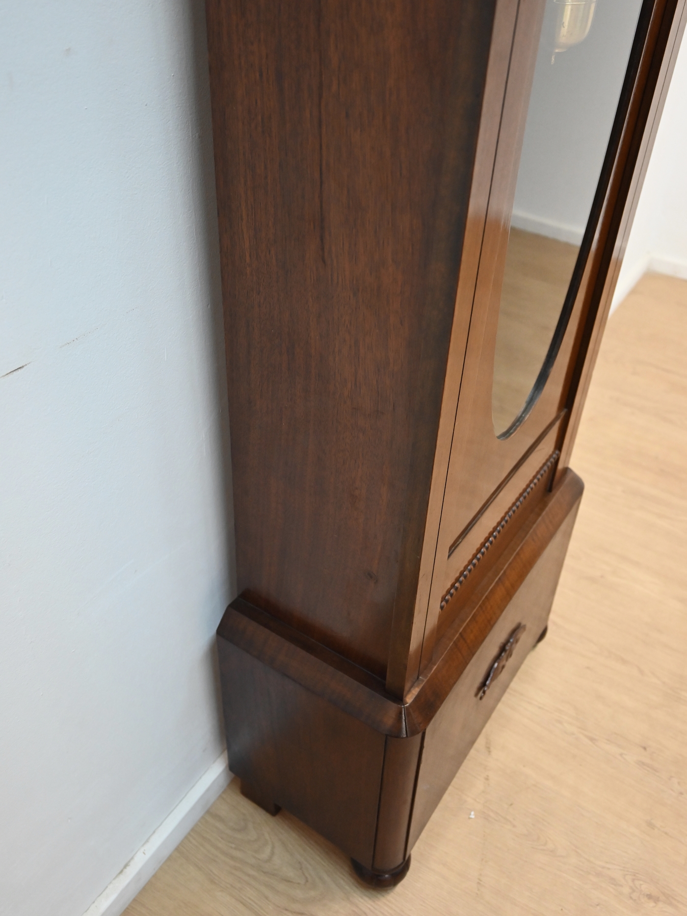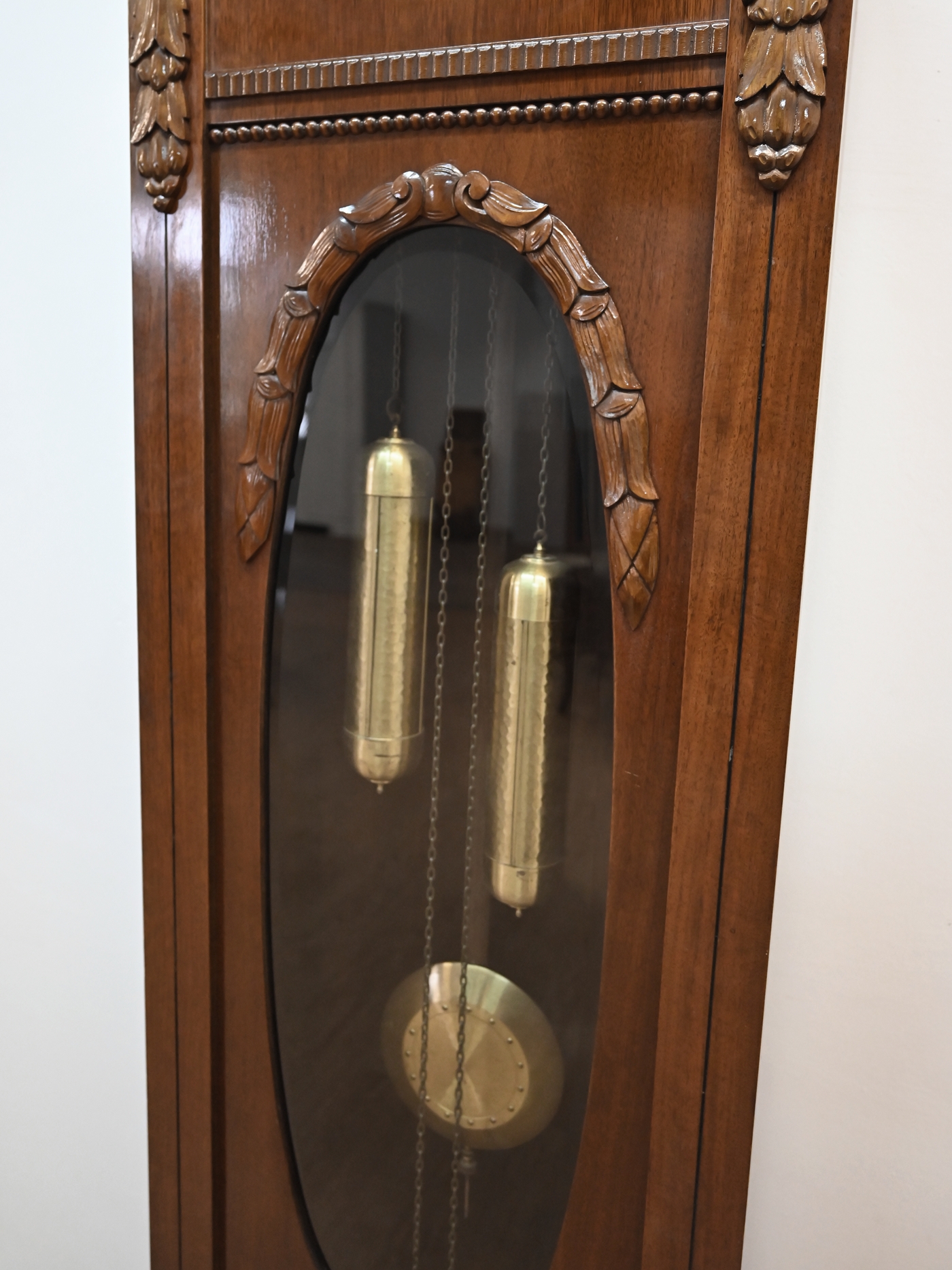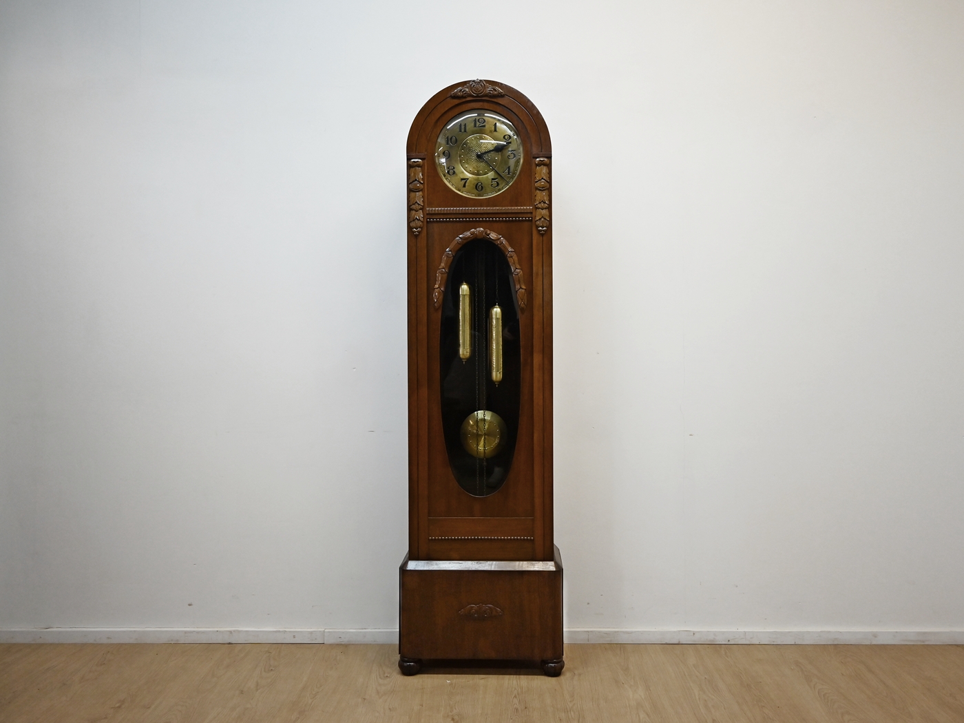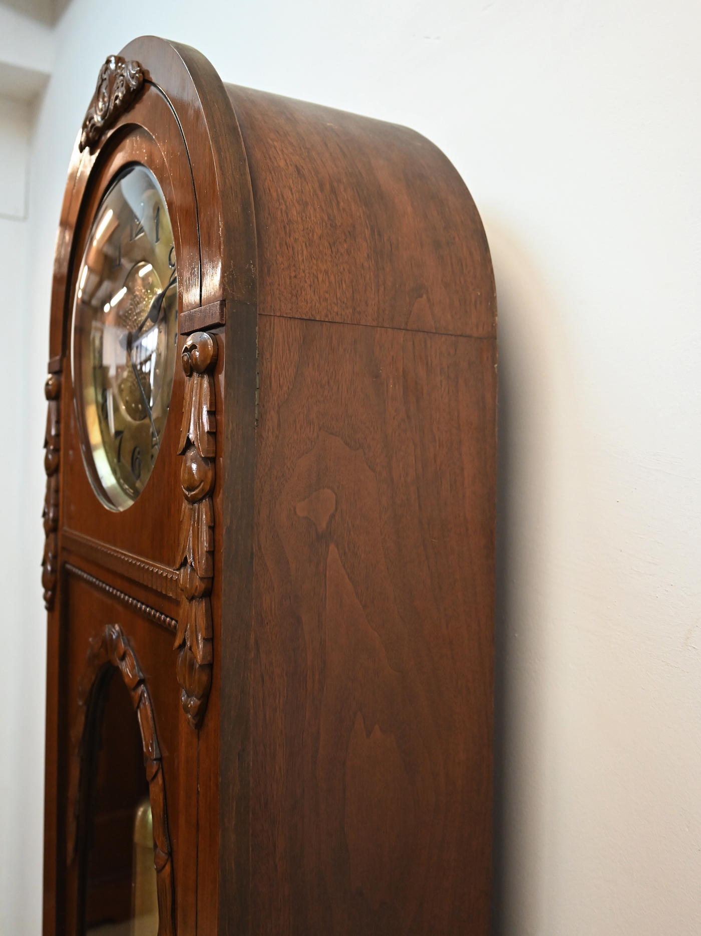 Mechanizm sprawny. Pięknie wybija godziny i połówki. Szyba fazowana. Szybka na tarczy wypukła. Średnica tarczy 30cm. Ze względu na delikatność mechanizmu preferowany odbiór własny lub nasz transport. Nie dajemy gwarancji na mechanizm.